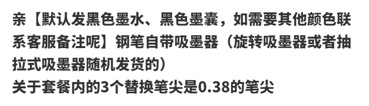 | 钢笔+3个笔尖+墨水+30墨囊+礼盒 | ¥2546 | 1000件可售 |