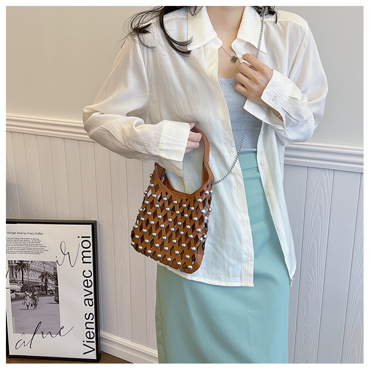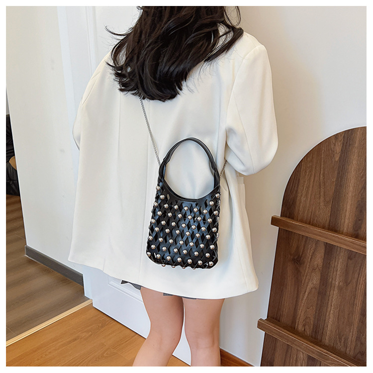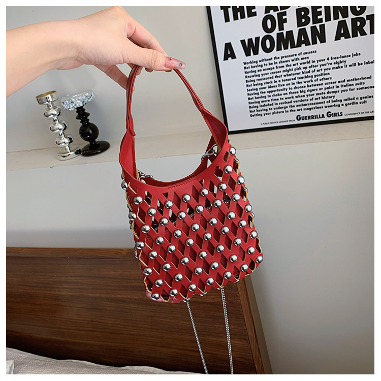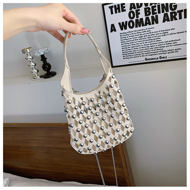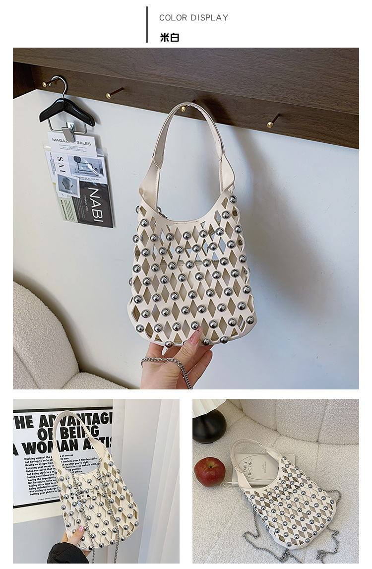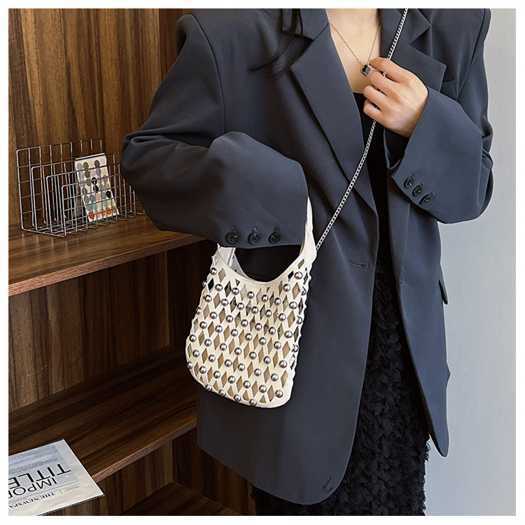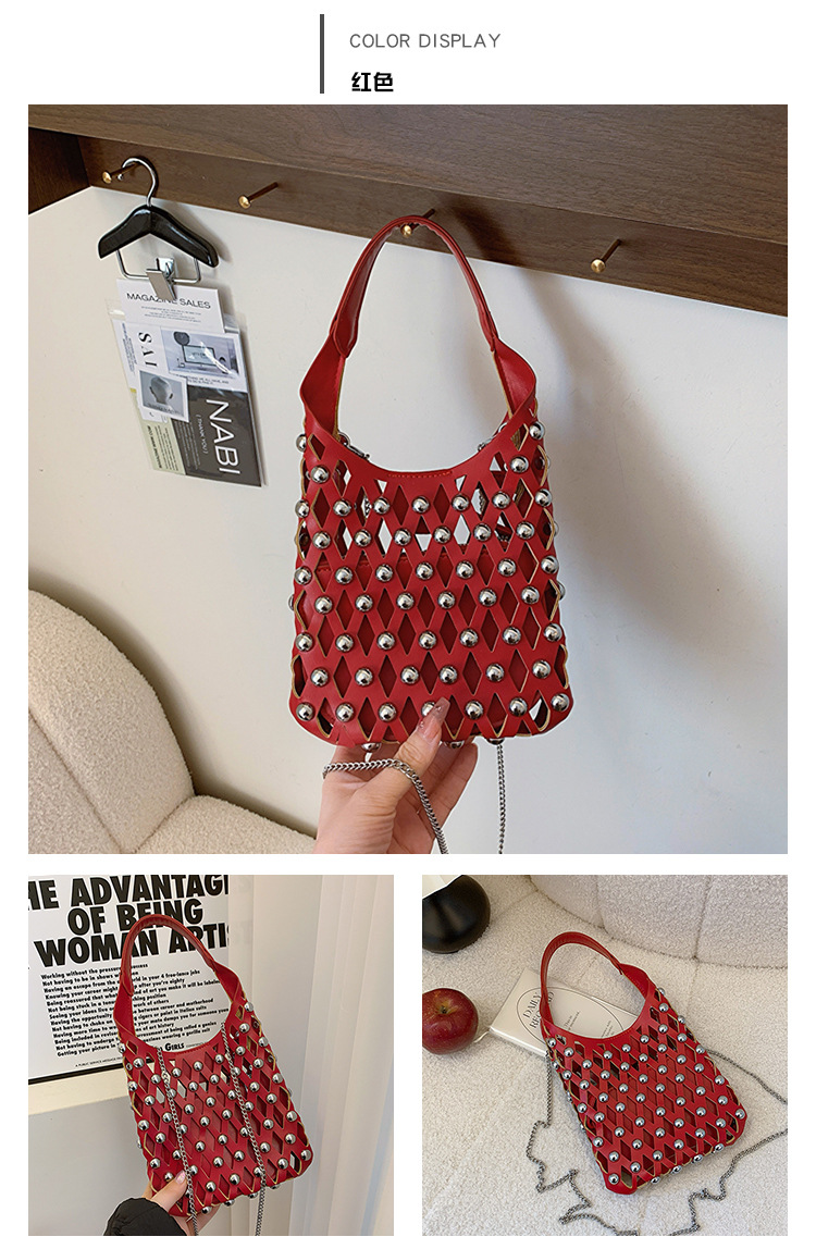 2024夏新款镂空菱格手提包朋克风圆铆钉镶嵌子母套包链条斜挎包女