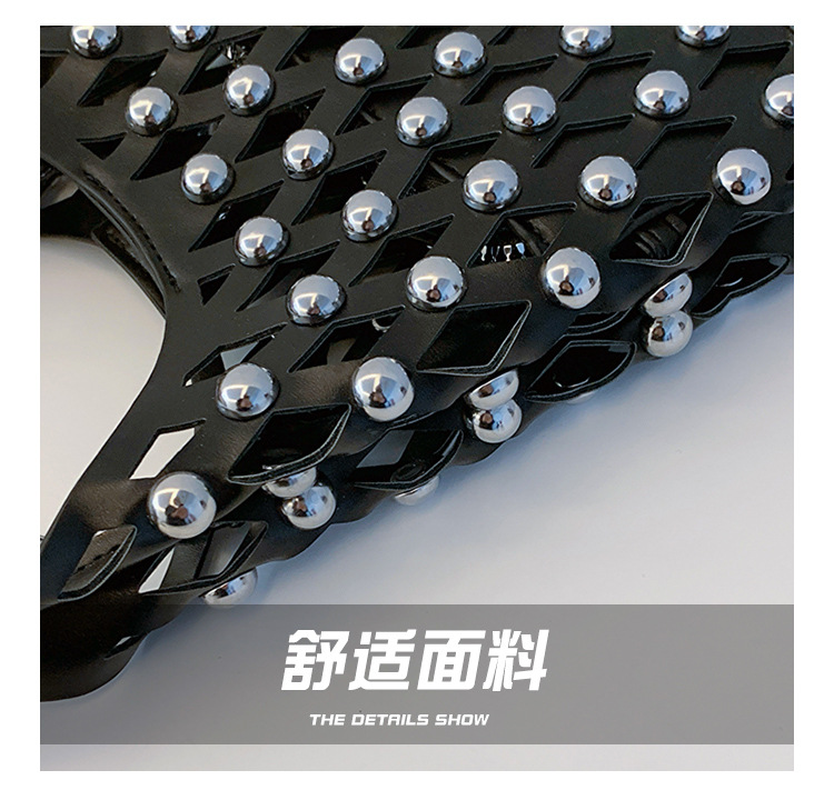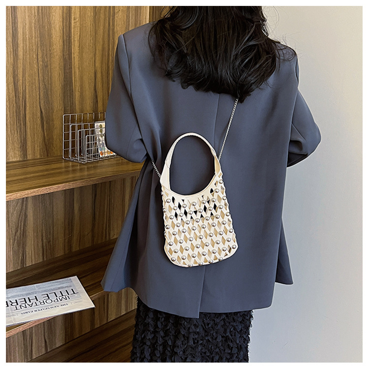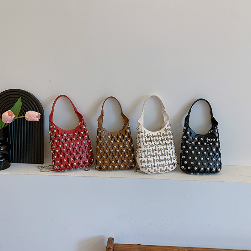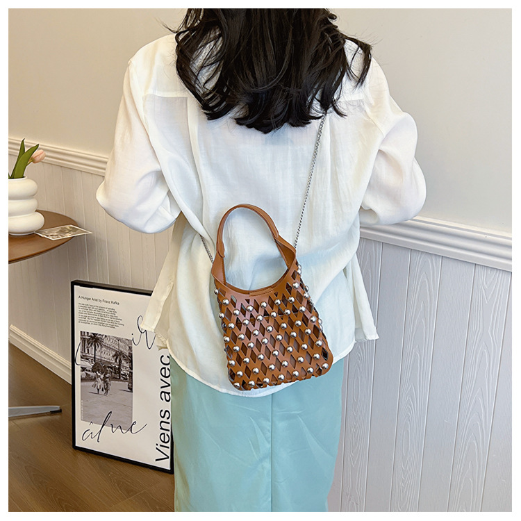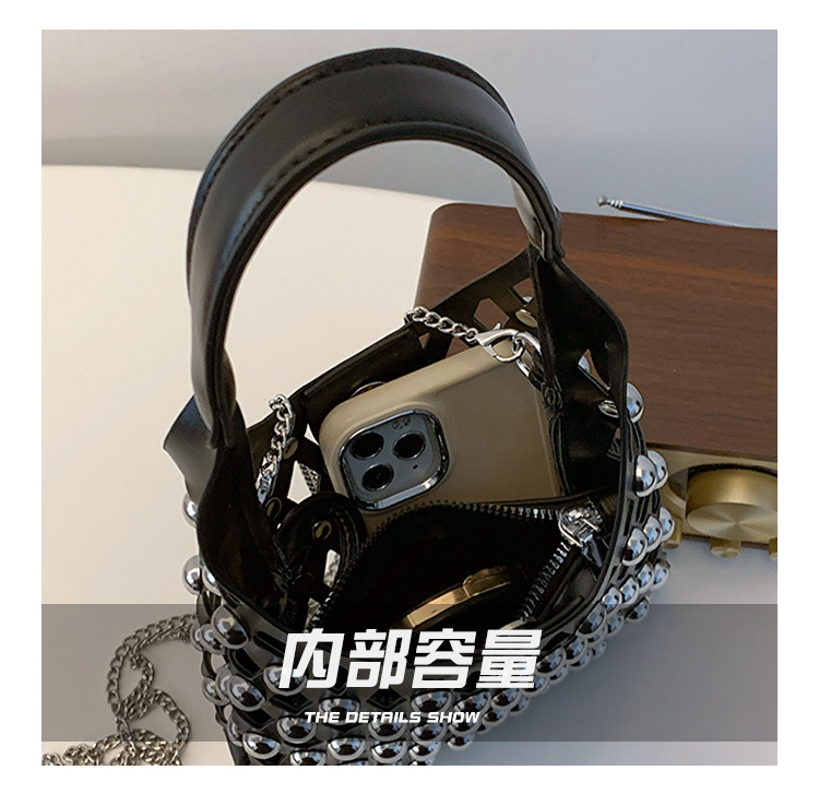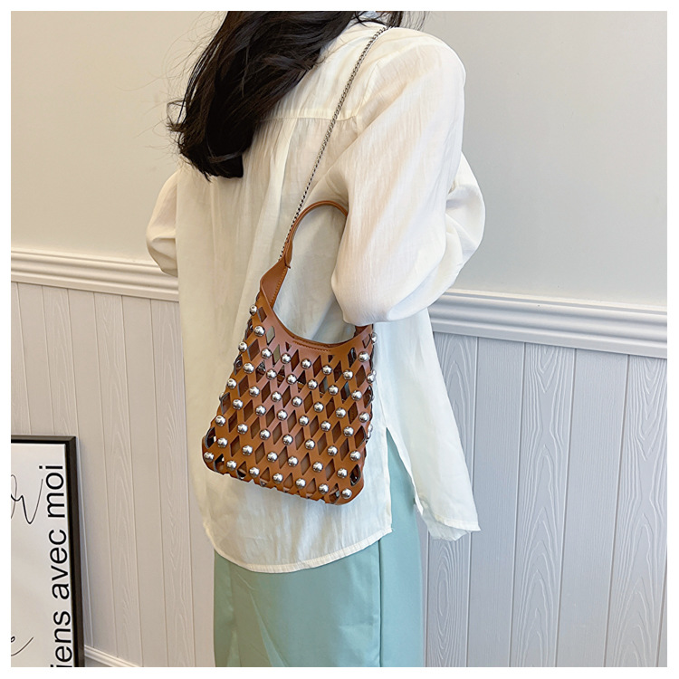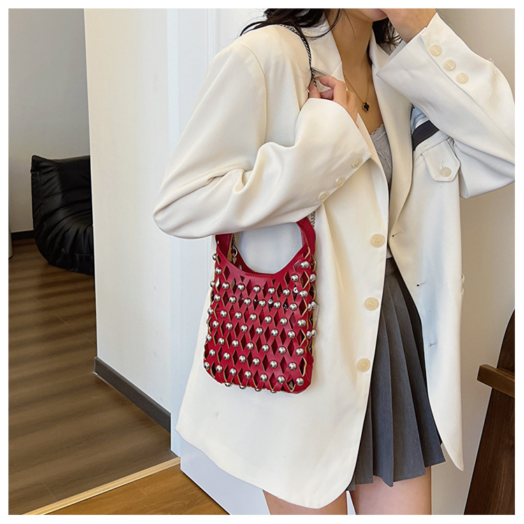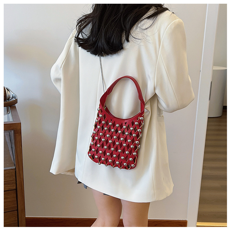 2024夏新款镂空菱格手提包朋克风圆铆钉镶嵌子母套包链条斜挎包女
