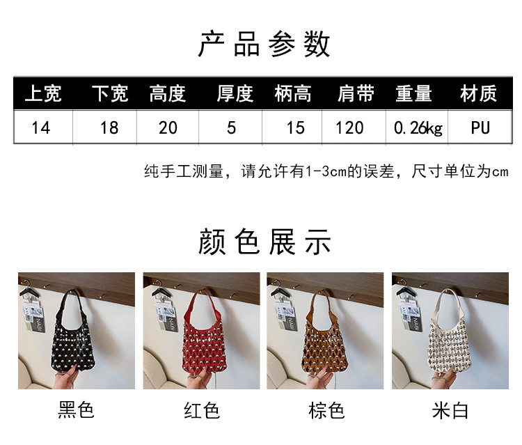 颜色: 白色,黑色,浅棕色,红色 风格: 跨境风潮 货号: 新款朋克圆柳钉 材质: PU 箱包潮流款式: 子母包 箱包大小: 中 流行元素: 镂空,铆钉,菱格 上市年份季节: 2024年夏季 里料质地: 无里布 箱包形状: 竖款方型 重量: 0.5 kg/件 装箱信息:长宽高:10X10X10cm 装箱重量: 1KG 装箱数量:5pcs