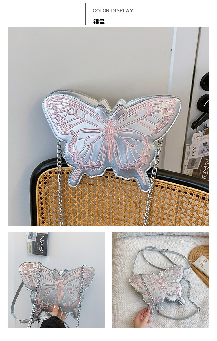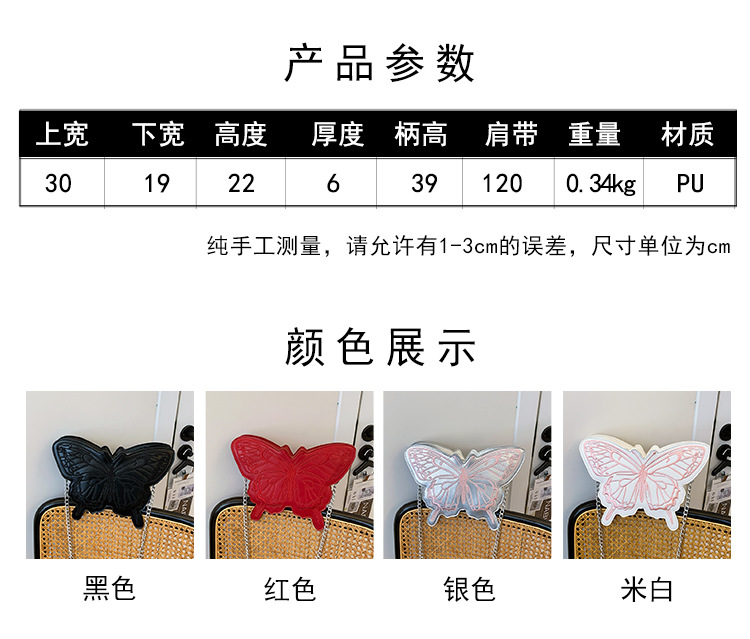 颜色: 银色,白色,红色,黑色 风格: 清新甜美 货号: 新款刺绣蝴蝶 材质: PU 箱包潮流款式: 异型包 箱包大小: 中 流行元素: 其他 上市年份季节: 2024年春季 里料质地: 涤纶 箱包形状: 蝴蝶形 重量: 0.5 kg/件 装箱信息:长宽高:10X10X10cm 装箱重量: 1KG 装箱数量:5pcs