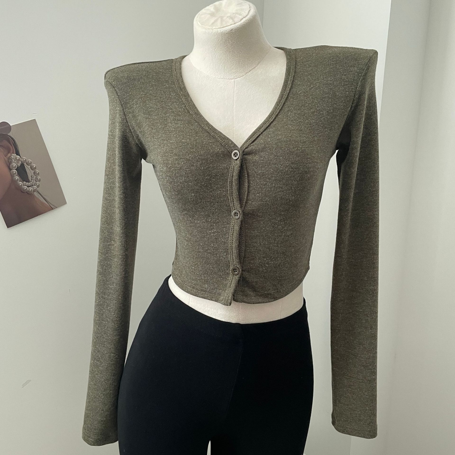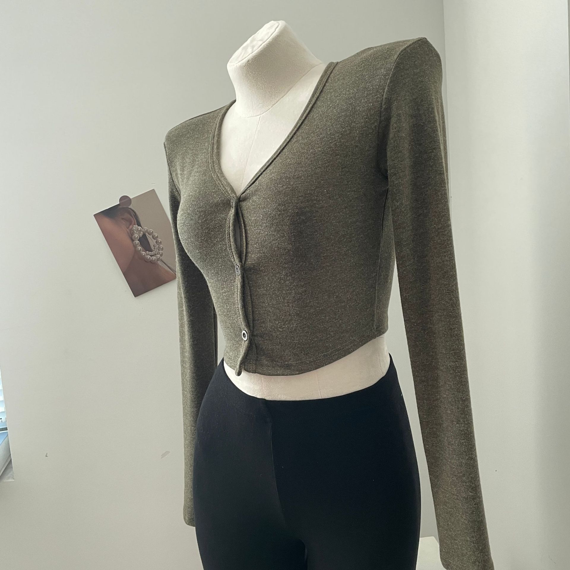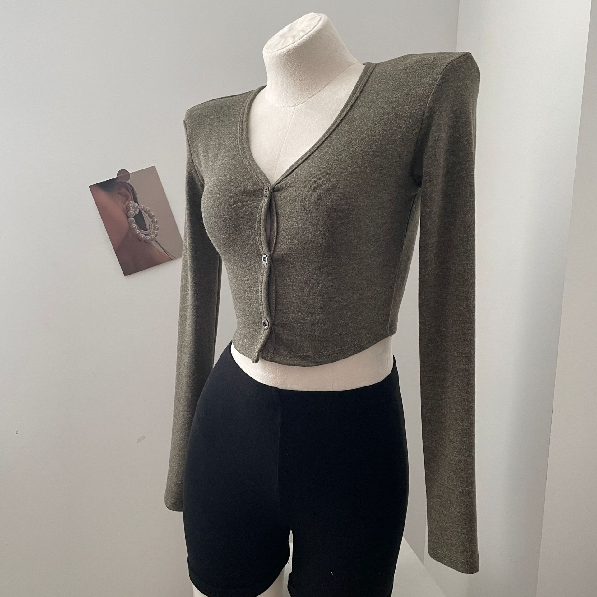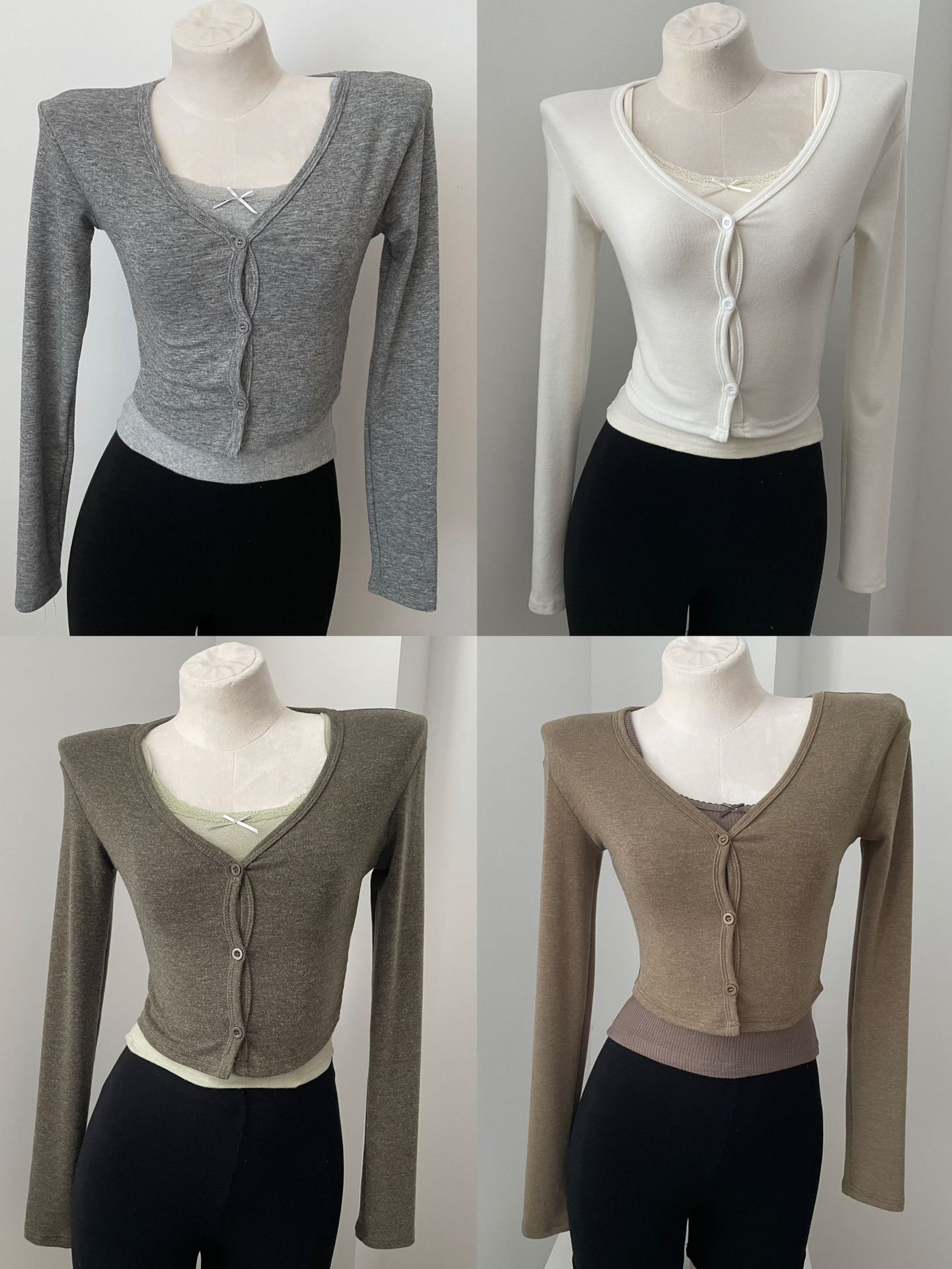 货号: 1262 面料名称: 针织 主面料成分: 涤纶(聚酯纤维) 图案: 纯色 款式: 开衫 袖型: 常规袖 上市年份/季节: 2024年秋季 领型: V字领 袖长: 长袖 颜色: 灰色,白色,苔藓绿,棕色 重量: 0.5 kg/件