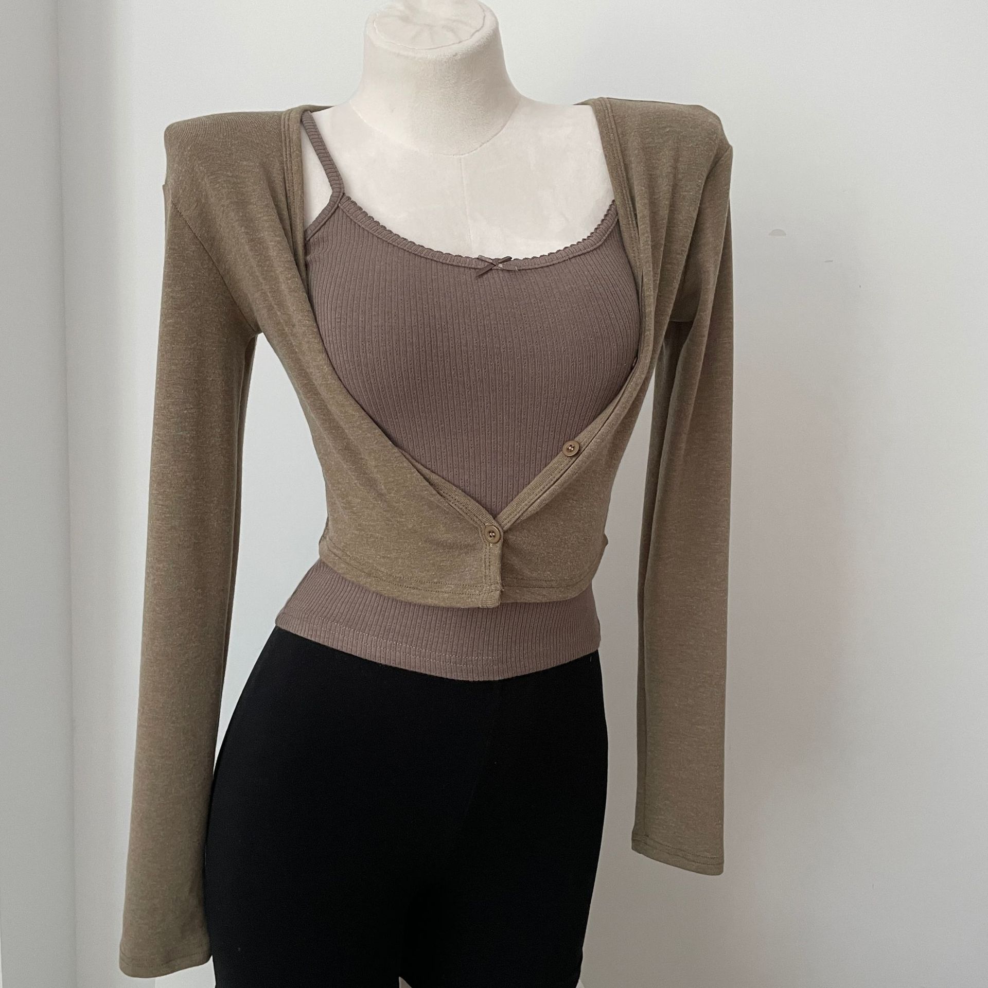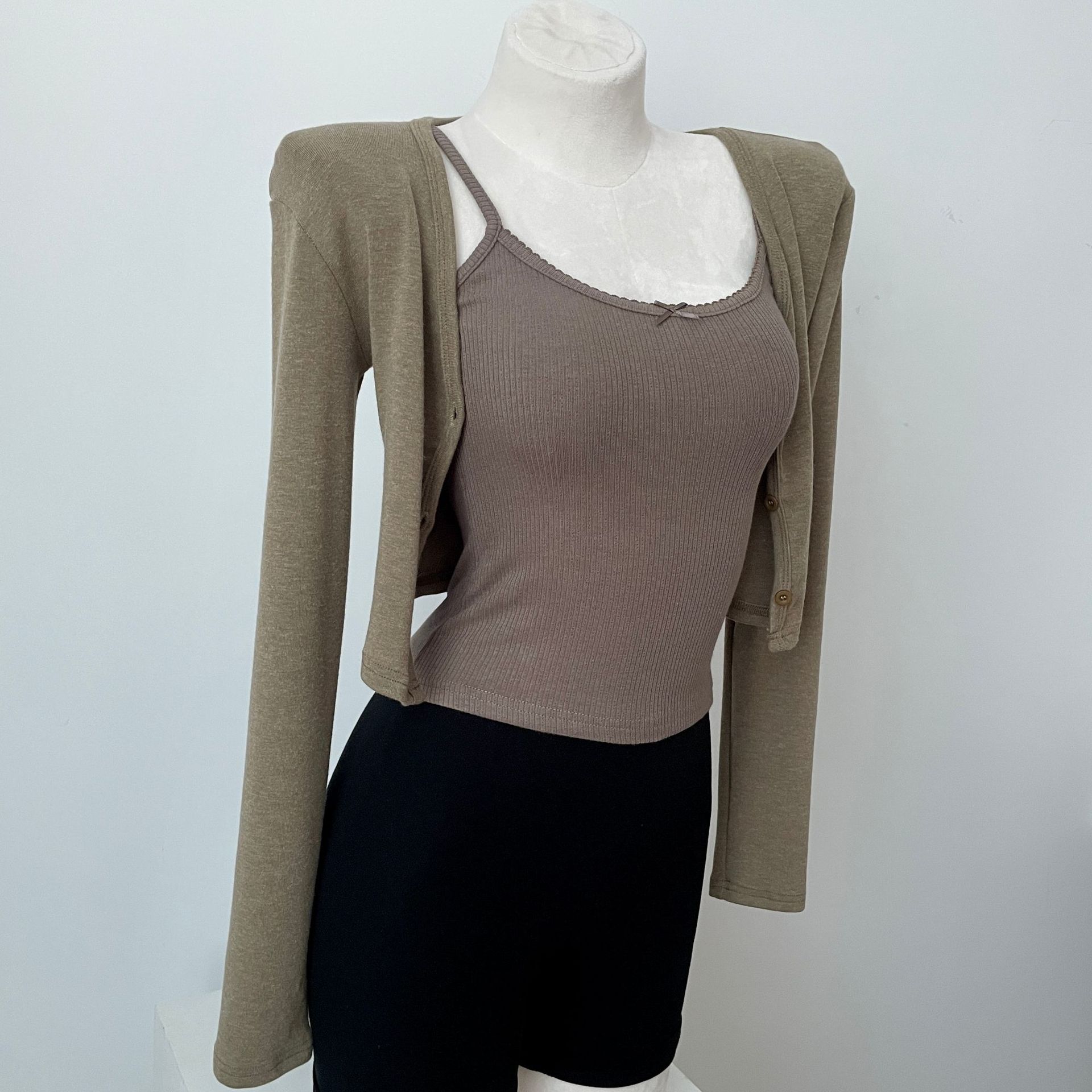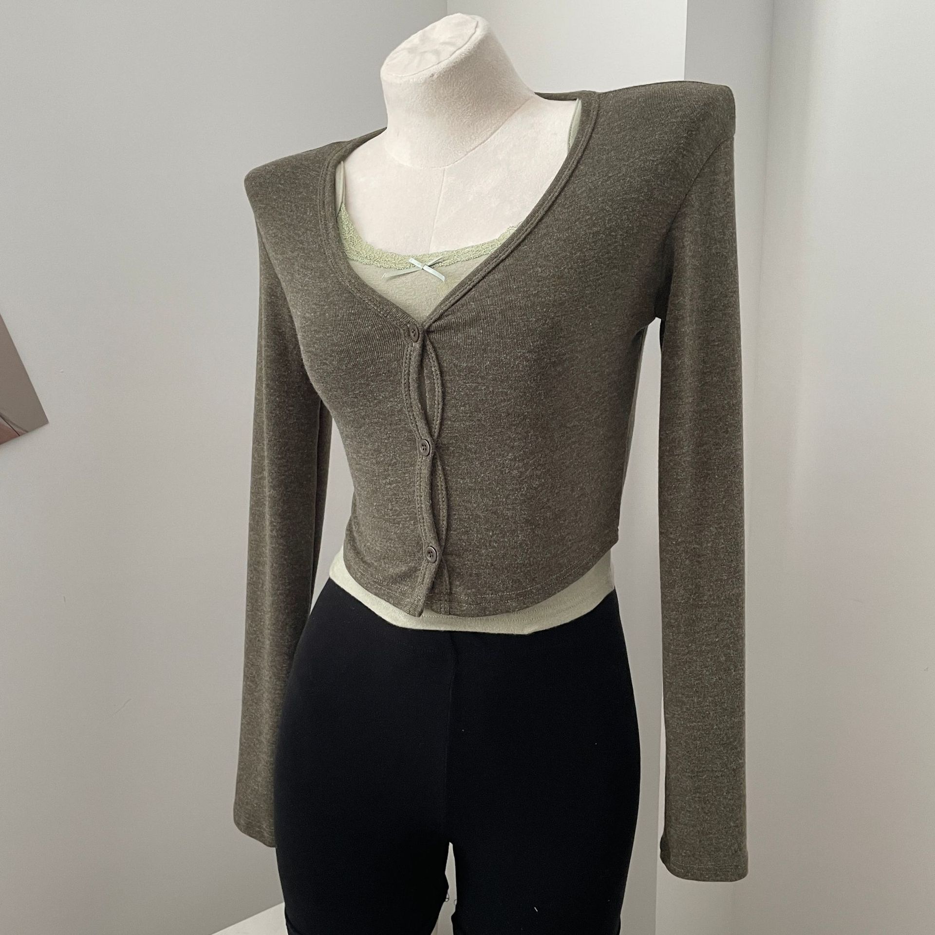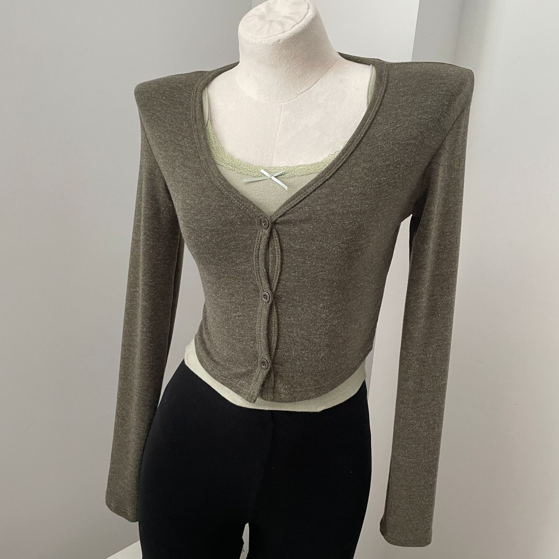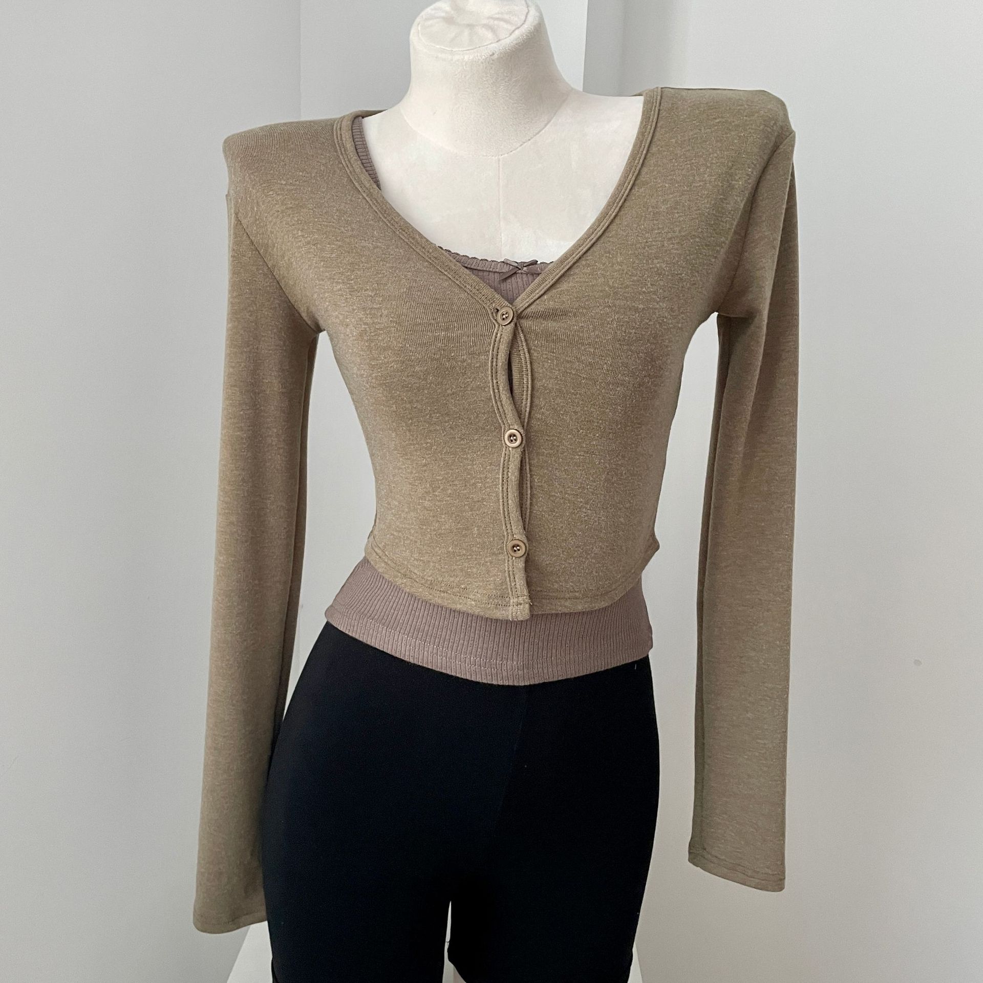 货号: 1262 面料名称: 针织 主面料成分: 涤纶(聚酯纤维) 图案: 纯色 款式: 开衫 袖型: 常规袖 上市年份/季节: 2024年秋季 领型: V字领 袖长: 长袖 颜色: 灰色,白色,苔藓绿,棕色 重量: 0.5 kg/件