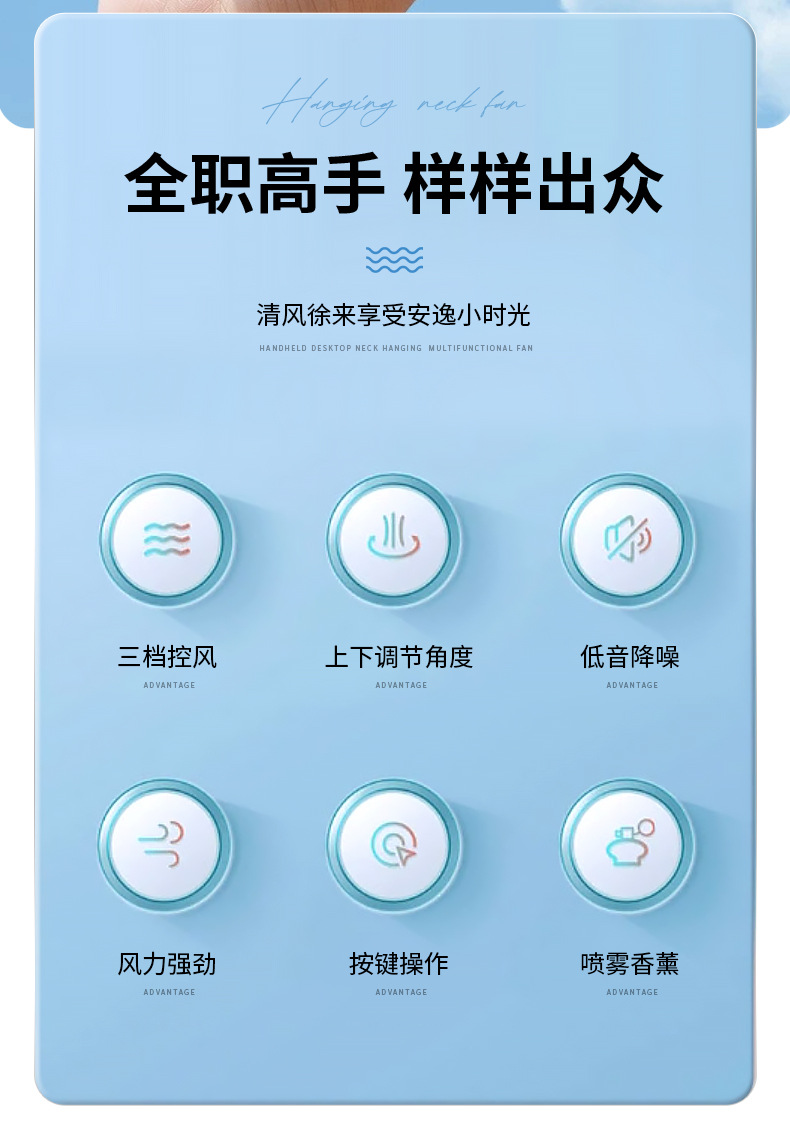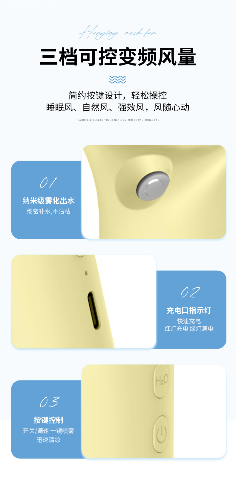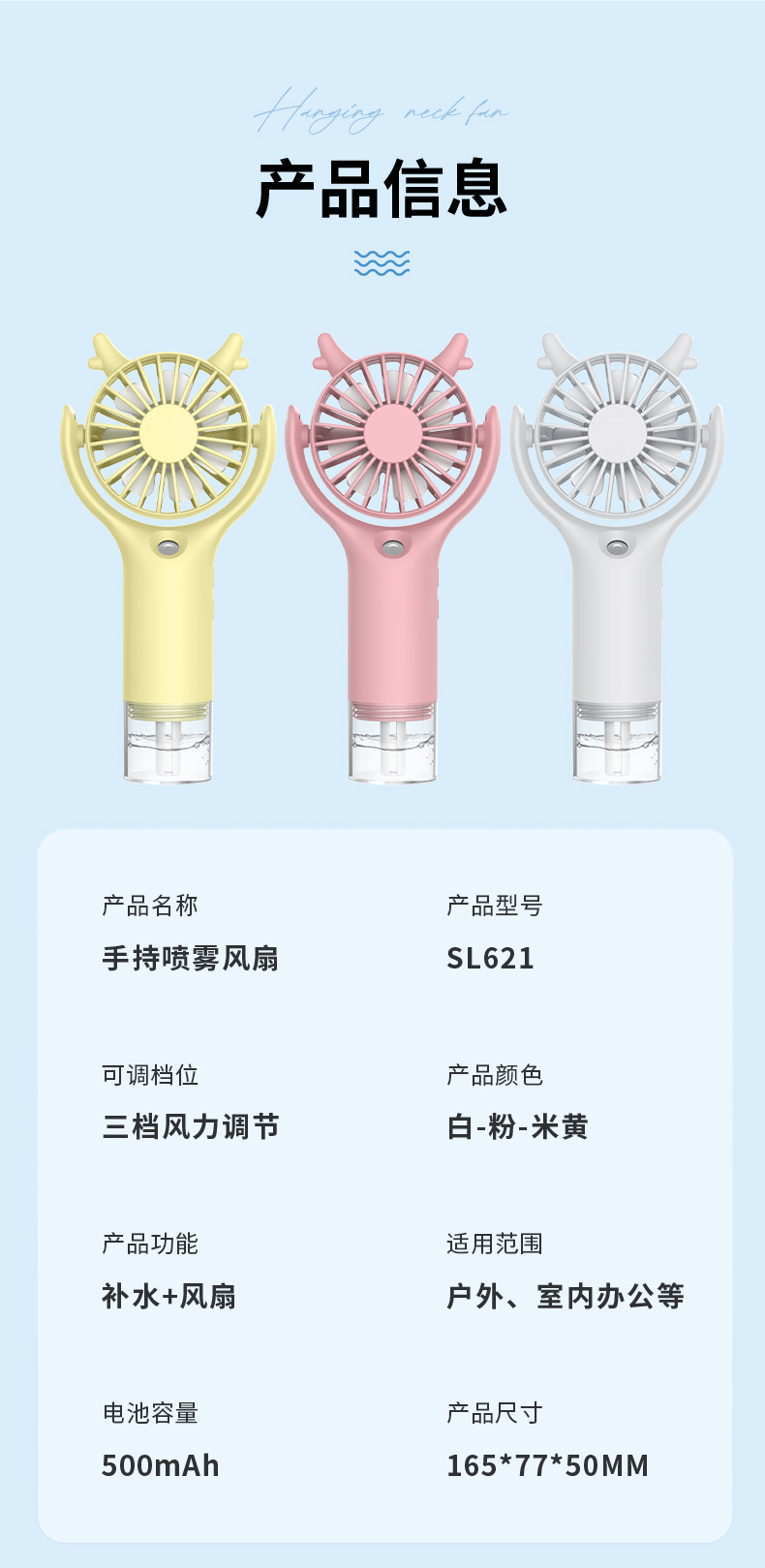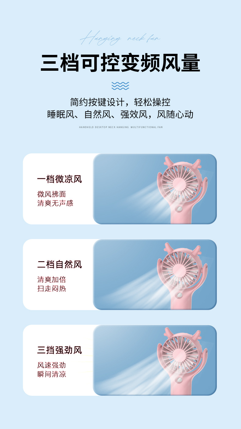 产品买点:手持式,3档风速,喷雾风扇