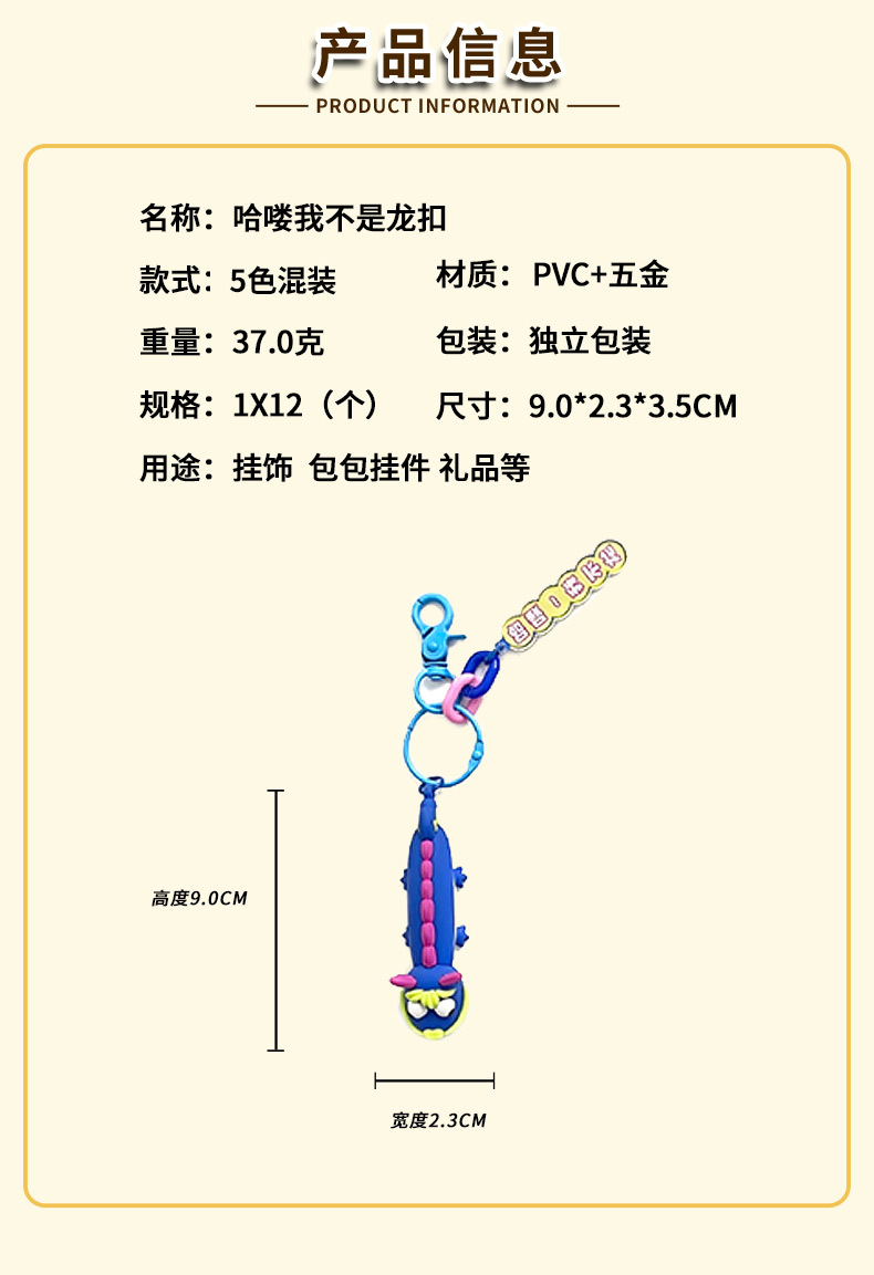 货号: 6466000014555 钥匙配饰分类: 钥匙扣 包装: 独立包装 材质: 橡胶 适用送礼场合: 满月,旅游纪念,毕业,乔迁,派对聚会,其 是否专利货源: 否 颜色: 哈喽我不龙 规格: OPP袋包装 适用送礼关系: 晚辈,情侣,夫妻,同事,朋友,孩子,同学 送礼用途: 商务礼品,广告礼品,促销赠品,会议礼品, 重量: 0.024 kg/件