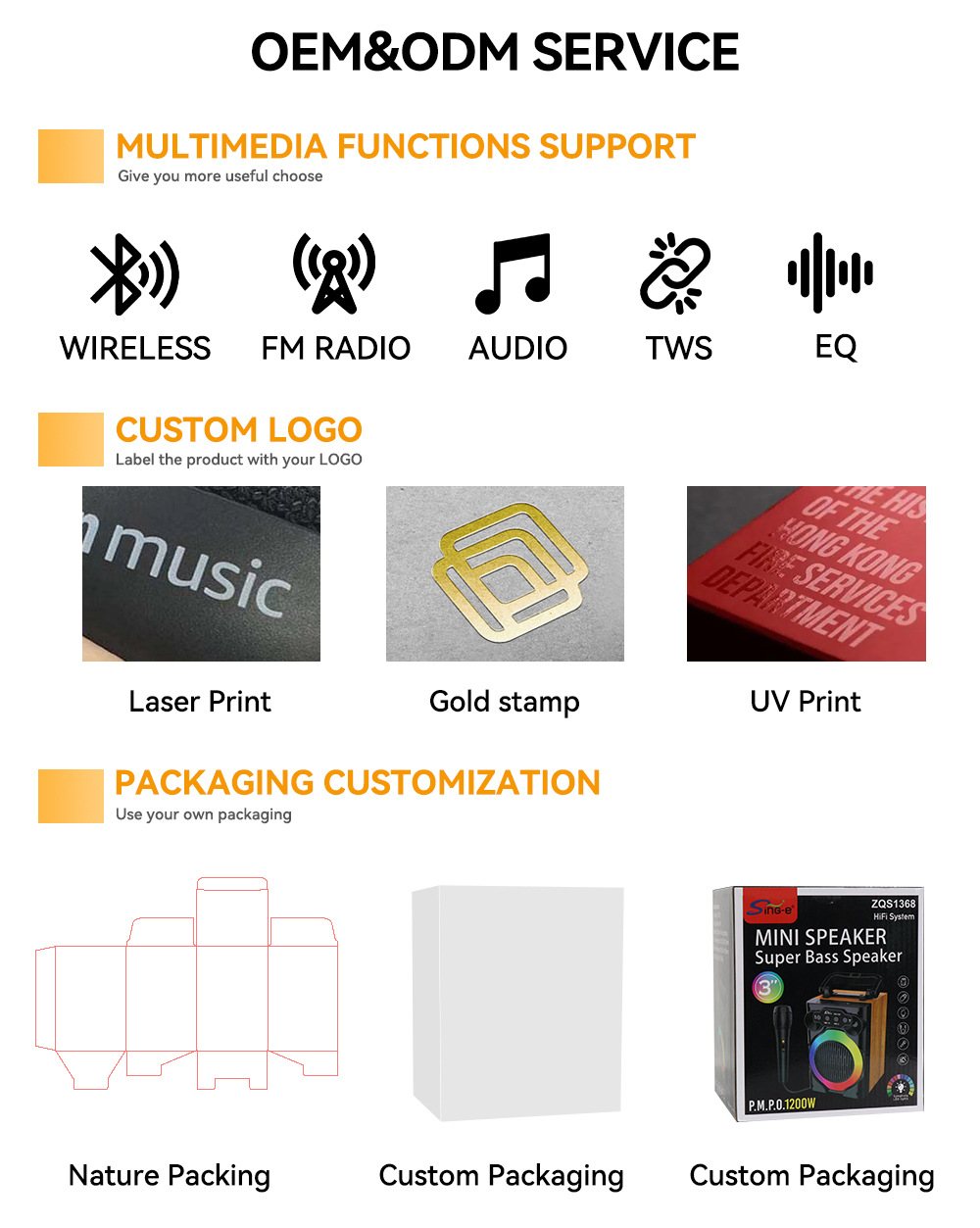 带BT/USB/TF卡/FM/MIC、DC-5V充电(Type-c座)+注:FM状态(插充电线后可以收台)