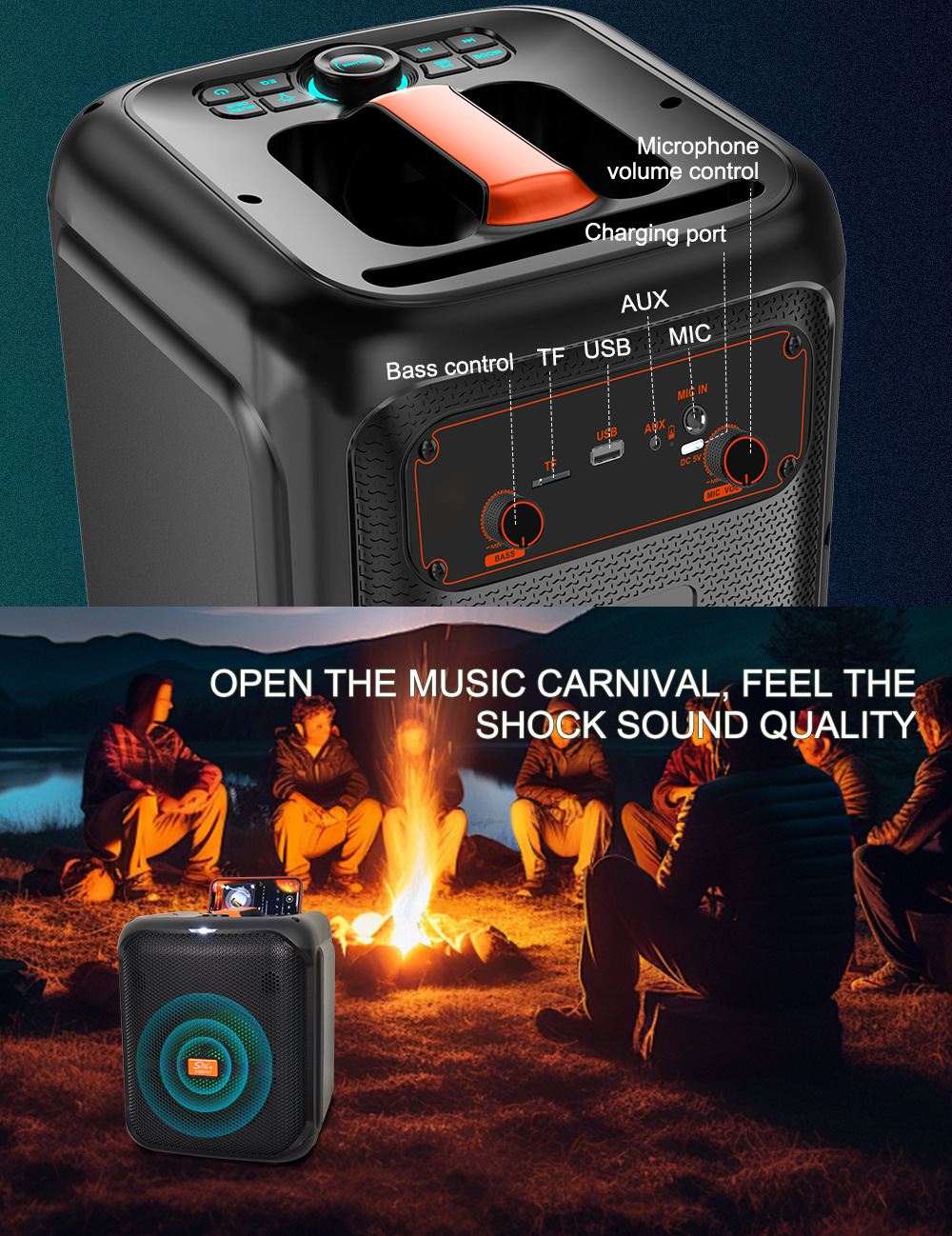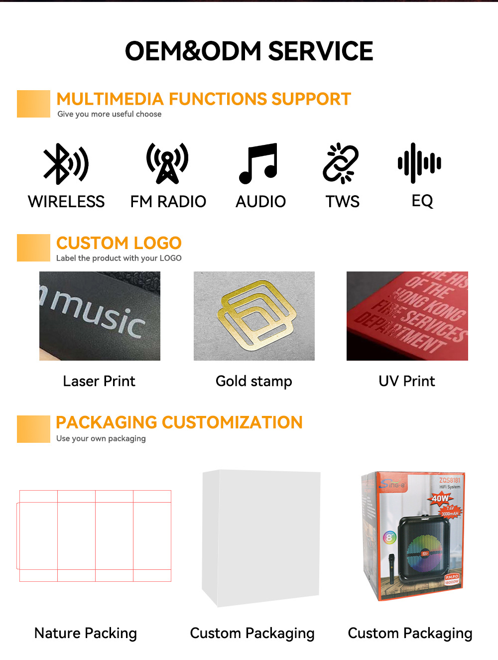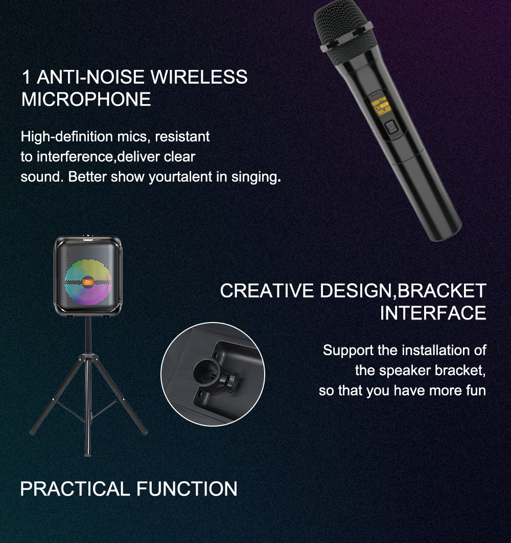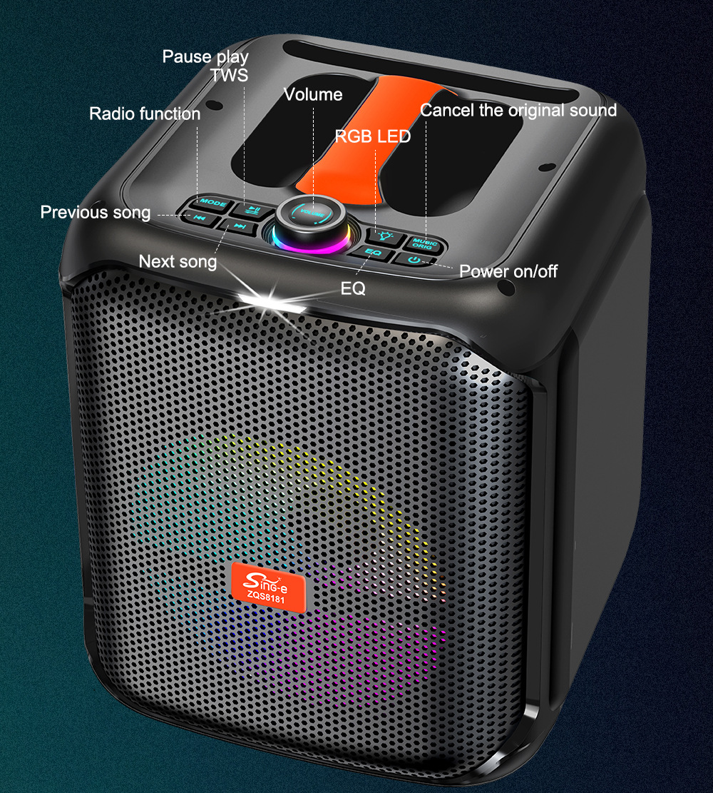 带BT/USB/TF卡/MIC/FM/AUX、DC-5V充电(Type-C充电)+无屏/无遥控/USB带5V升压/元锂电保护/电位器音量+XA8879D功放+高音+带无线麦功能+带DSP音效+带幻彩灯受LED按键控制、TWS