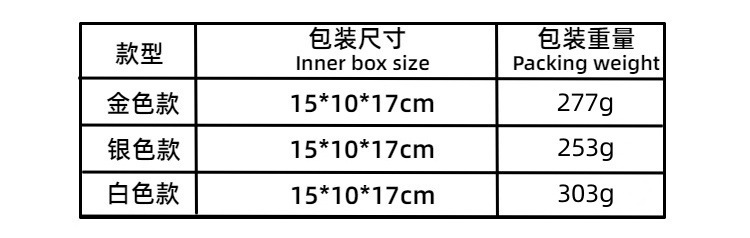 材质: 合成树脂 货号: RDW001 品牌: 连创 类别: 装饰摆件 包装: 纸盒包装 是否专利货源: 否 颜色: 金色,银色,白色 尺寸: 12*7*14 是否属于礼品: 是,个人礼品 是否IP授权: 否 重量: 0.5 kg/件 装箱信息:长宽高:10X10X10cm 装箱重量: 1KG 装箱数量:5pcs