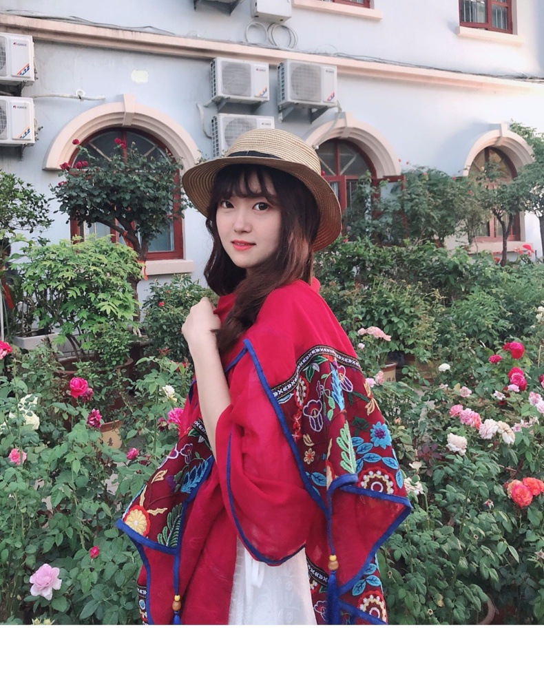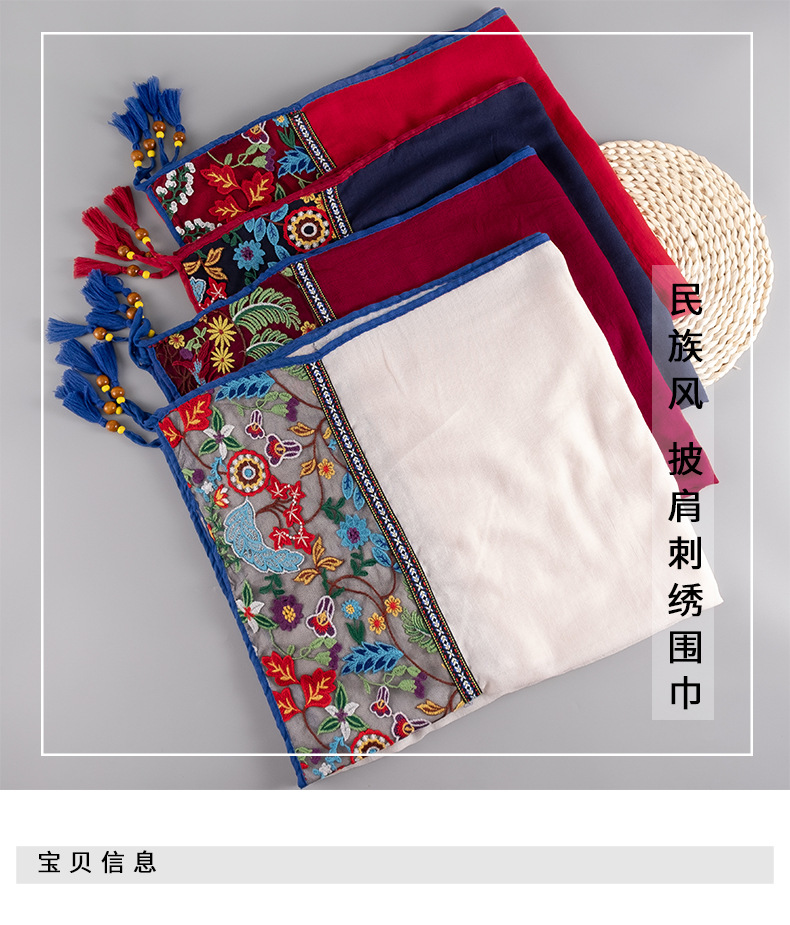 品牌: 其他 编织方法: 纬编 功能: 遮阳 适合季节: 夏季 货号: 民族风056 产地: 浙江 款式: 披肩 颜色: 米色,枣红色 有可授权的自有品牌: 否 是否跨境出口专供货源: 是 重量: 0.5 kg/条