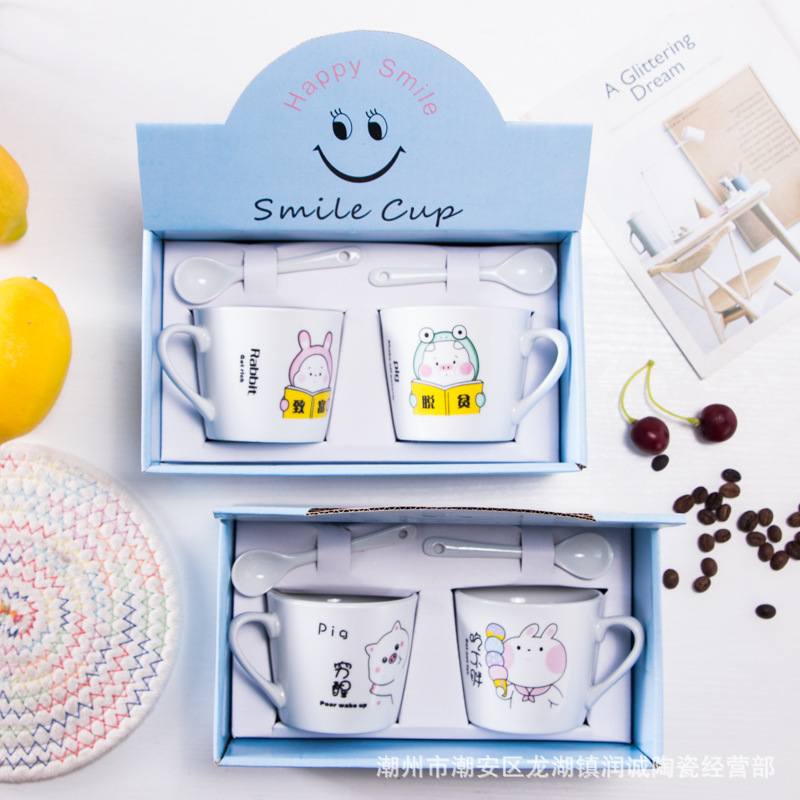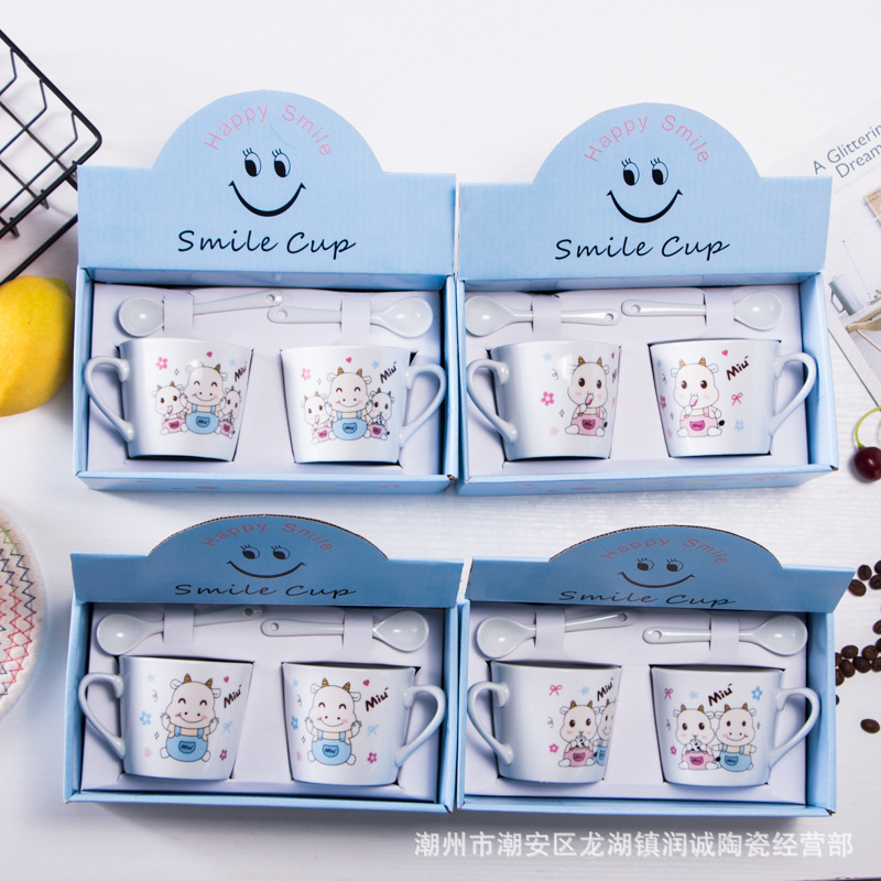 创意卡通陶瓷杯 带勺情侣杯子 日用百货开业礼品马克杯印制LOGO