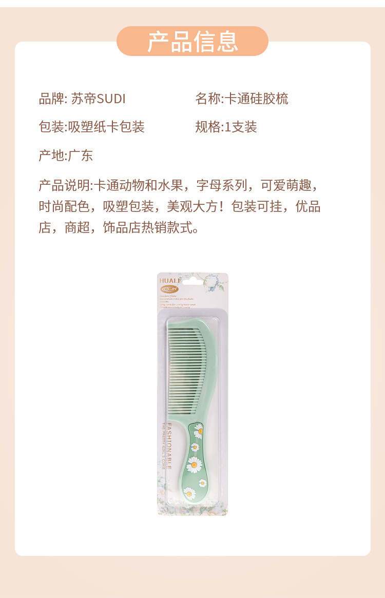 产品类别: 美发梳 是否进口: 否 品牌: 苏帝 材质: TPR+pp 颜色: 6183,6189,6190 货号: 61系列卡通硅胶梳 尺寸: 20cm以上 产地: 广东 有可授权的自有品牌: 是 是否跨境出口专供货源: 是 重量: 0.5 kg/个 装箱信息:长宽高:10X10X10cm 装箱重量: 1KG 装箱数量:5pcs