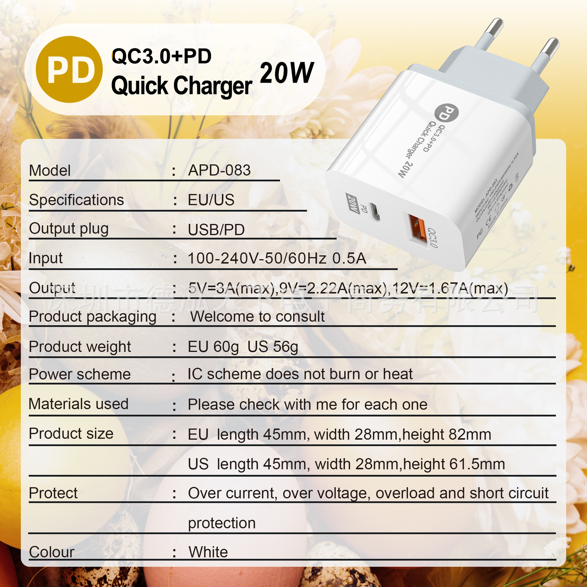 品牌: 德泓 货号: APD-083-a+c 产品认证: 无 适用型号: 欧规,美规 颜色: 18w 充电协议: QC3.0 插头标准: 欧标 是否数显: 否 输出功电流总功率: 220 输出电流: 220 重量: 0.1 kg/套