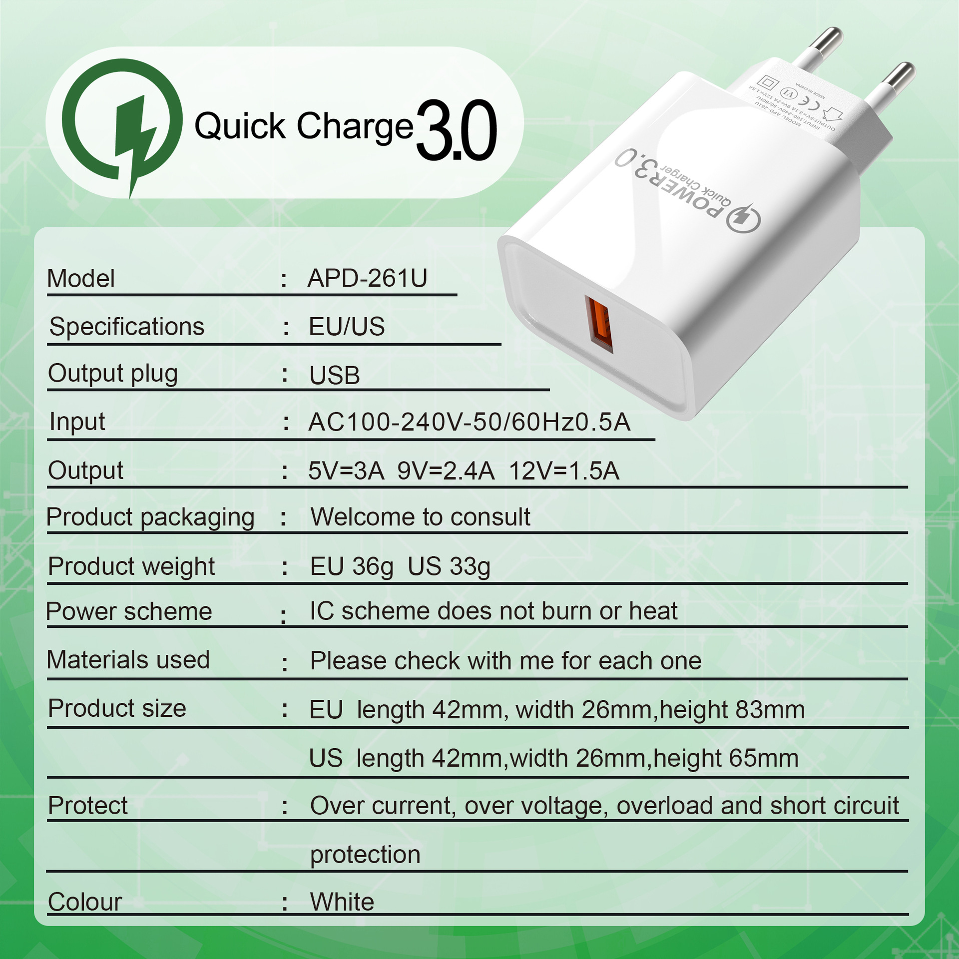 品牌: 德泓 货号: 高光APD-26(1U) 产品认证: 无 适用型号: 欧规,美规 颜色: QC3.0-15w 充电协议: QC3.0 插头标准: 欧标 是否数显: 否 输出功电流总功率: 220 输出电流: 220 重量: 0.1 kg/个