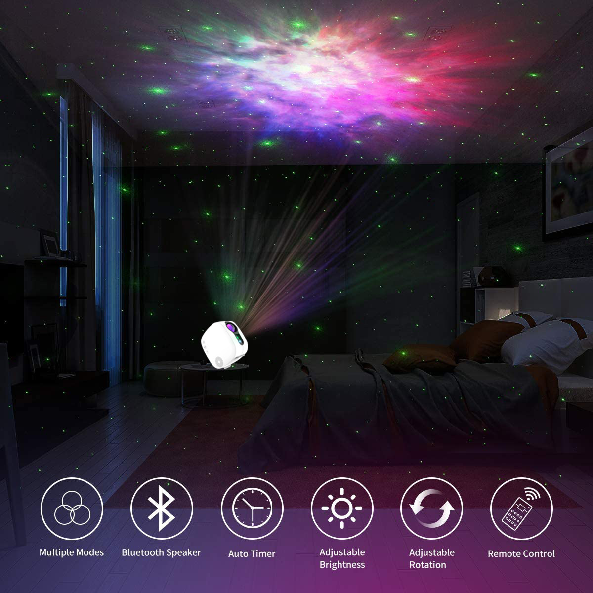 梦幻七彩极光星空投影,可自由手动切换星星云彩月亮模式和控制云彩颜色,产生十多种星云变化组合,或使用自动模式,内置定时器,蓝牙音乐,星云速度调节,灯光亮度调节。在家就能置身梦幻星空下,带来全心身的放松。定时器(15、30、60分钟定时)可以方便帮助进入睡眠。