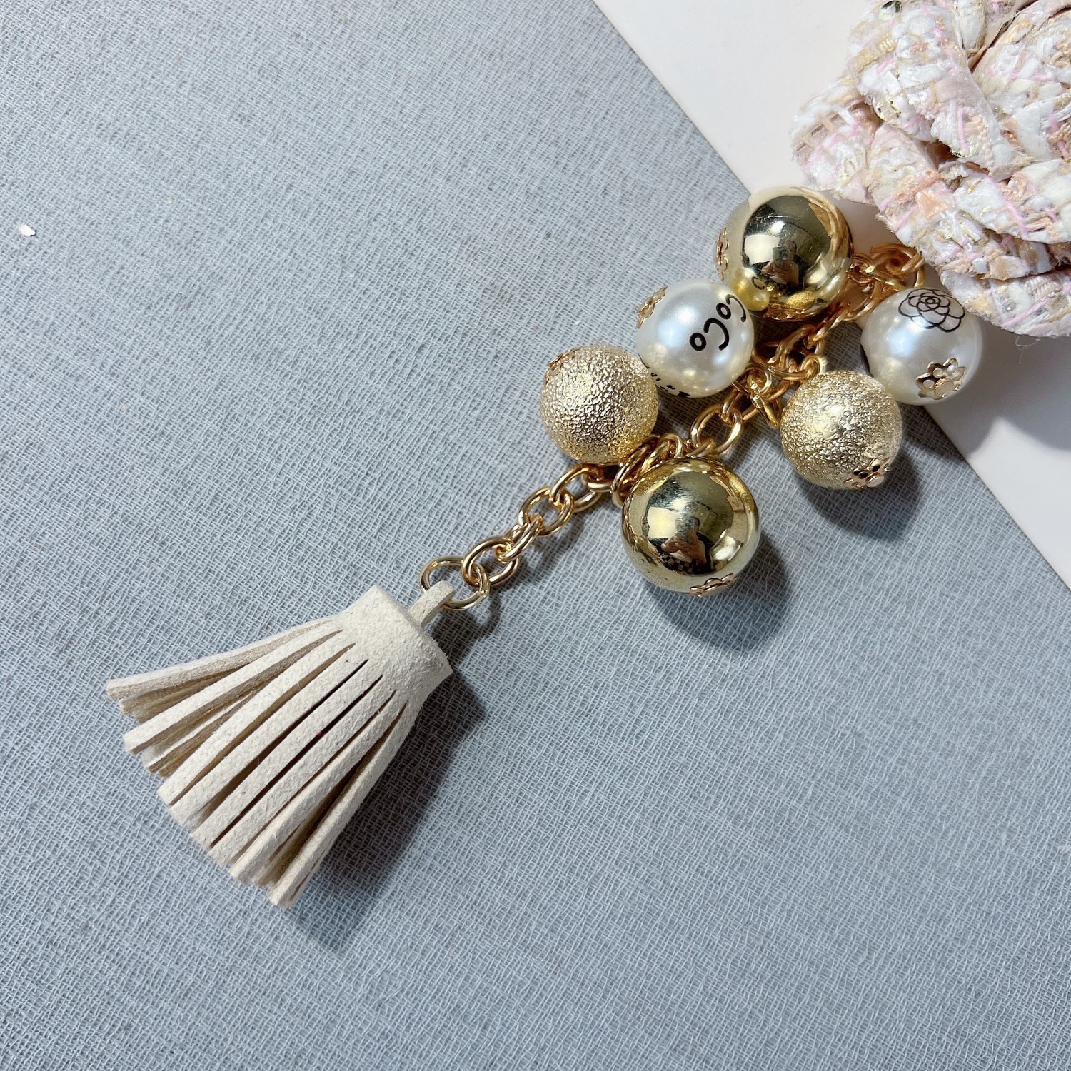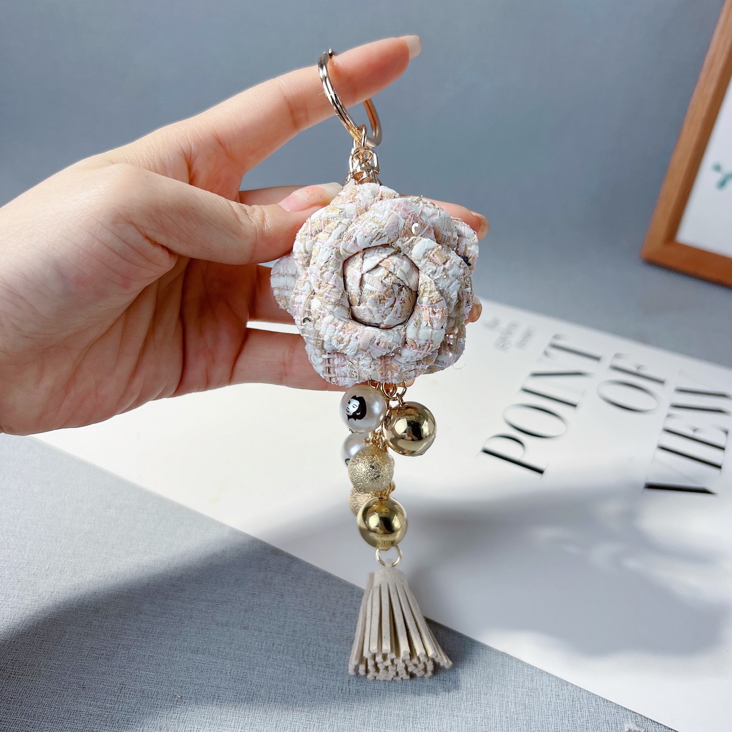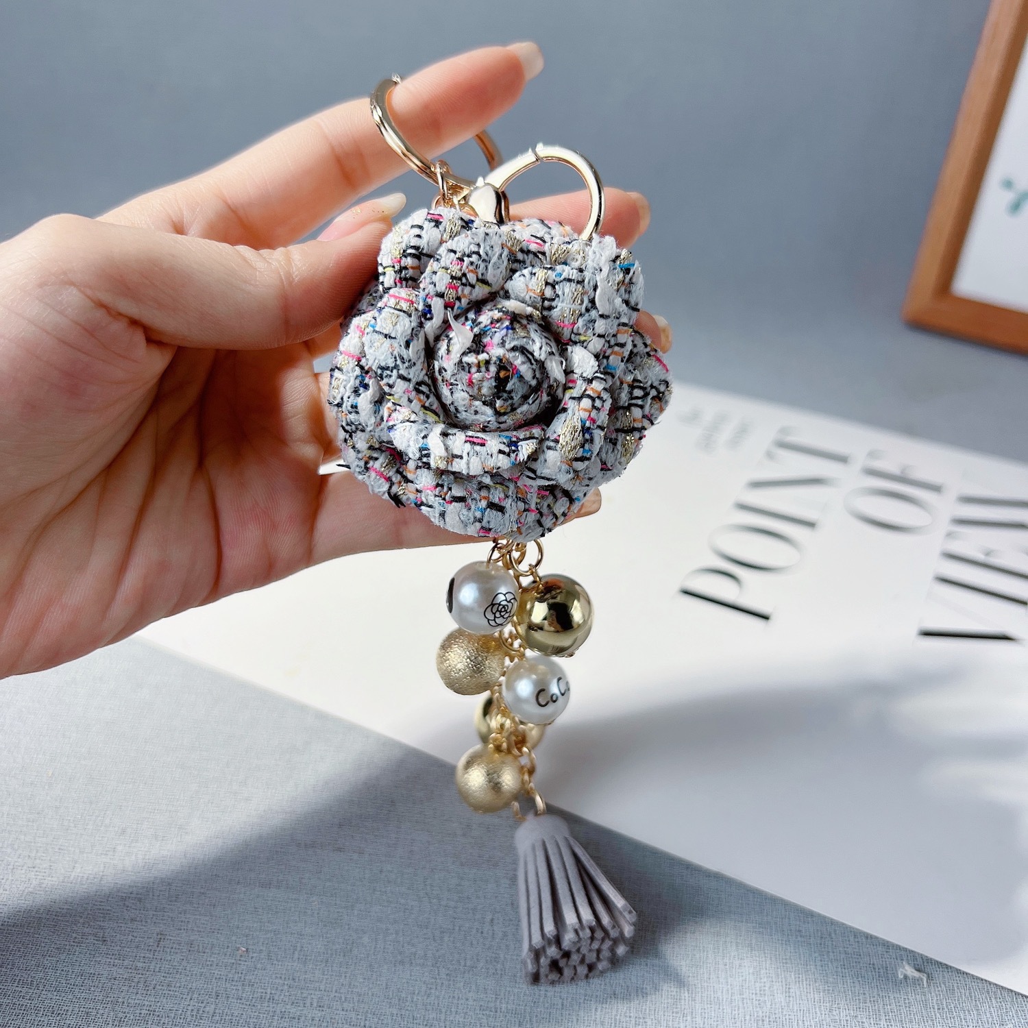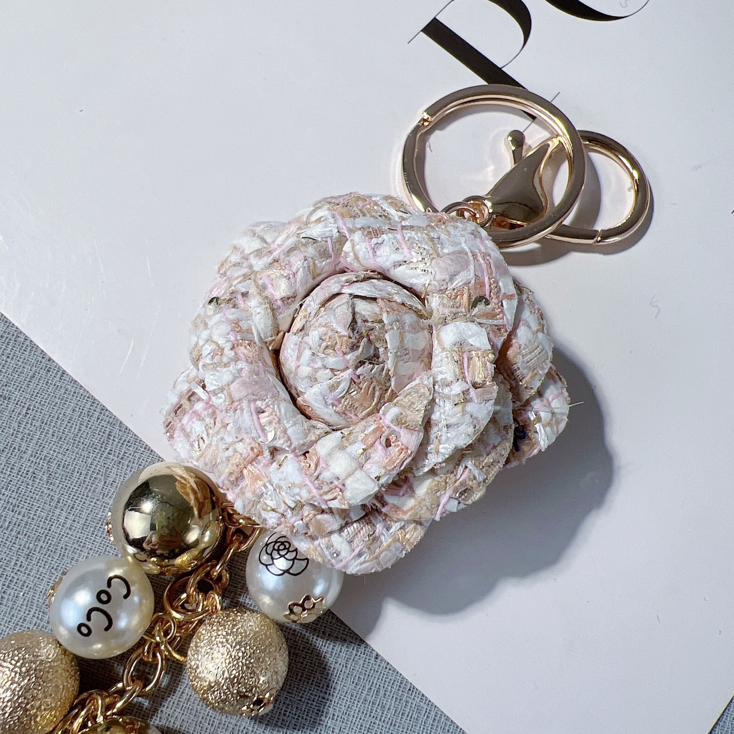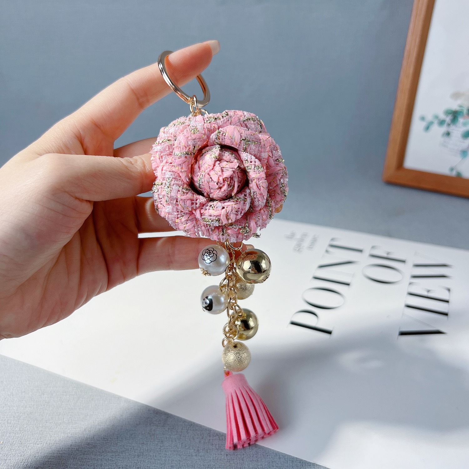 创意山茶花珍珠串钥匙扣欧美系流苏包包挂件时尚汽车钥匙链挂饰女