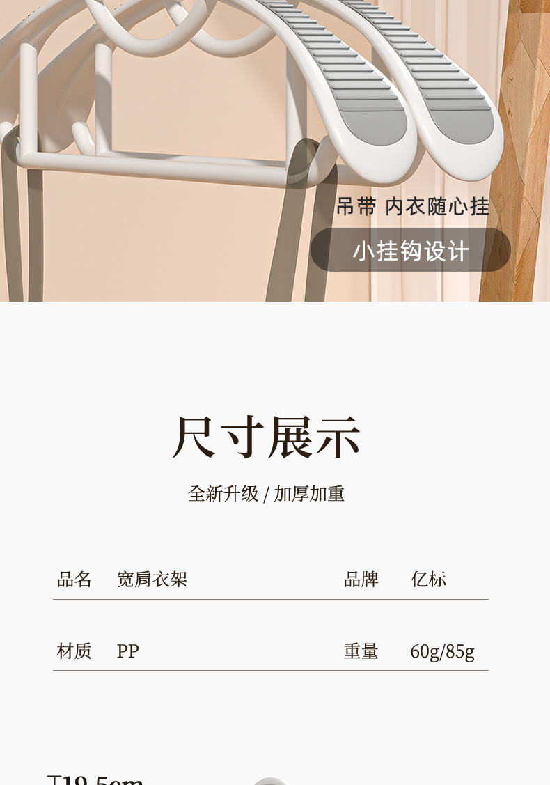 产品类别: 衣架 是否进口: 否 品牌: 亿标 形象: 其它 材质: 塑料 塑料新料占比: 100%新料 产地: 浙江省义乌市 产品上市时间: 2023 货号: 003 加工定制: 否 重量: 0.5 kg/个 装箱信息:长宽高:10X10X10cm 装箱重量: 1KG 装箱数量:5pcs