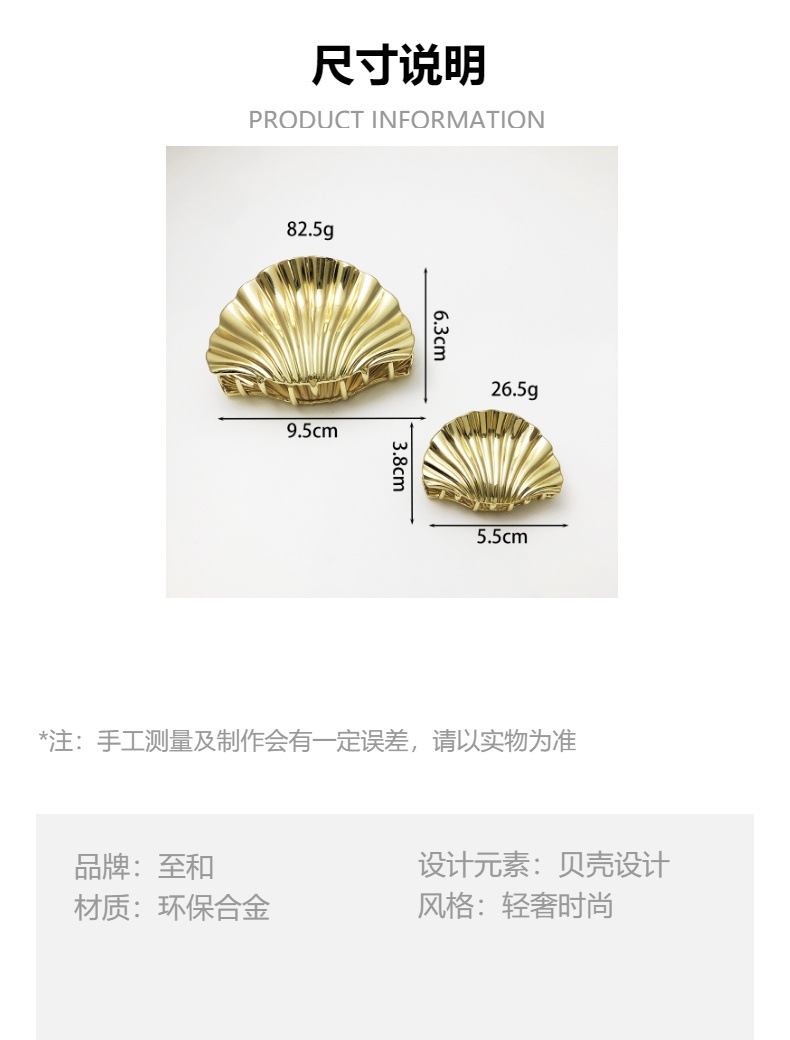 材质: 合金 货号: sadfe3 品牌: 梦妮娜 样式: 贝壳 处理工艺: 电镀 发夹分类: 抓夹 产地: 义乌 主要下游平台: ebay,亚马逊,wish,LINIO, 颜色: D00H70(大号贝壳)金色,D00H7 有可授权的自有品牌: 否 重量: 0.02 kg/个 装箱信息:长宽高:60X45X45cm 装箱重量: 0.02KG 装箱数量:600pcs
