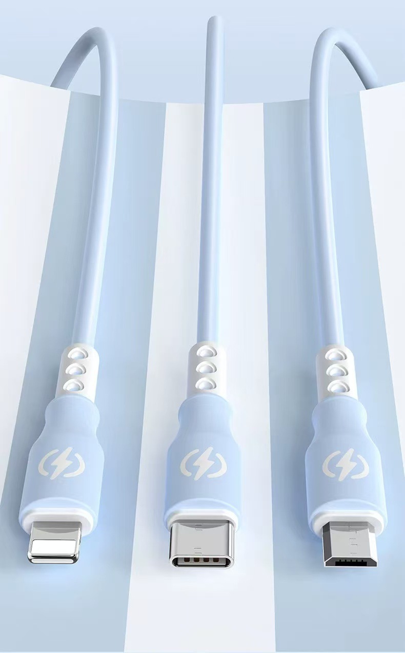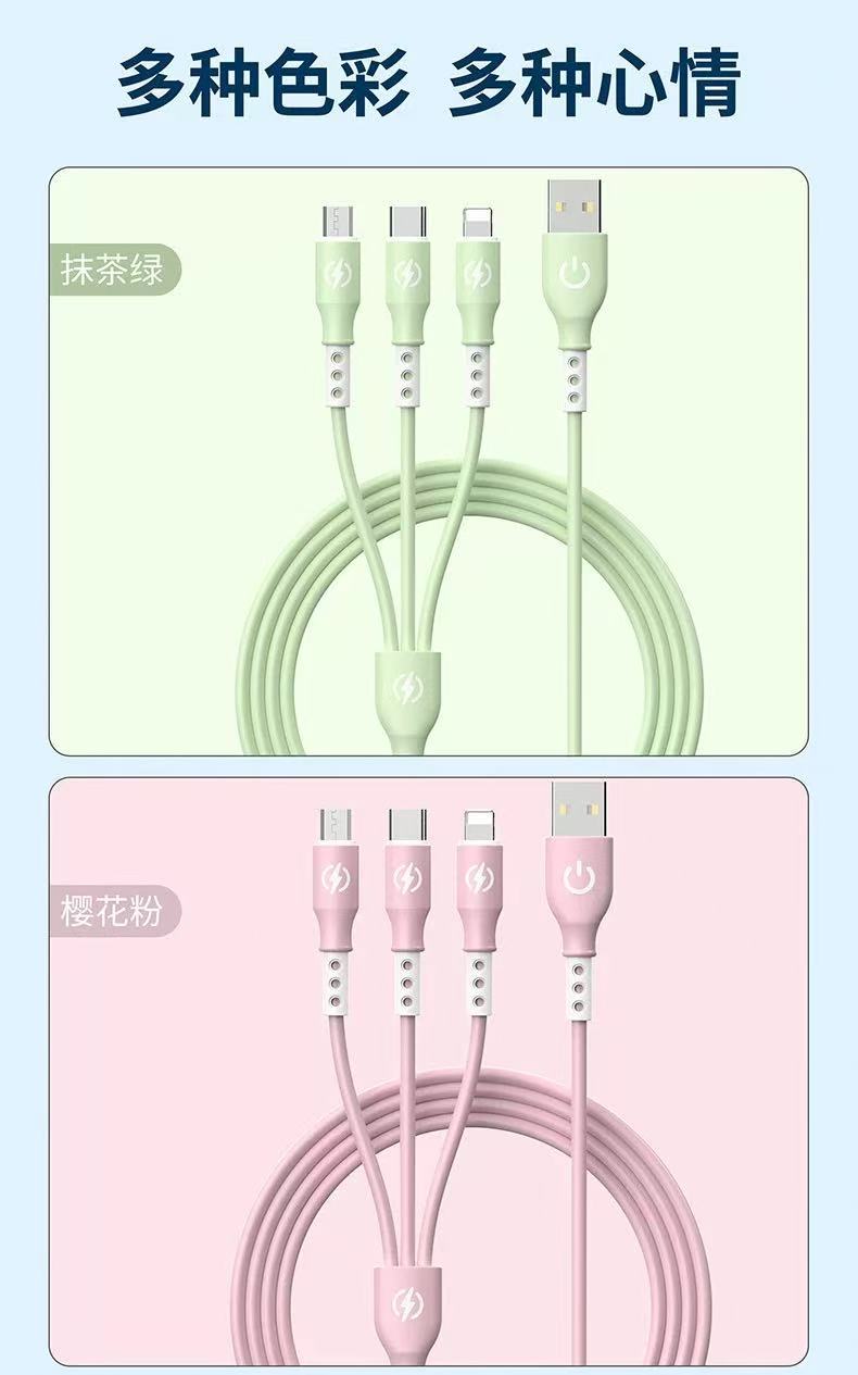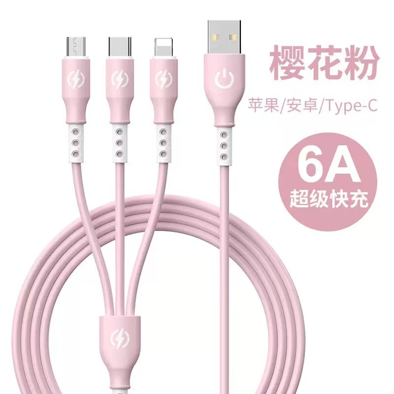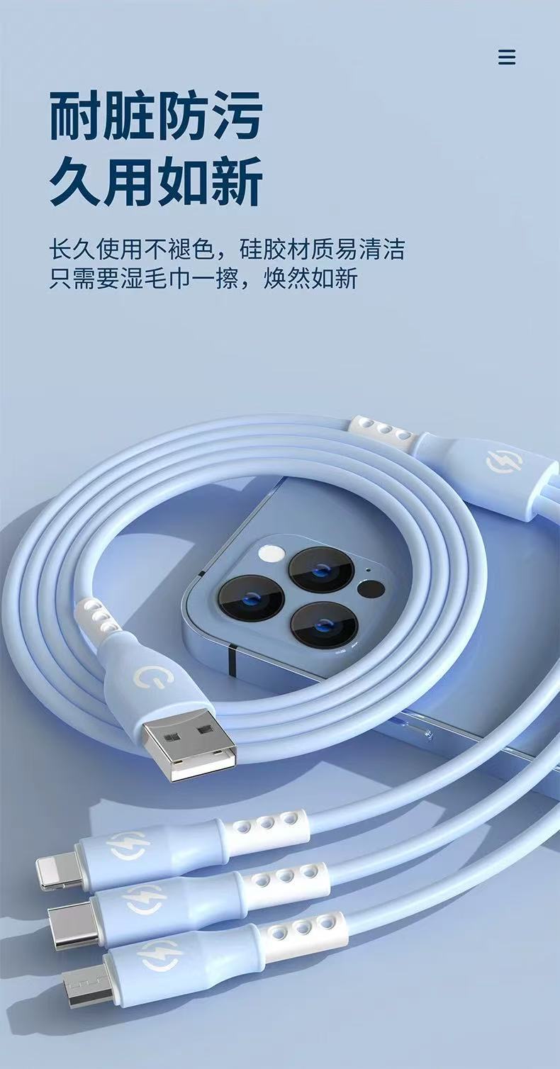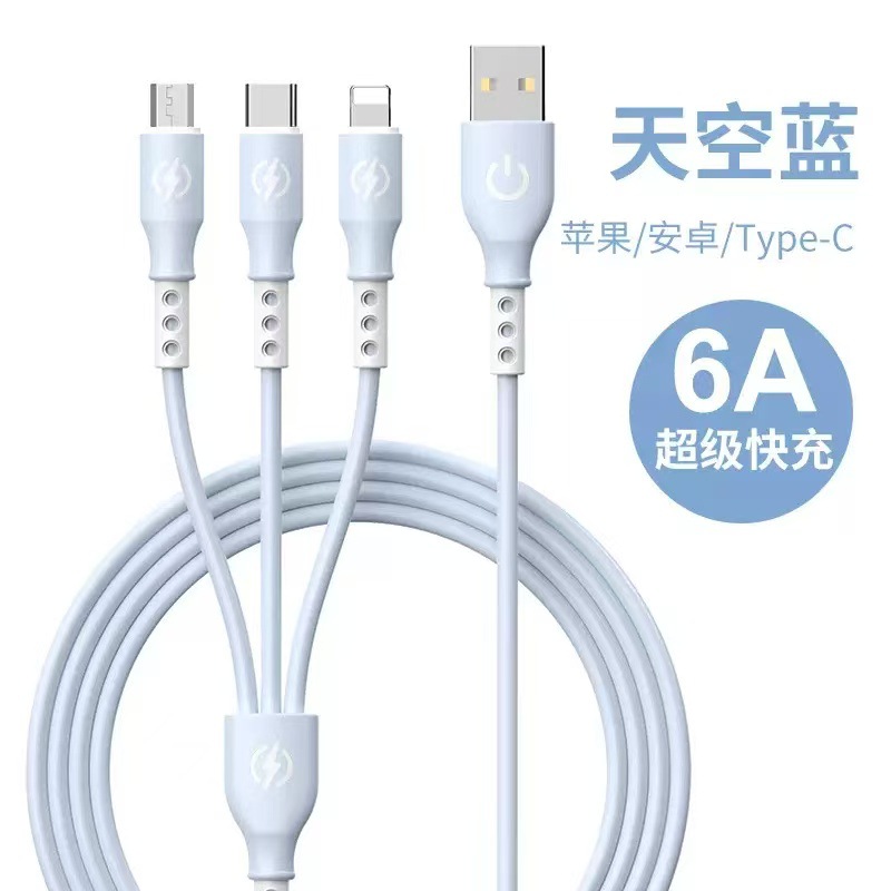新款跨境6A超级快充一拖三数据线液态硅胶三合一快充充电线现货