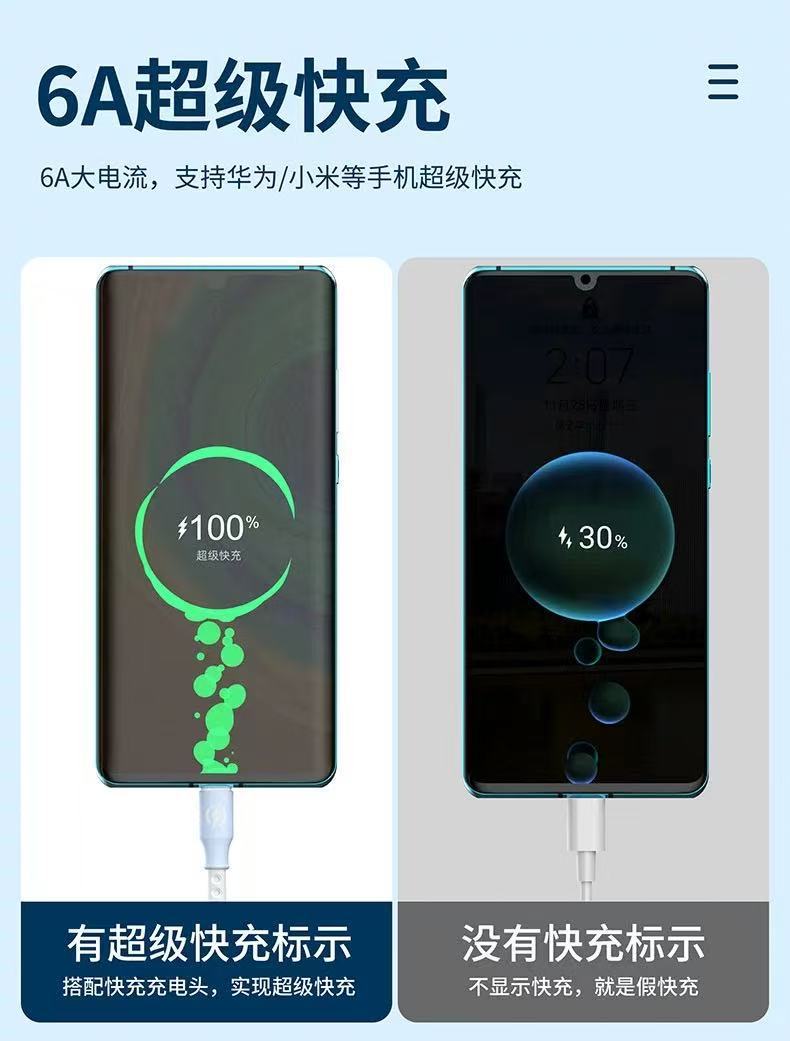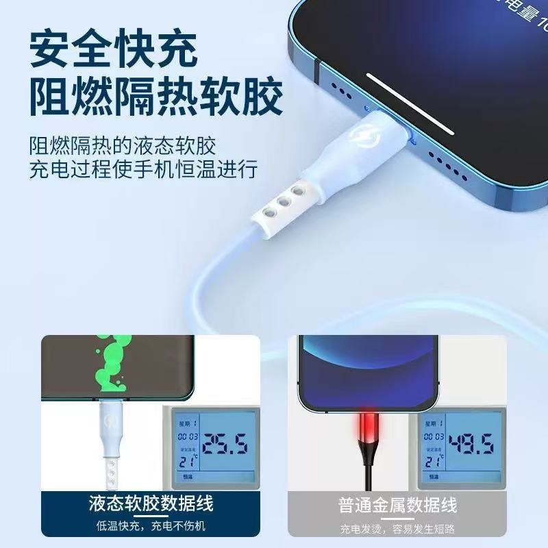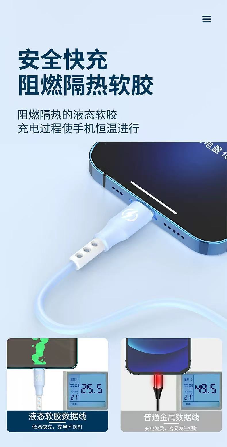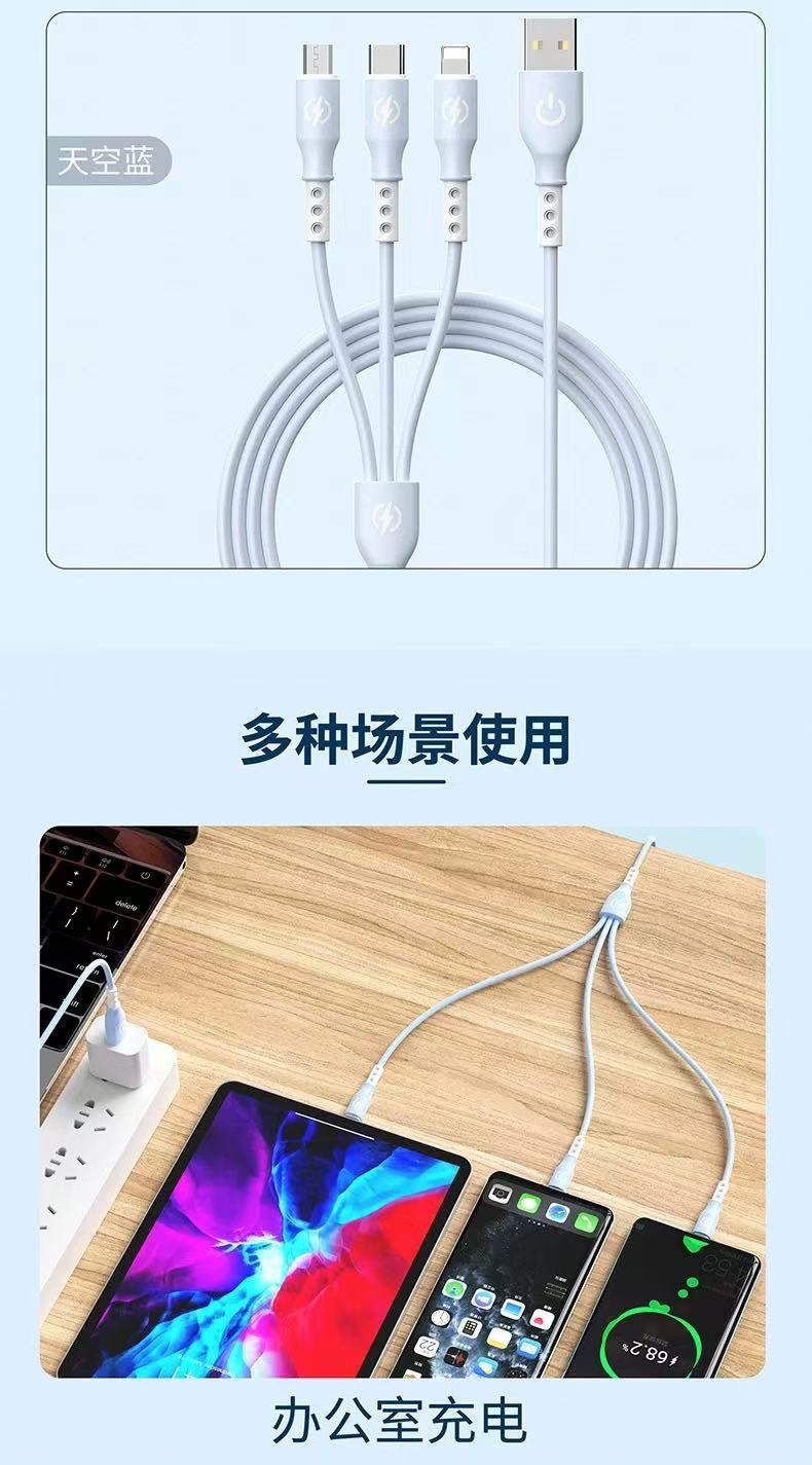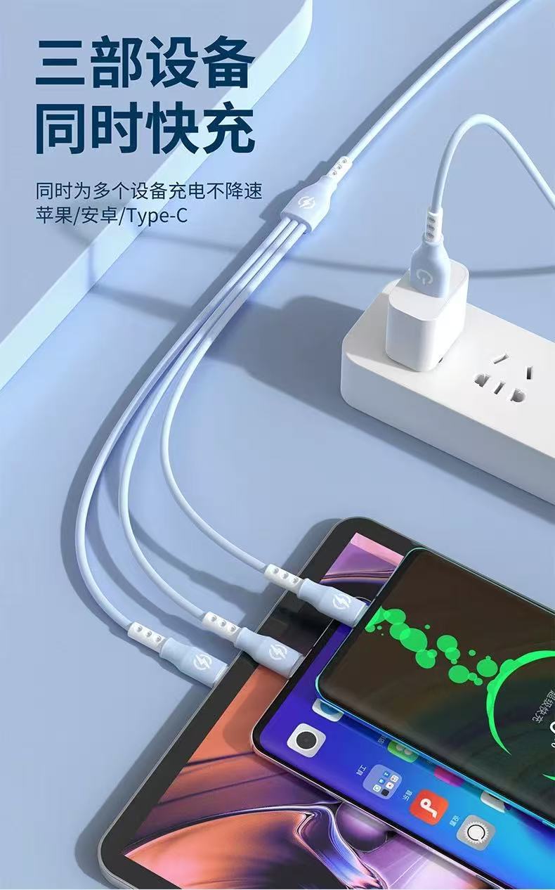 新款跨境6A超级快充一拖三数据线液态硅胶三合一快充充电线现货 投诉