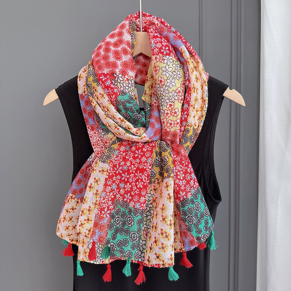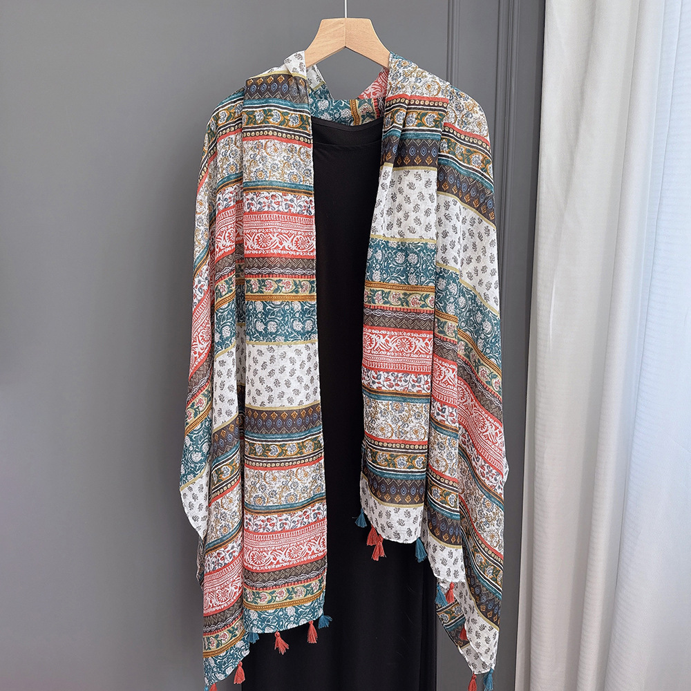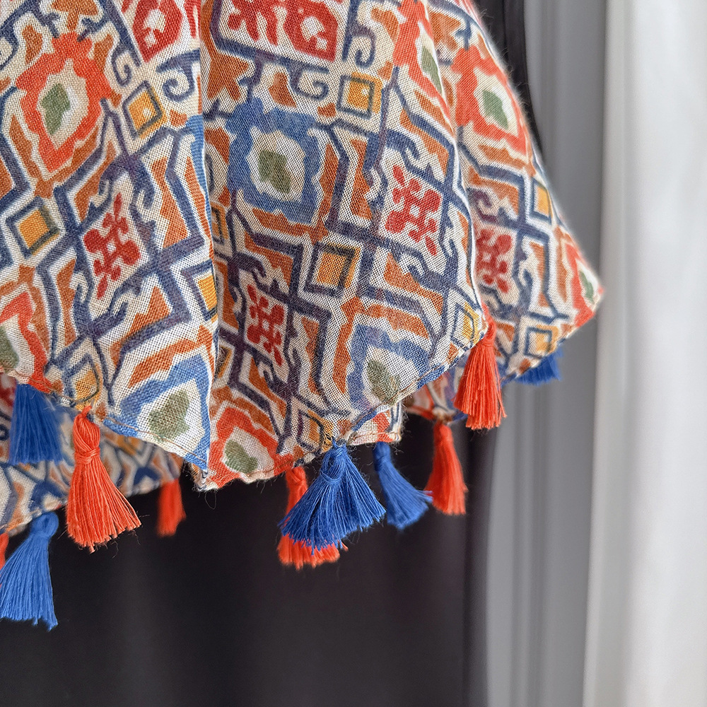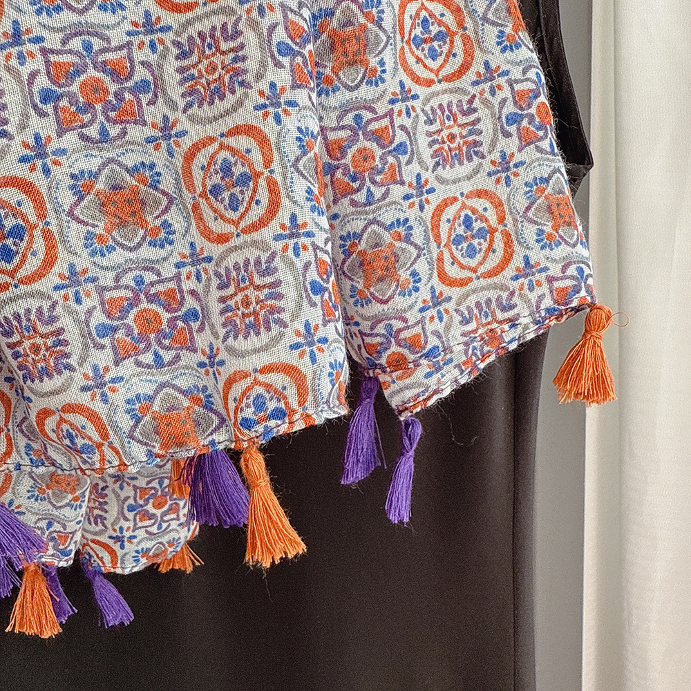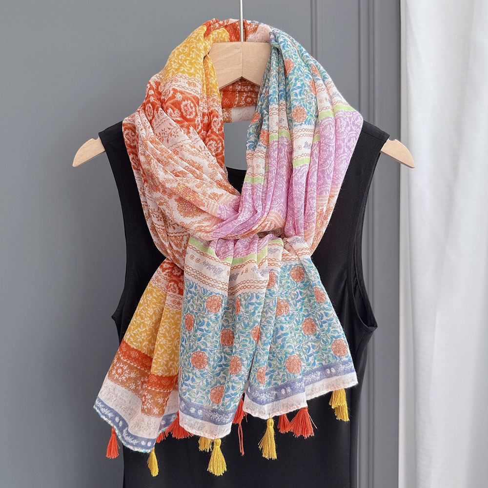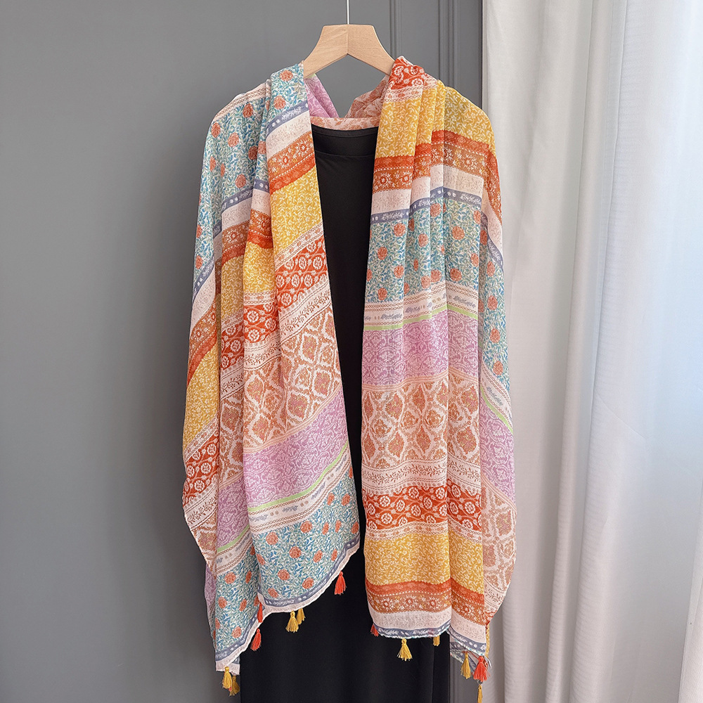 彩色挂须民族风围巾、披肩款,色彩鲜艳,旅游拍必备单品。