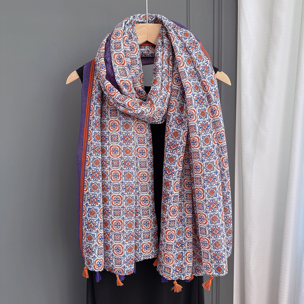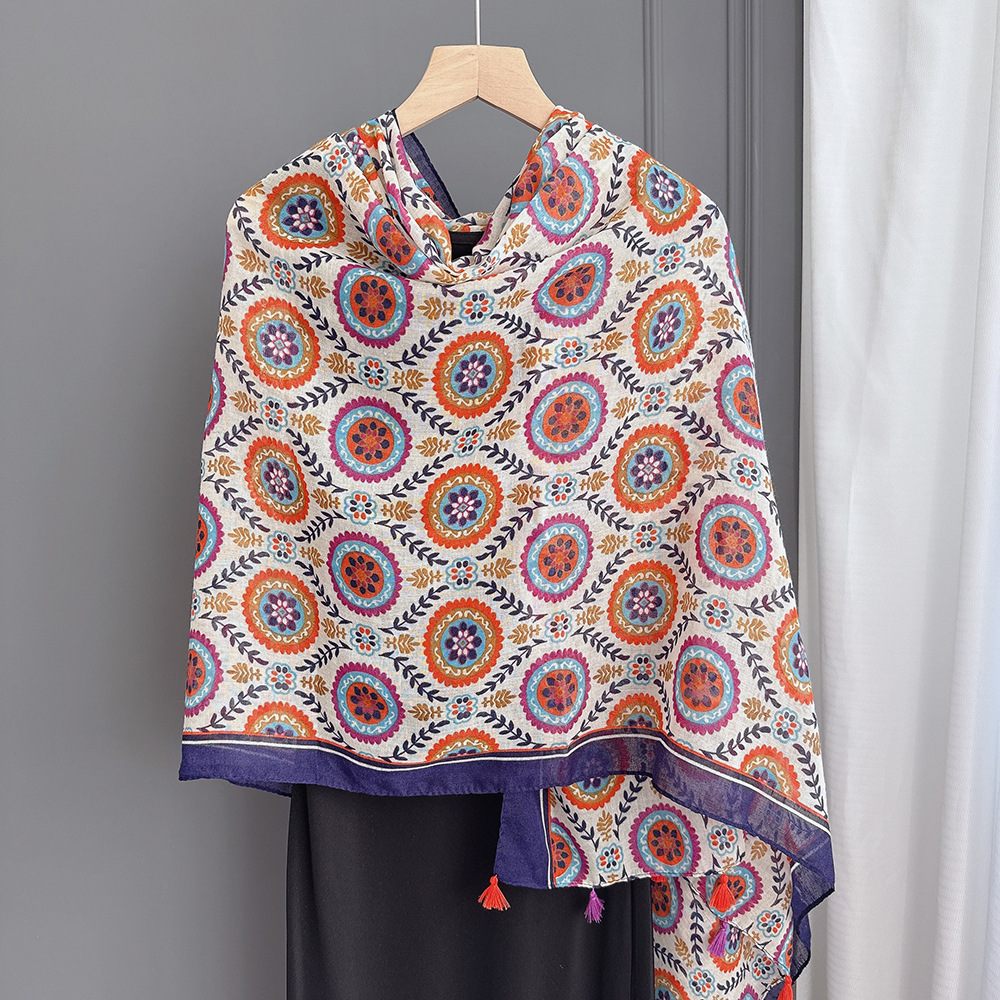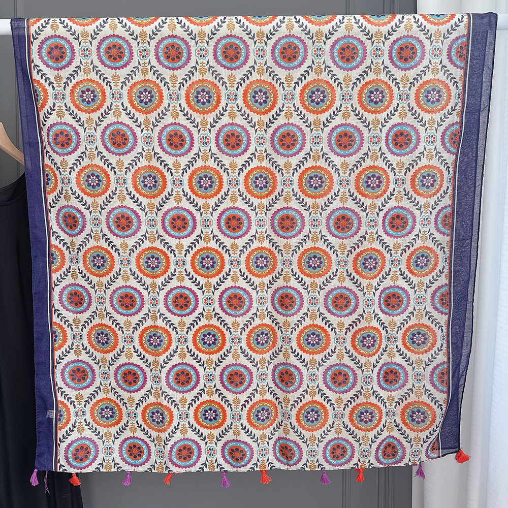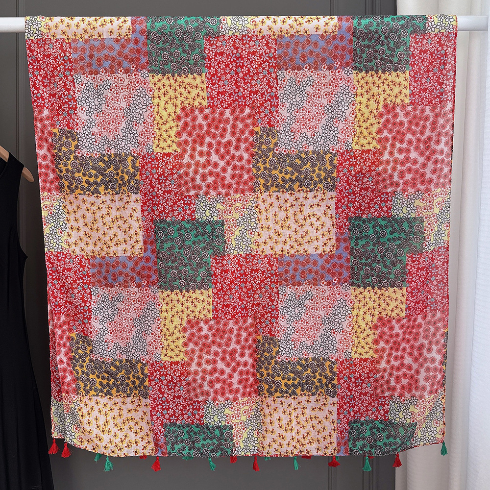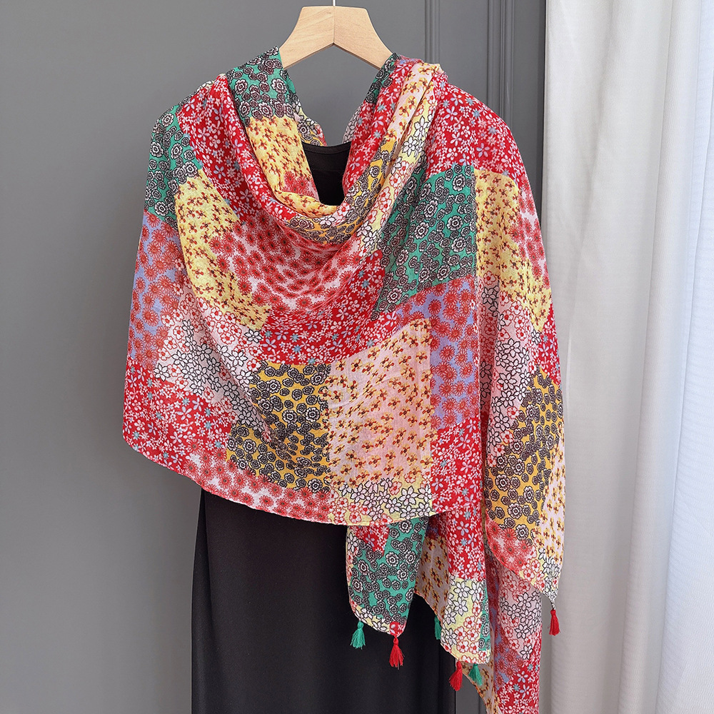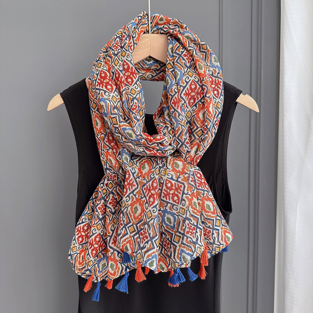 彩色挂须民族风围巾、披肩款,色彩鲜艳,旅游拍必备单品。
