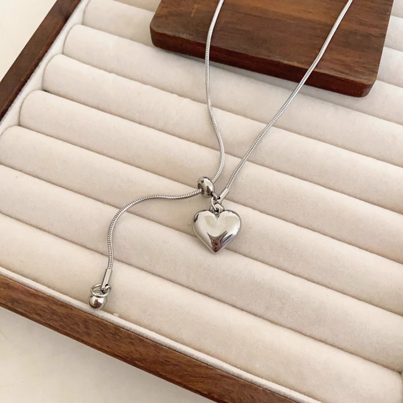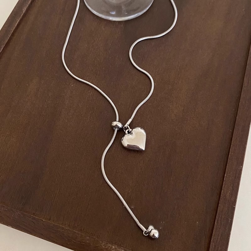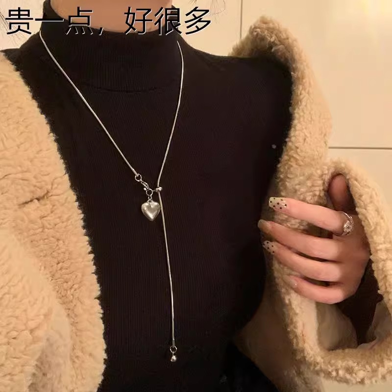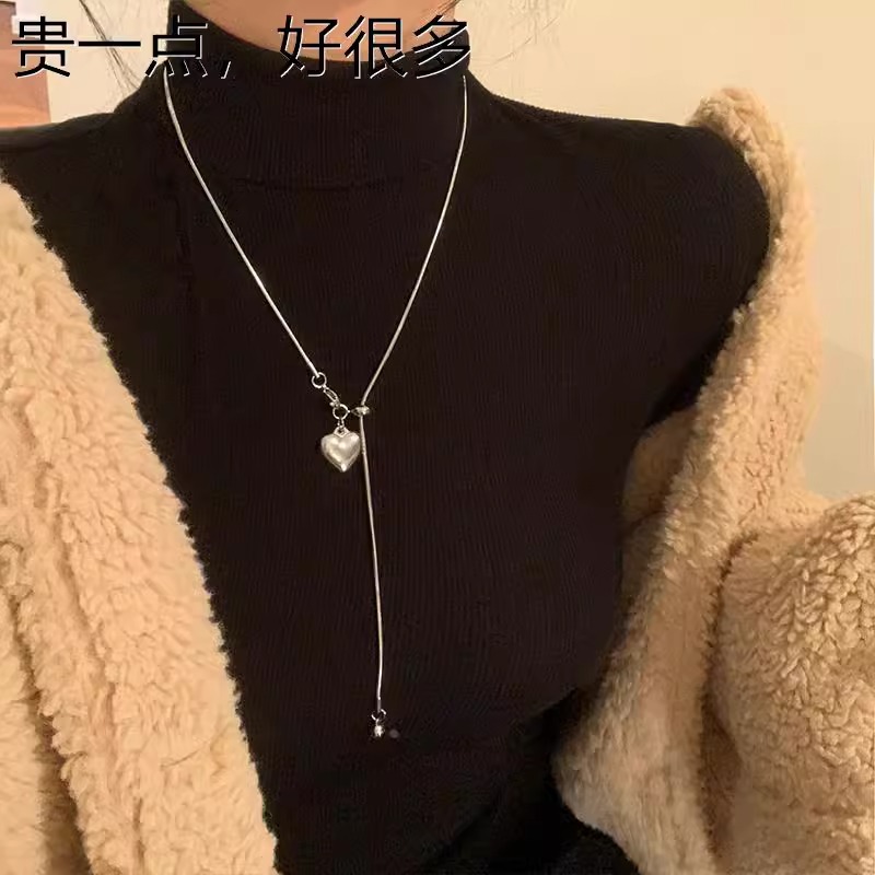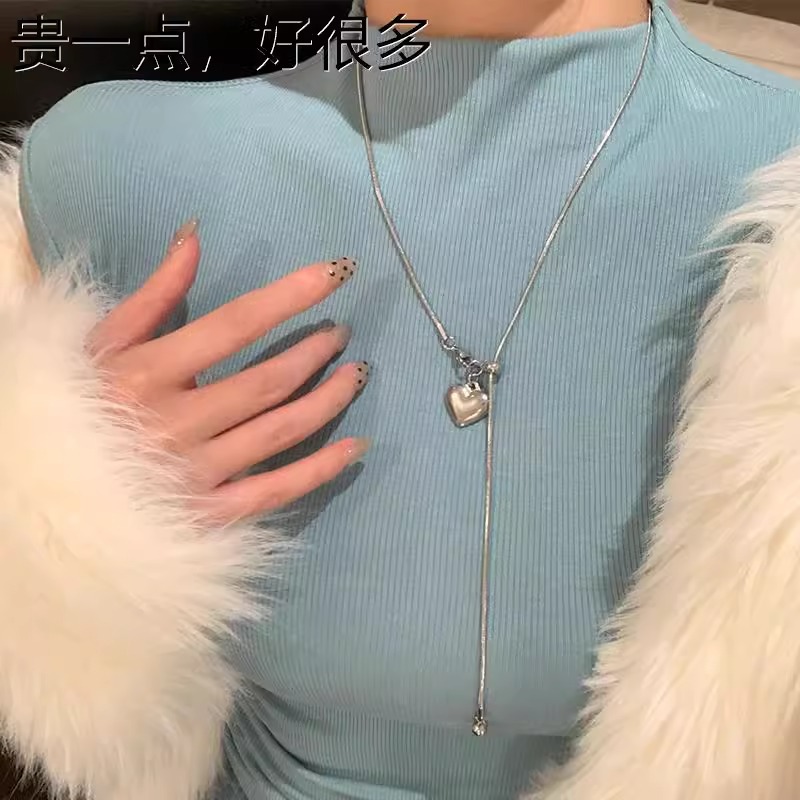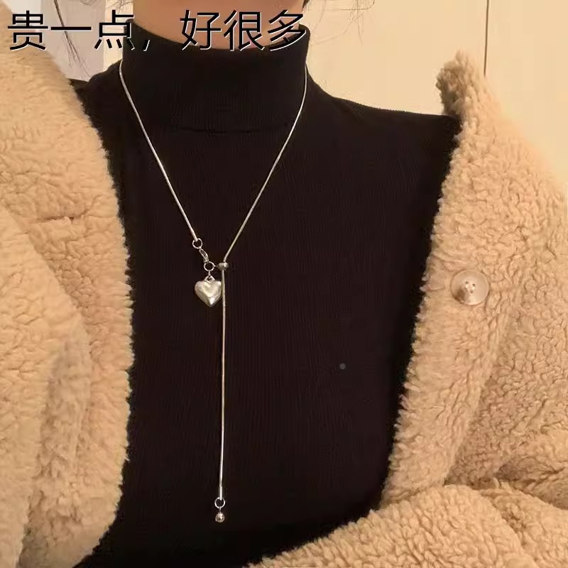 极简银色爱心吊坠项链女秋冬轻奢高级感钛钢抽拉式长款毛衣链配饰 投诉