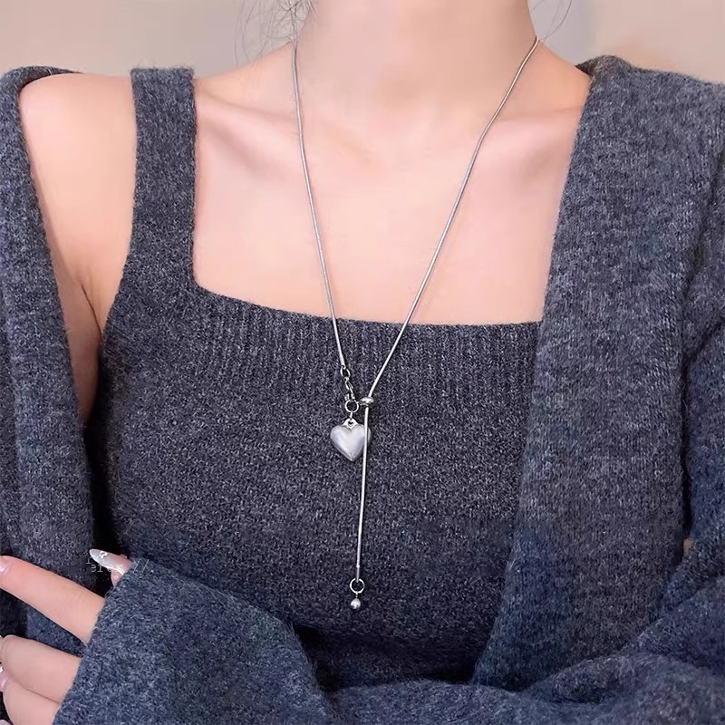 极简银色爱心吊坠项链女秋冬轻奢高级感钛钢抽拉式长款毛衣链配饰