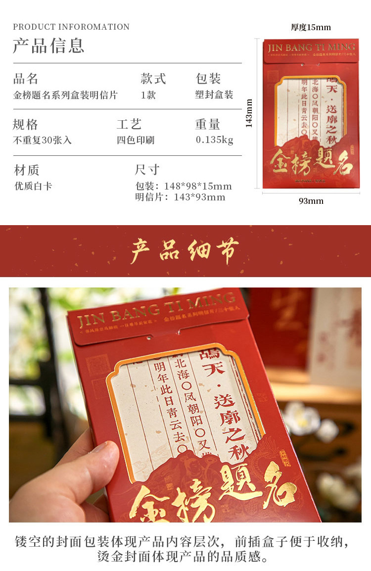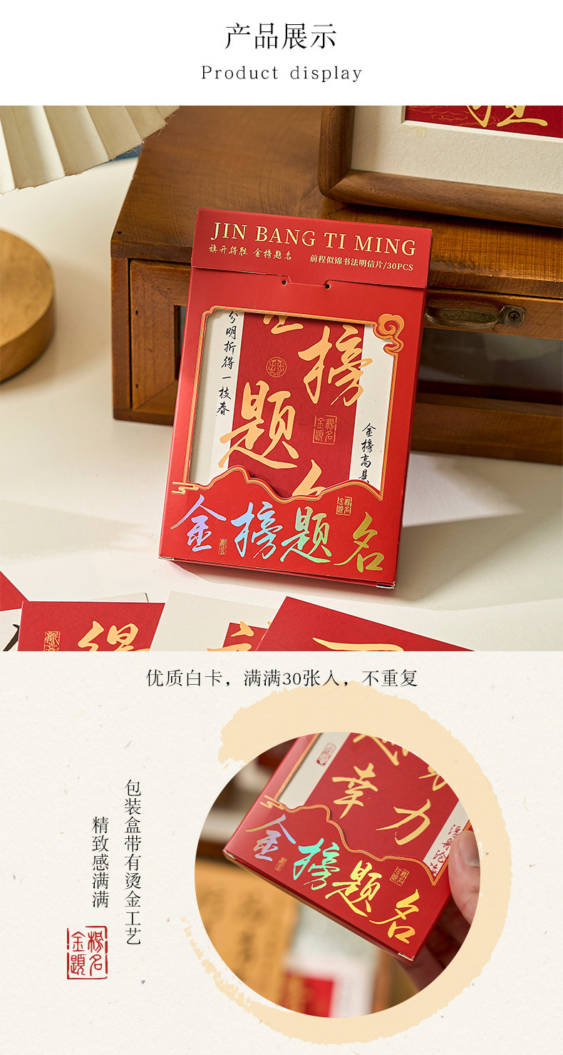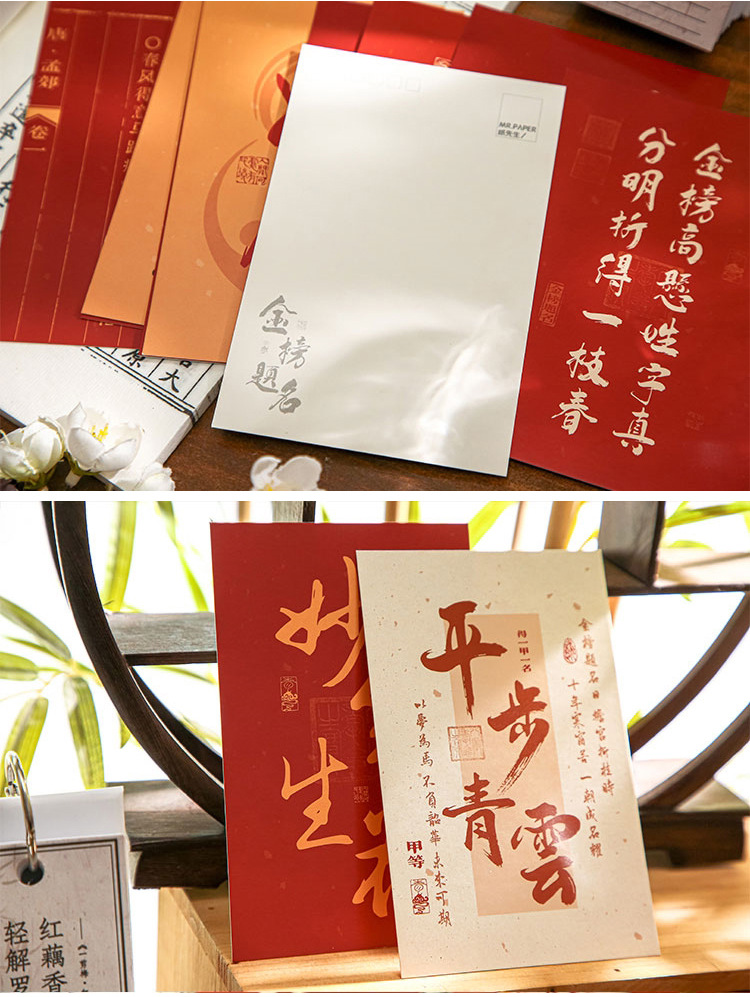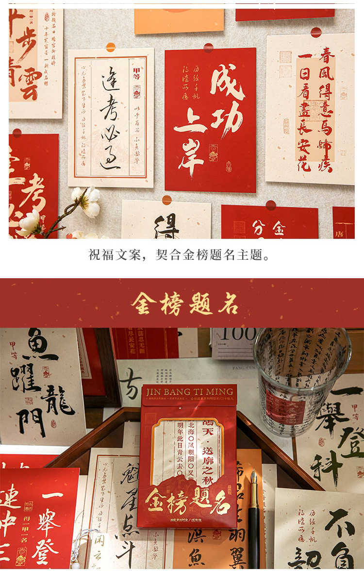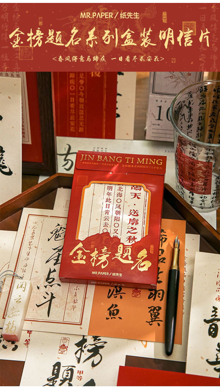 品牌: mr.paper/纸先生 货号: 金榜题名系列 功能: 收藏功能 种类: 普通邮资片 是否定制: 否 设计形式: 美术明信片 邮资效用: 免资 是否跨境出口专供货源: 否 风格: 学院风 适用场景: 学习,家居装饰,节日,办公 重量: 1.0 kg/盒