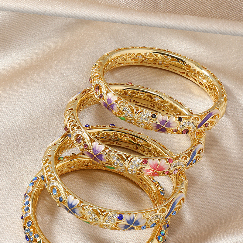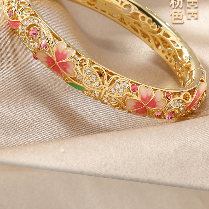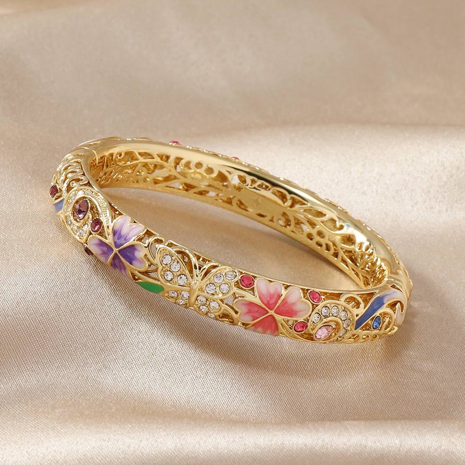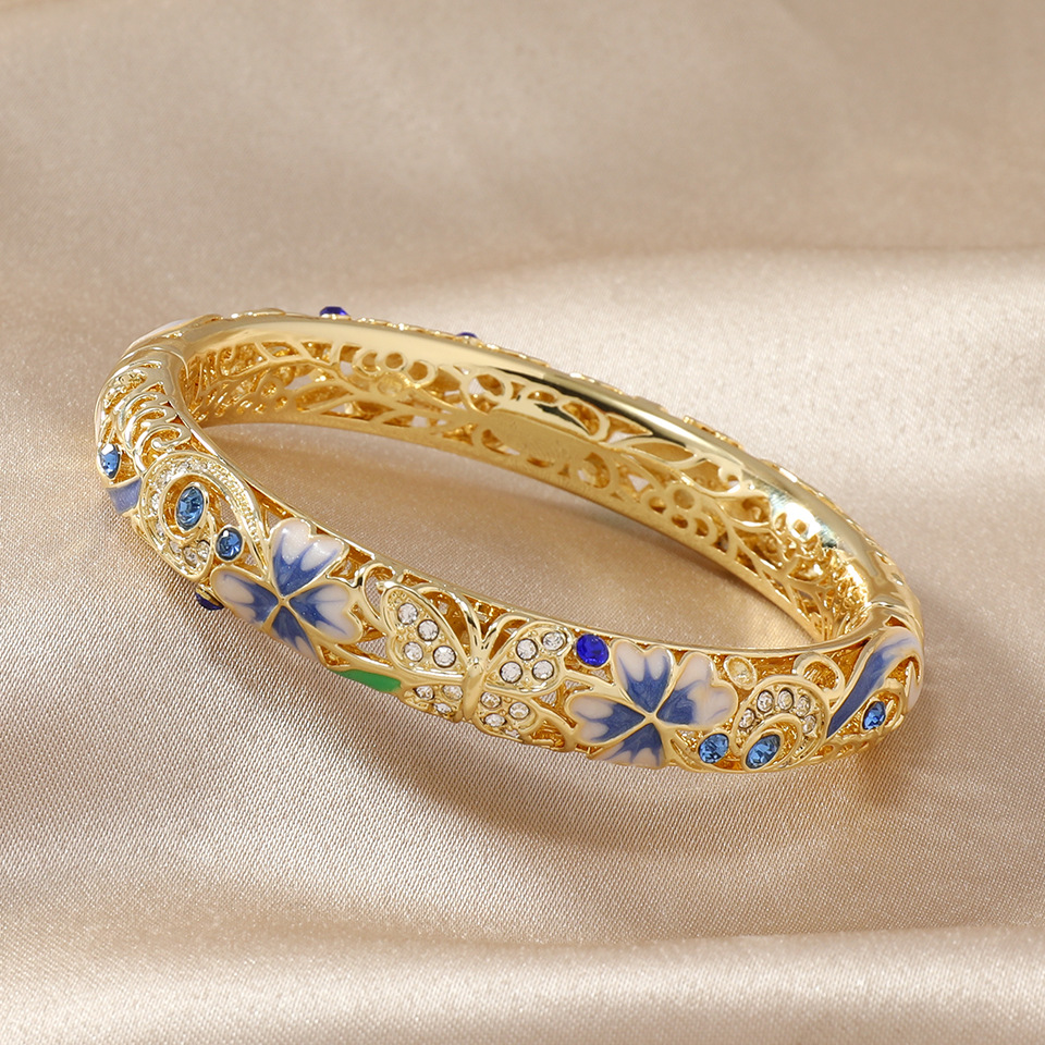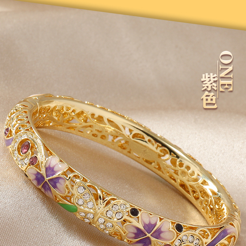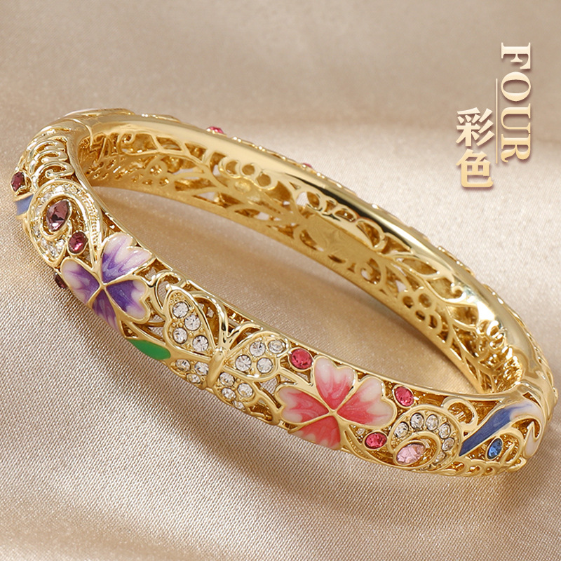 复古景泰蓝四叶草满钻镂空手镯开口珐琅旗袍镯子时尚古风送礼手饰