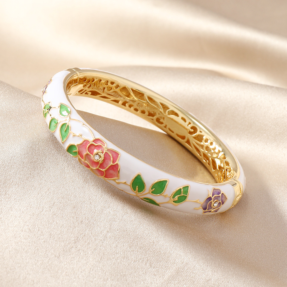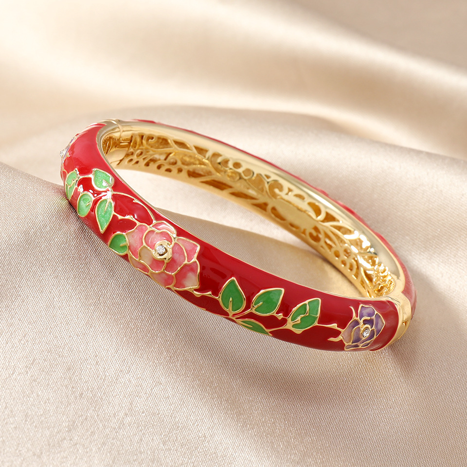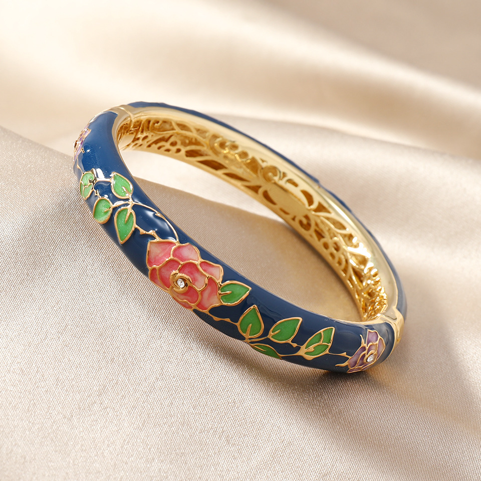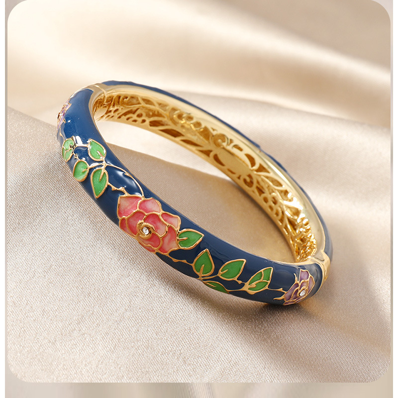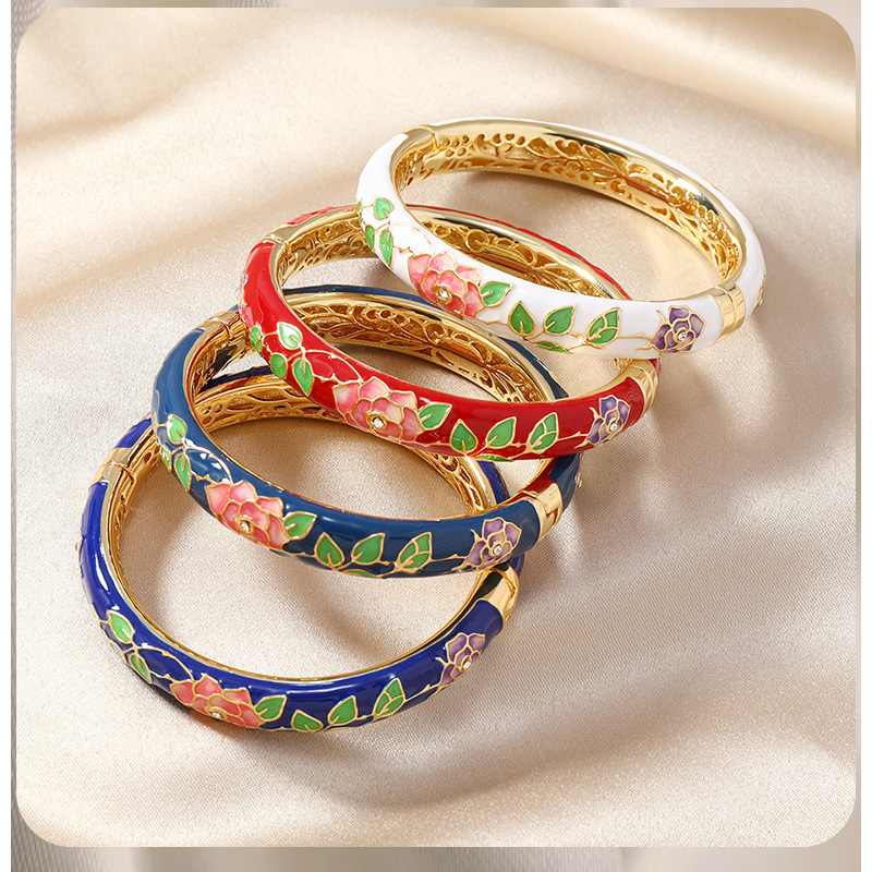国风景泰蓝开口手镯牡丹花百搭珐琅彩女士复古民族风饰品旅游礼物