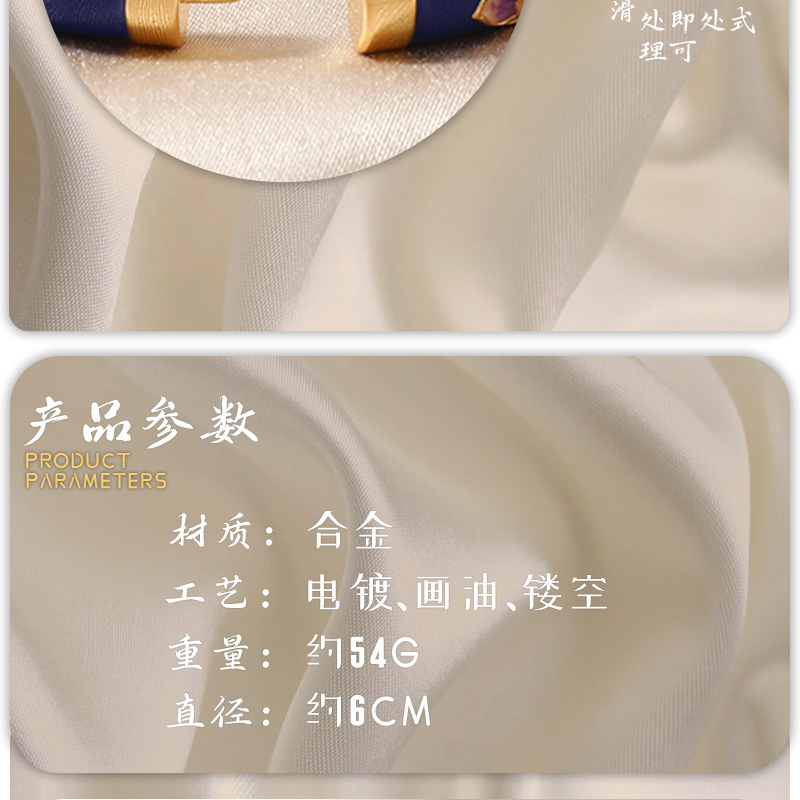 材质: 铜合金 货号: S2023040 品牌: 时代丽姿 处理工艺: 电镀 产地: 义乌 主要下游平台: 快手,天猫,拼多多,抖音,其他 颜色: 白色,红色,藏青色,蓝色 有可授权的自有品牌: 否 是否跨境出口专供货源: 否 流行元素: 吉祥图案 重量: 0.5 kg/个