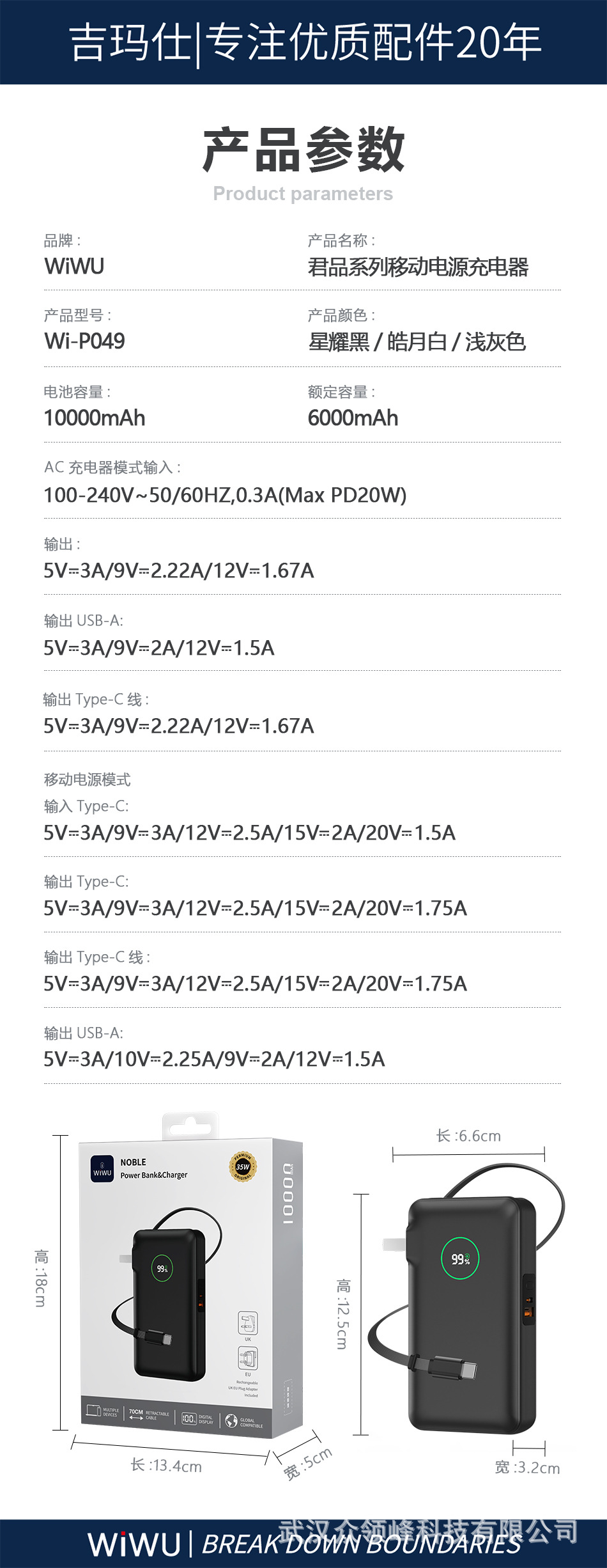 分类: 充电宝 货号: WIWUP049 电池类型: 锂聚合物电池 电芯类型: 聚合物锂离子电芯 外壳材质: 塑料 颜色: 黑色,白色 电源容量: 10000毫安 尺寸: 87*38*87mm 是否跨境出口专供货源: 是 装箱数: 120PCS 重量: 12.0 kg/支