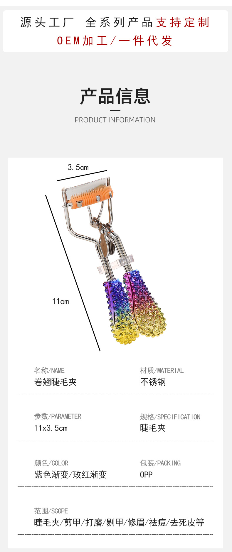 分类: 整体式 是否进口: 否 品牌: 天奇 货号: 028 产地: 义乌 款式: 睫毛夹 颜色分类: 紫色渐变,蓝色渐变 是否电动: 否 主要下游平台: ebay,亚马逊,wish,速卖通,独立 主要销售地区: 欧洲,东南亚,北美,东北亚,中东