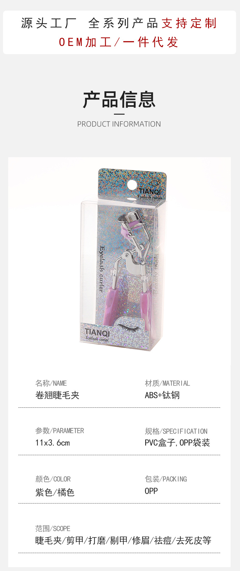 分类: 整体式 是否进口: 否 品牌: 天奇 货号: 027 产地: 义乌 款式: 手动睫毛夹 颜色分类: 紫色,橘色 是否电动: 否 主要下游平台: ebay,亚马逊,wish,速卖通,独立 主要销售地区: 欧洲,南美,东南亚,北美,东北亚,中东