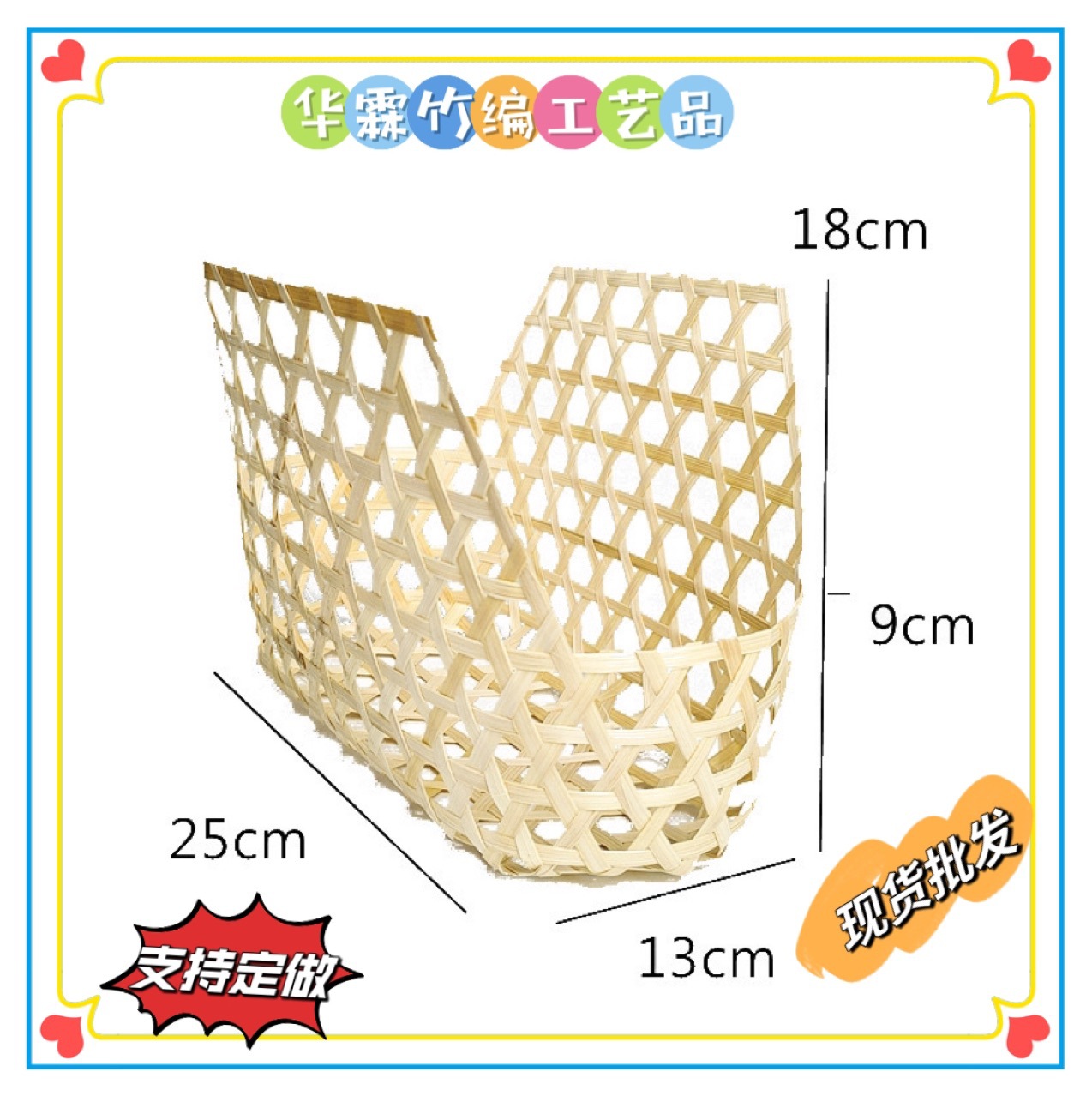 类别: 竹篮 适用场景: 通用 是否专利货源: 否 尺寸: 不带把手,带把手 适用送礼关系: 晚辈,夫妻,同事,长辈,孩子,恩师 送礼用途: 节庆礼品 是否属于礼品: 是,商务礼品 是否IP授权: 否 风格: 田园 重量: 1.0 kg/件