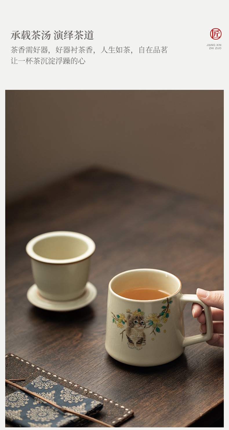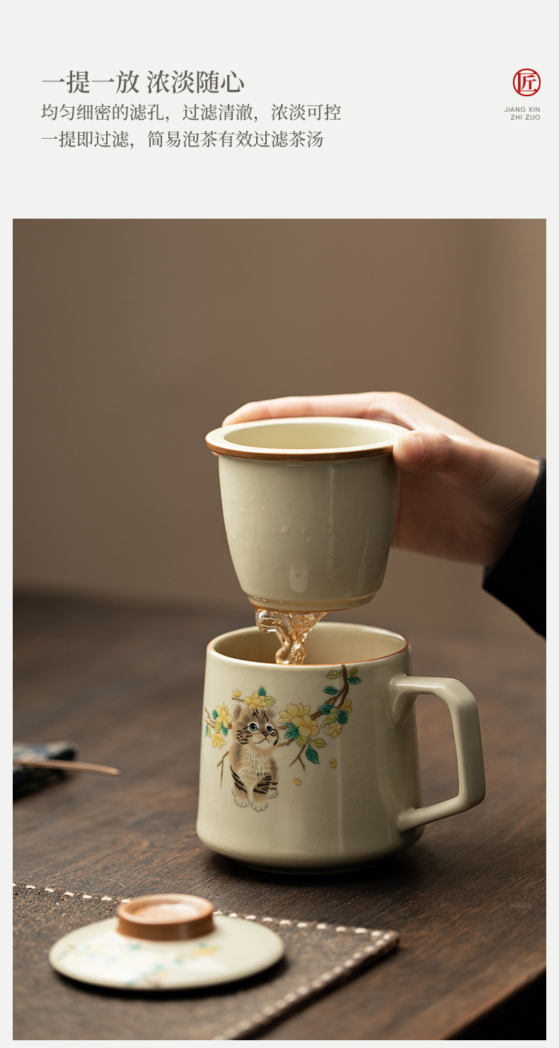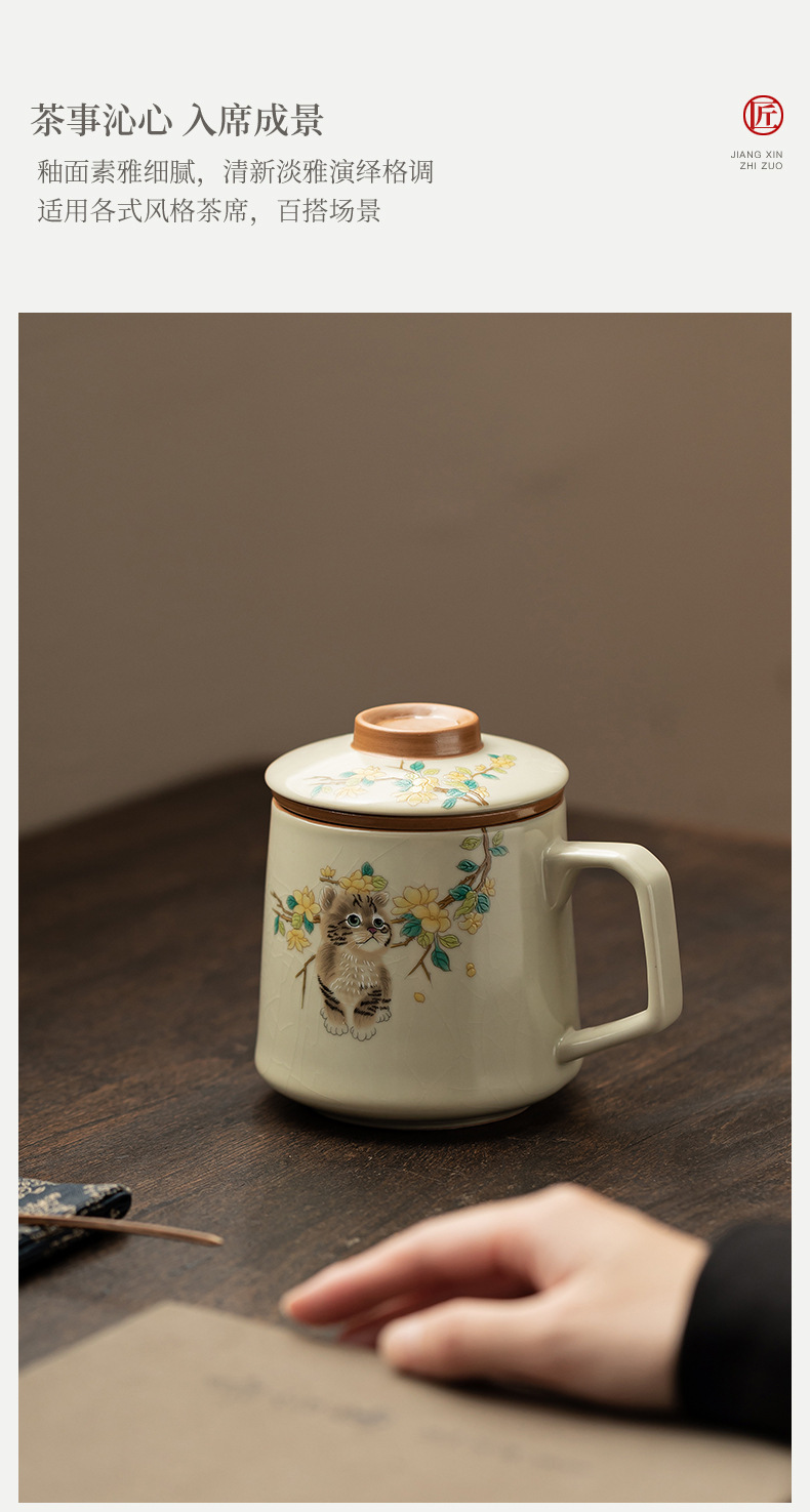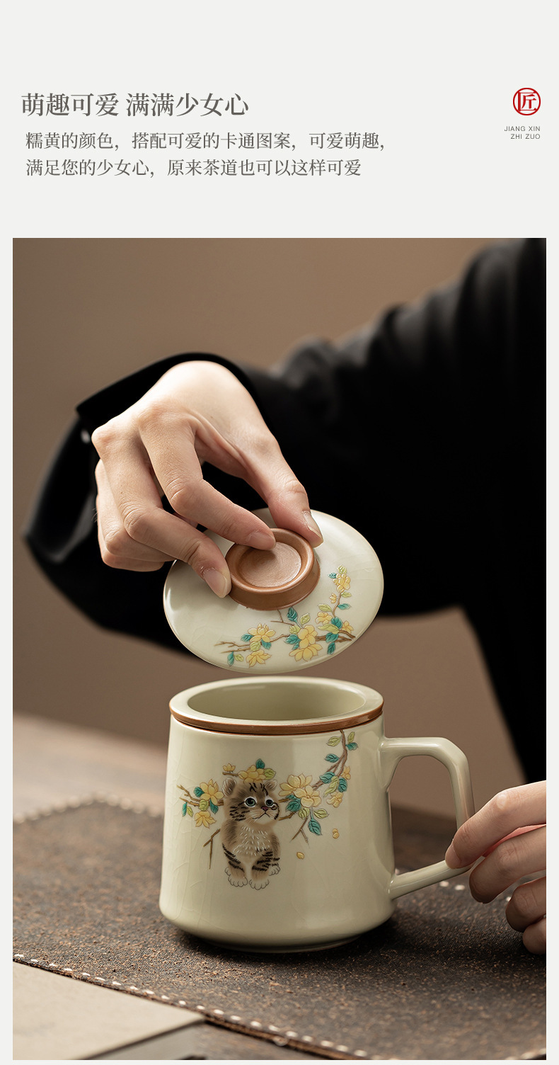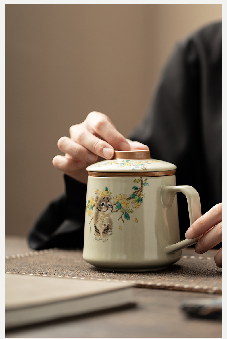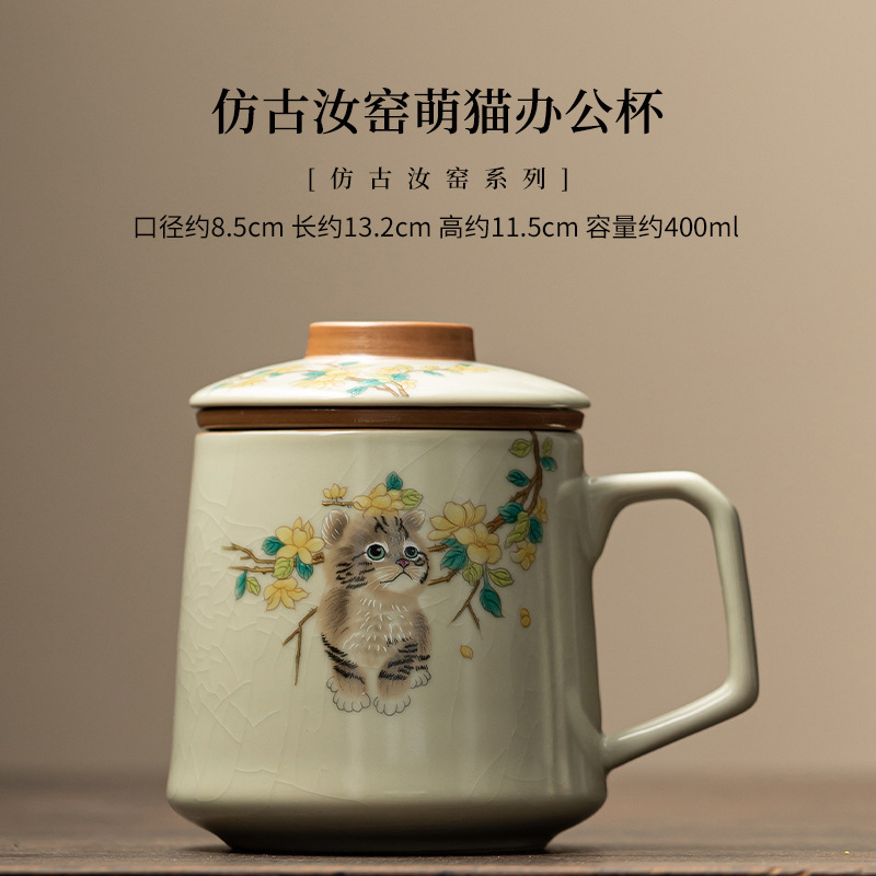 汝窑萌猫办公杯陶瓷可养茶具过滤泡茶杯水杯家用个人杯带盖马克杯