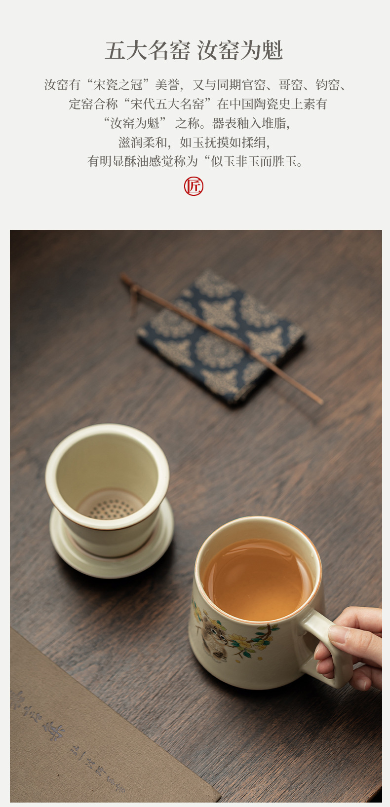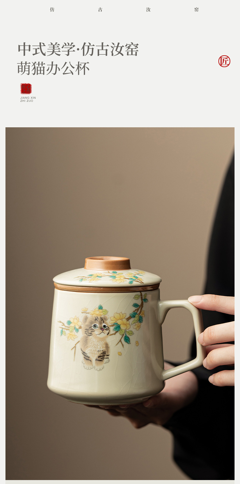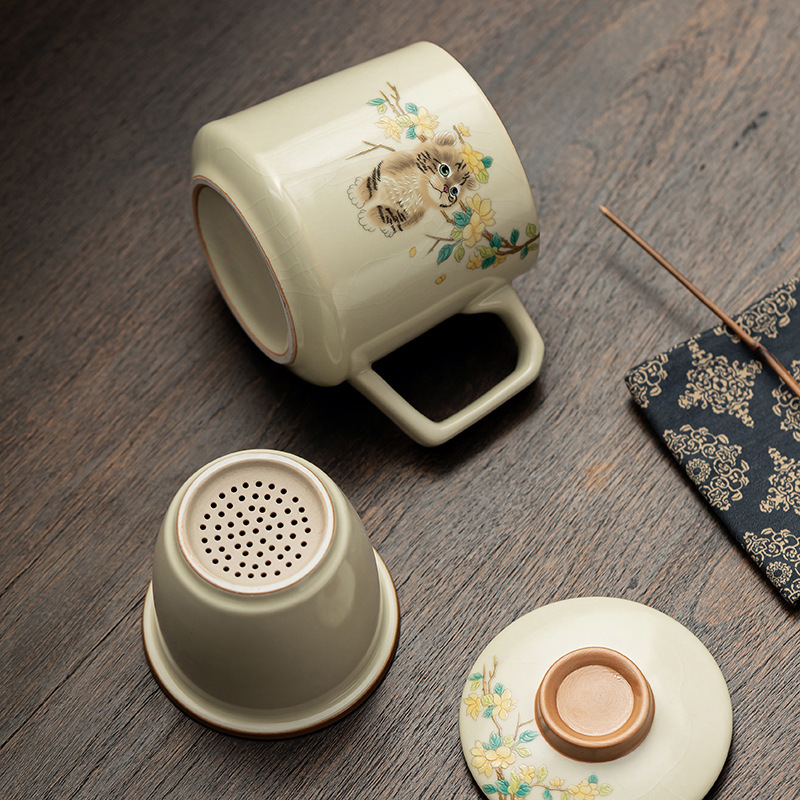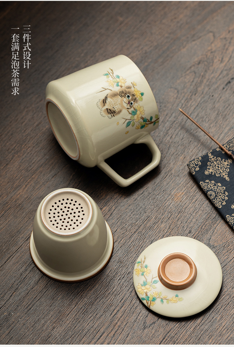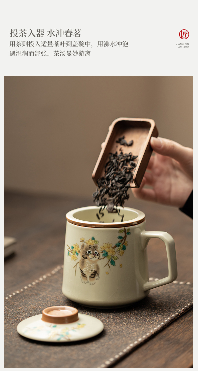 汝窑萌猫办公杯陶瓷可养茶具过滤泡茶杯水杯家用个人杯带盖马克杯