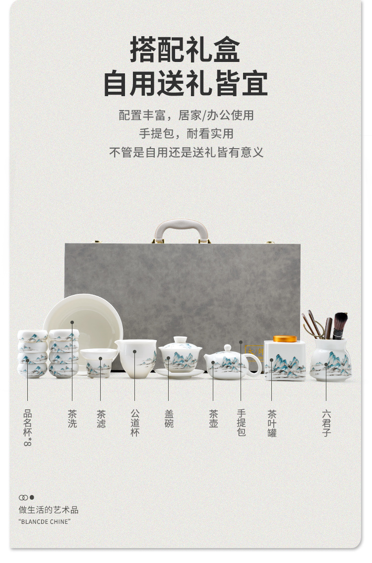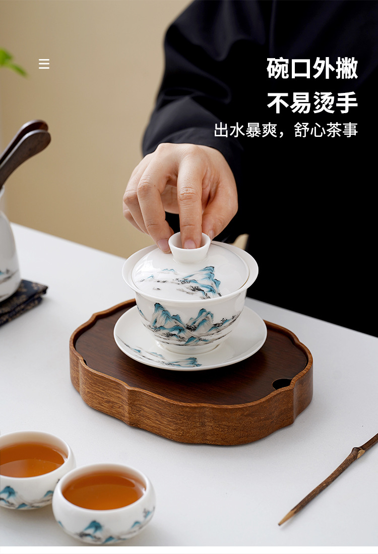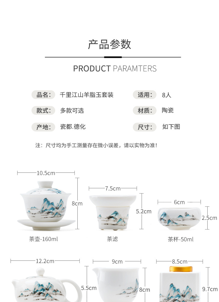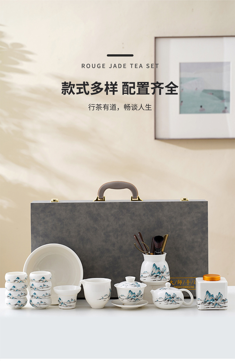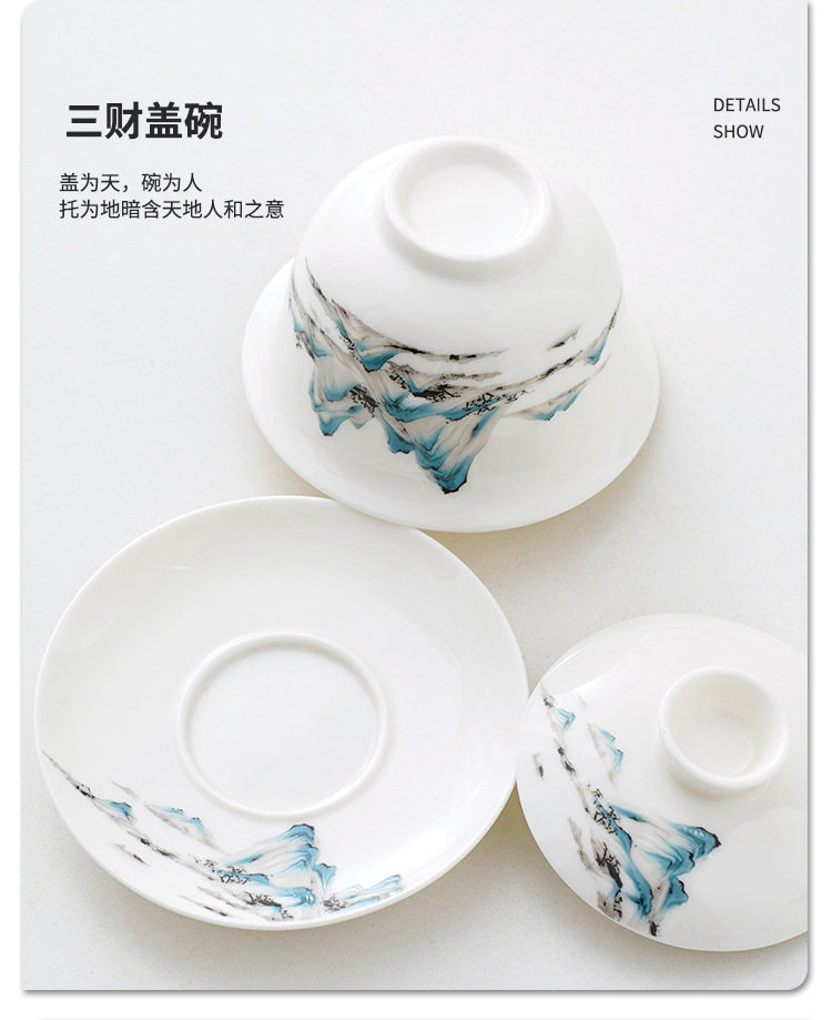 中式千里江山茶具套装羊脂玉家用高档白瓷盖碗茶壶功夫茶杯礼盒装
