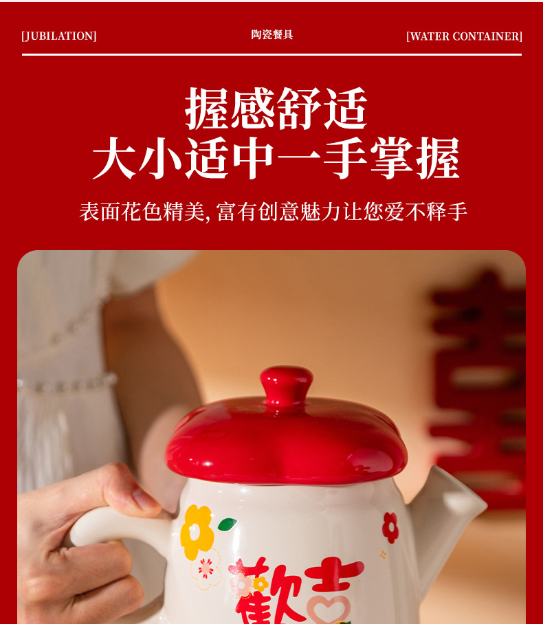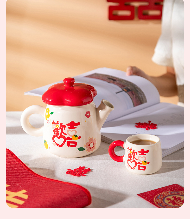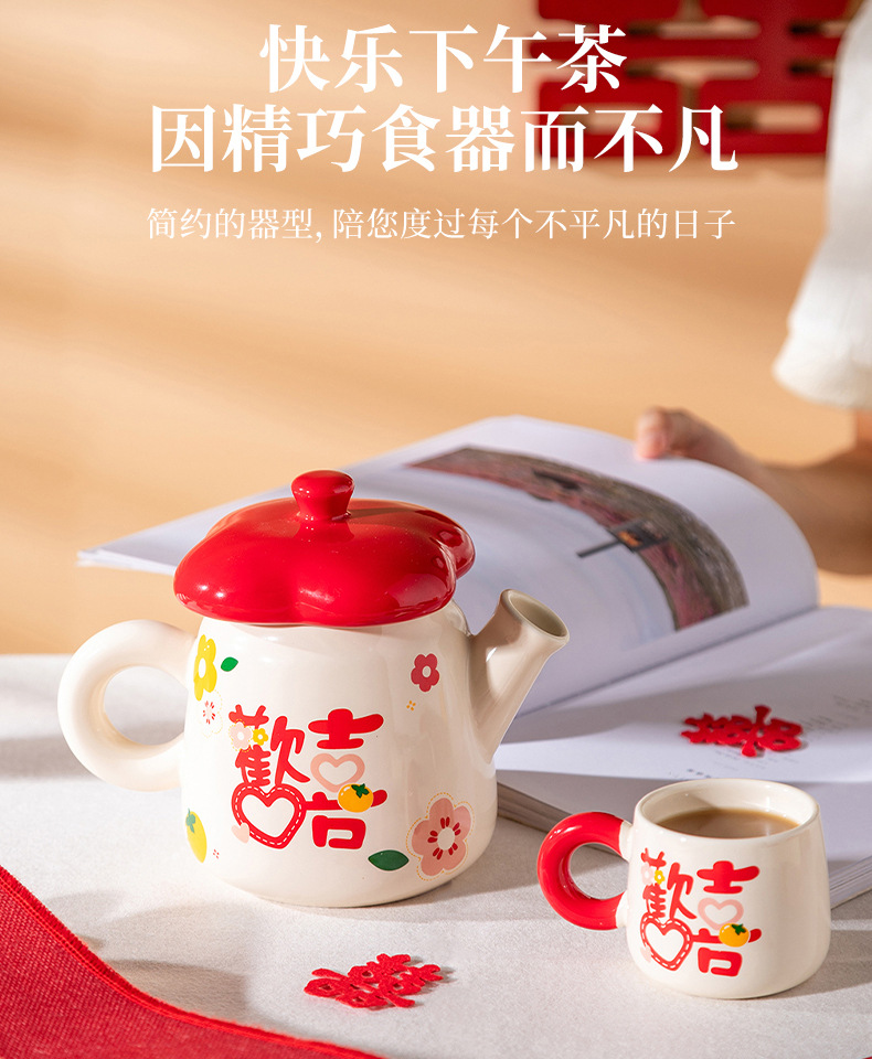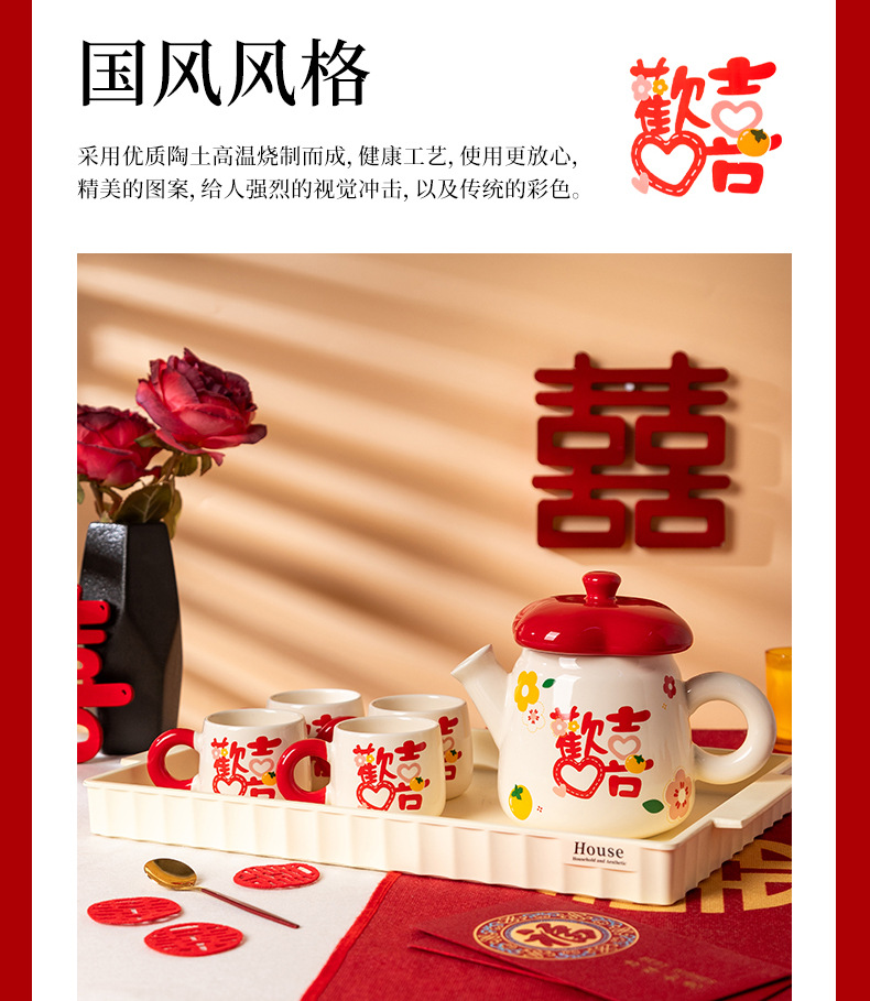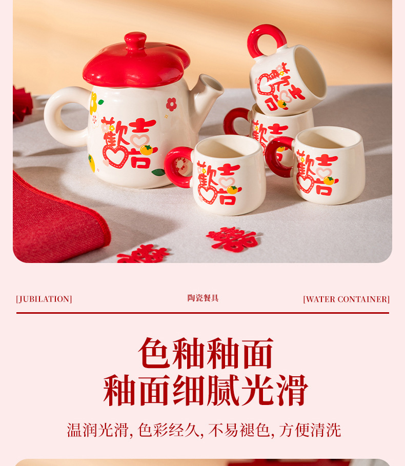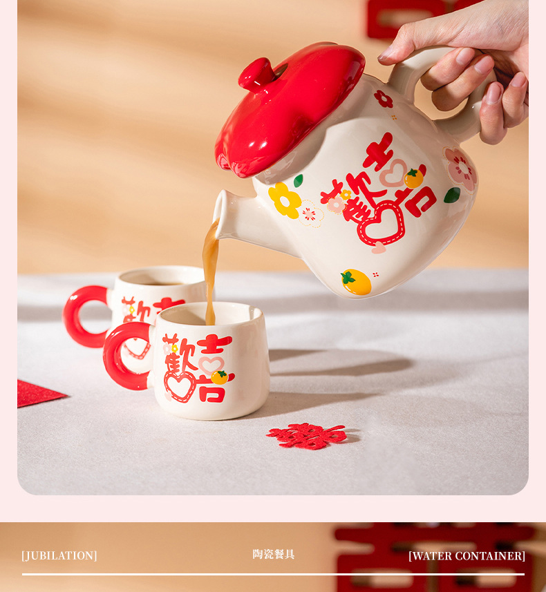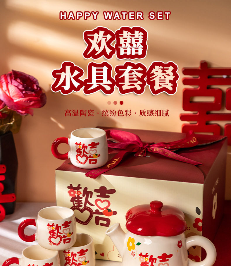 欢喜陶瓷茶具套装花茶壶家用水杯礼盒婚庆喜庆乔迁伴手礼陶瓷水具