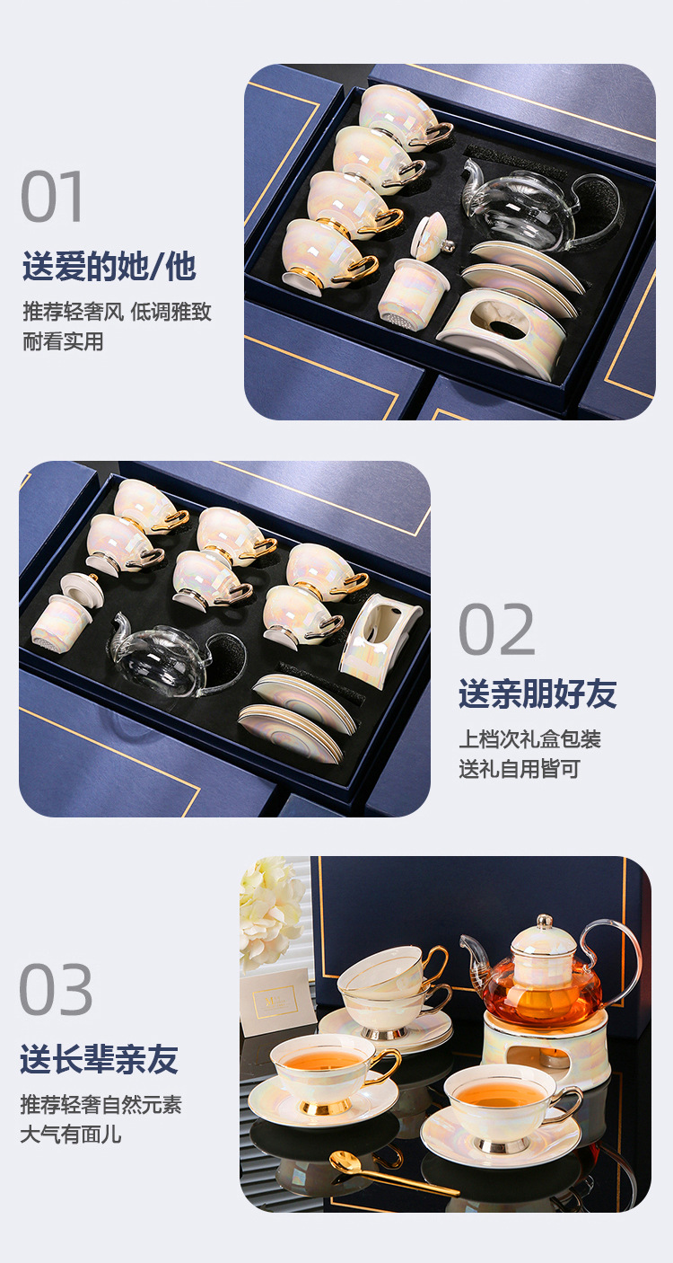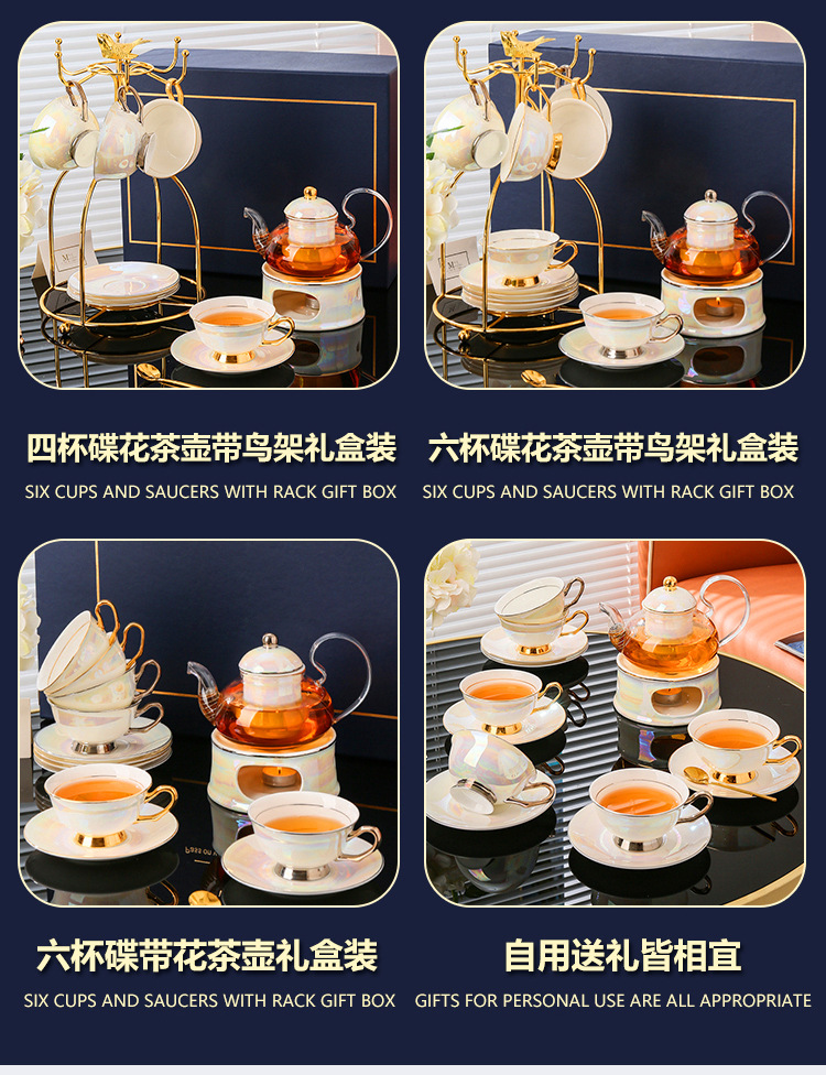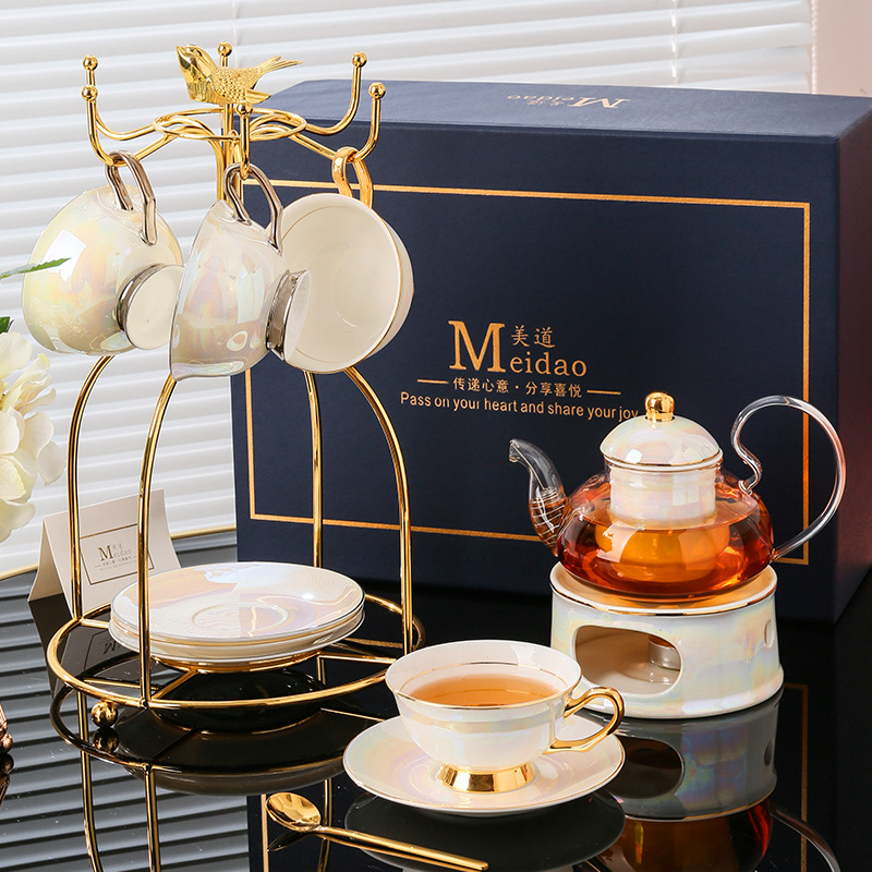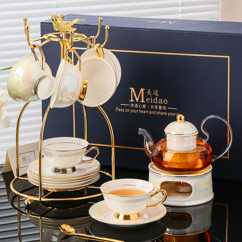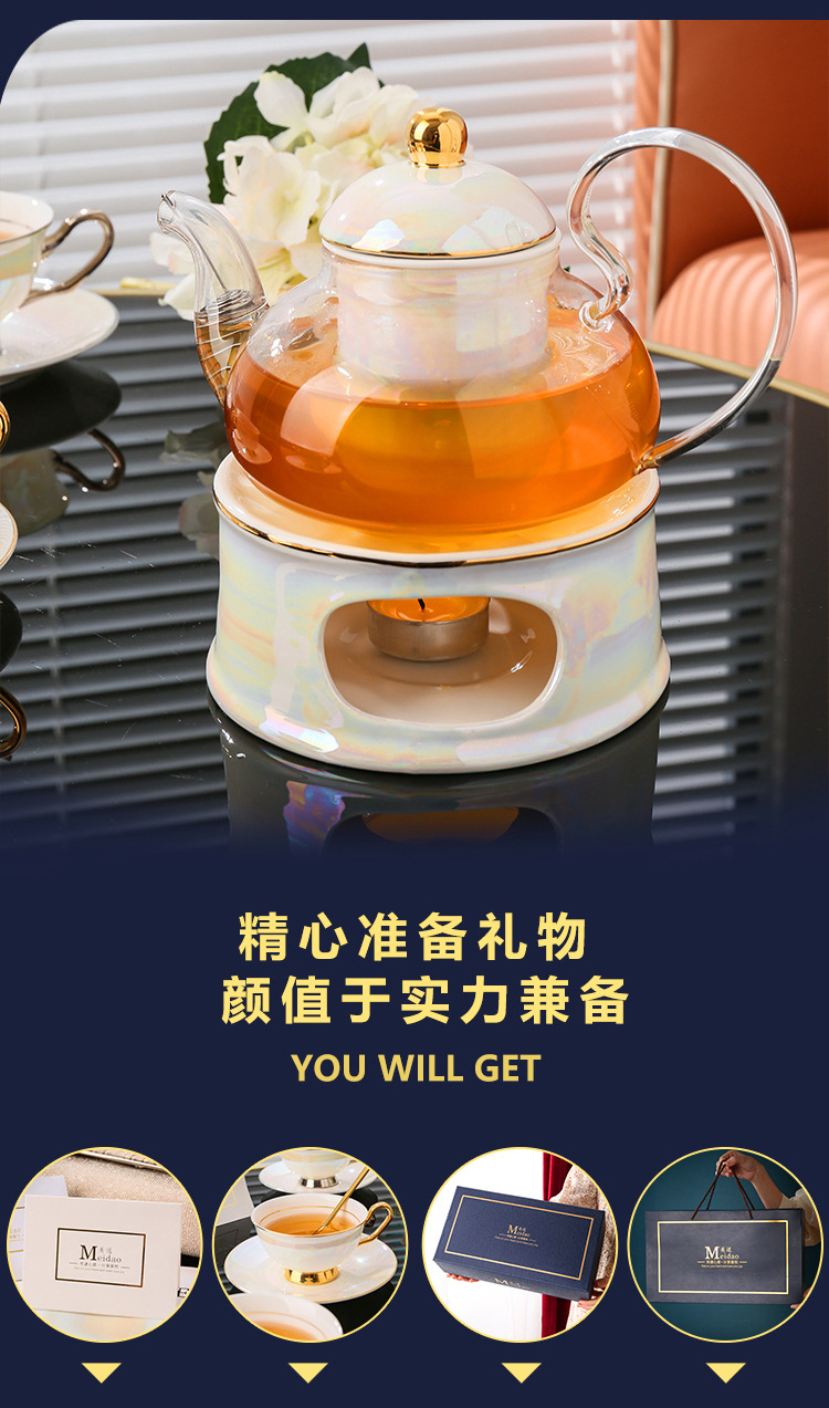 美道 金银河 玻璃泡茶壶蜡烛加热煮茶下午茶茶具套装骨瓷花茶杯