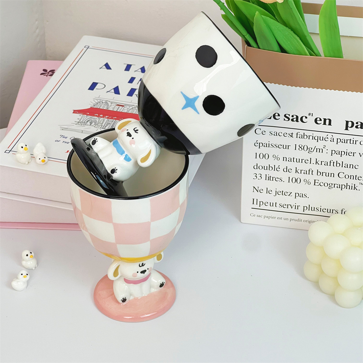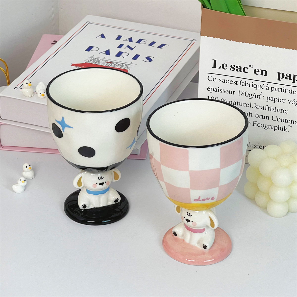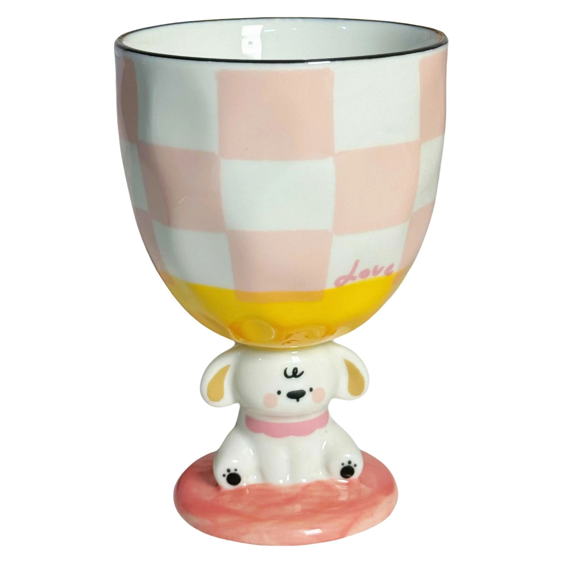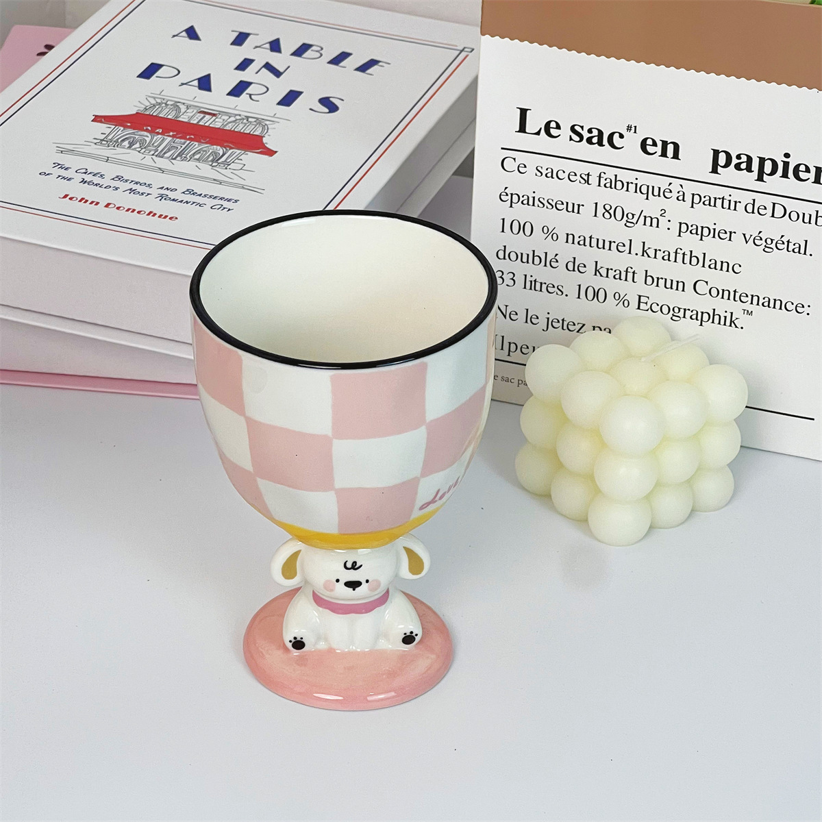 个性创意手绘小狗粉色陶瓷杯复古波点高脚杯家用水杯子实用伴手礼