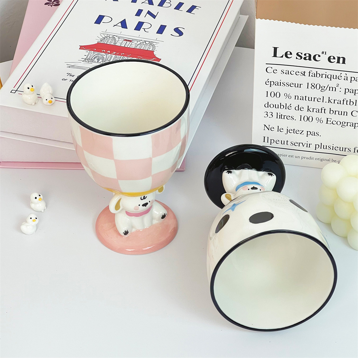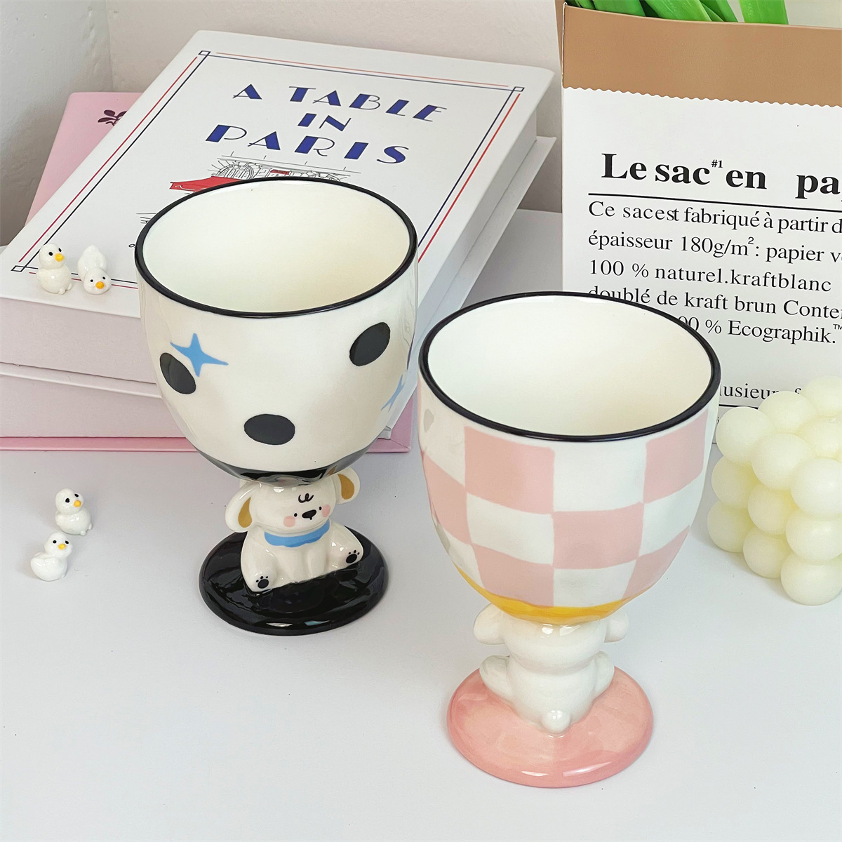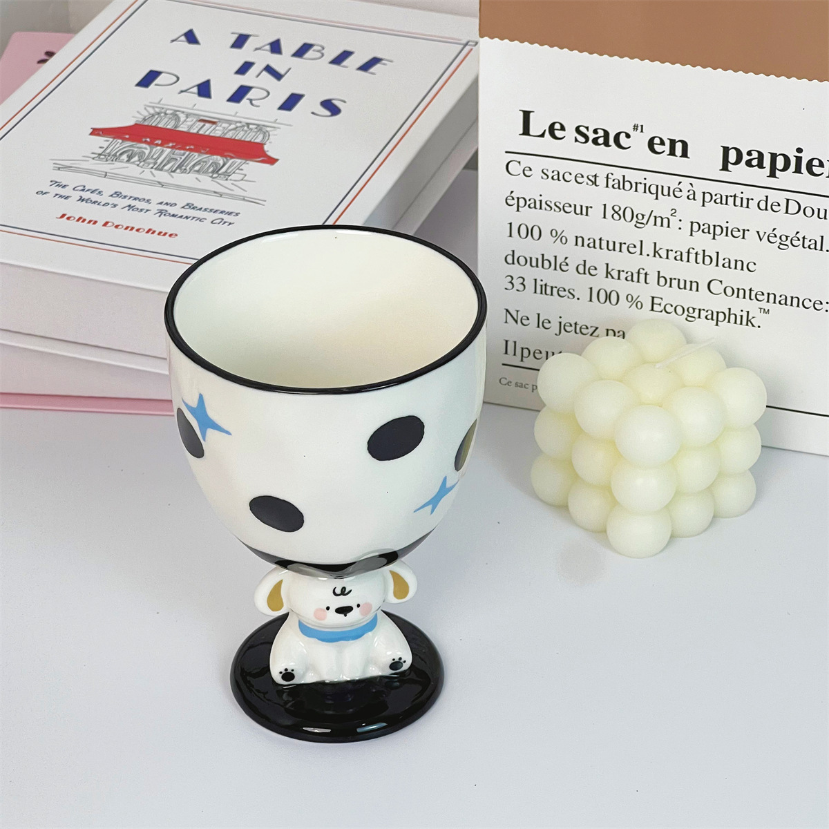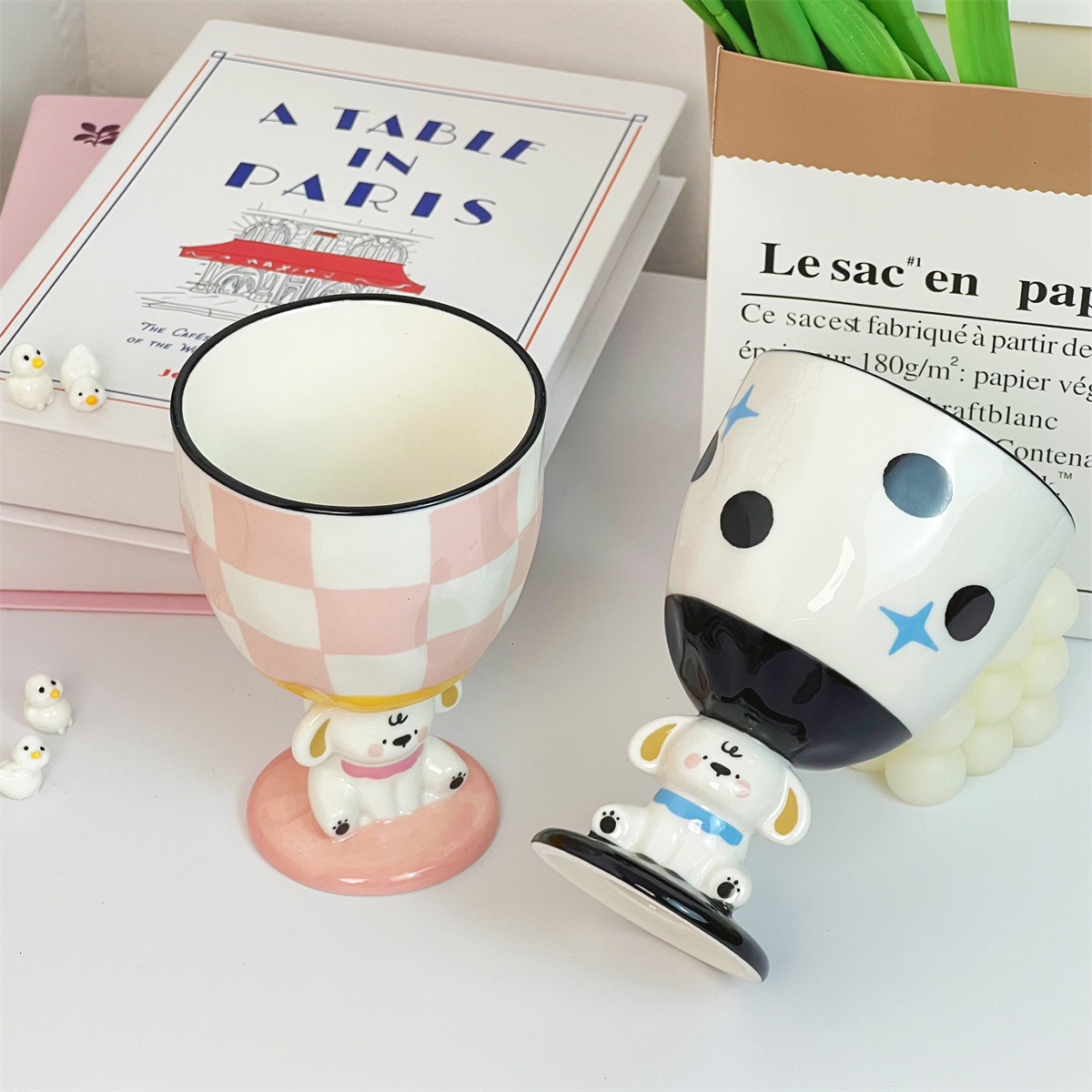 个性创意手绘小狗粉色陶瓷杯复古波点高脚杯家用水杯子实用伴手礼