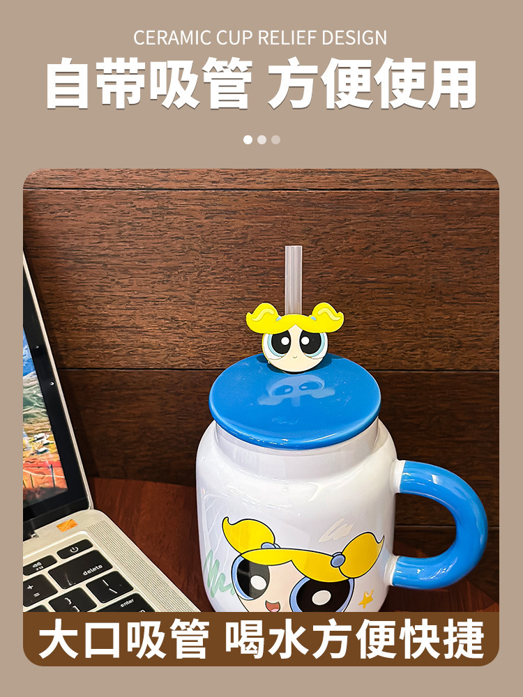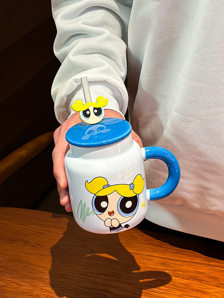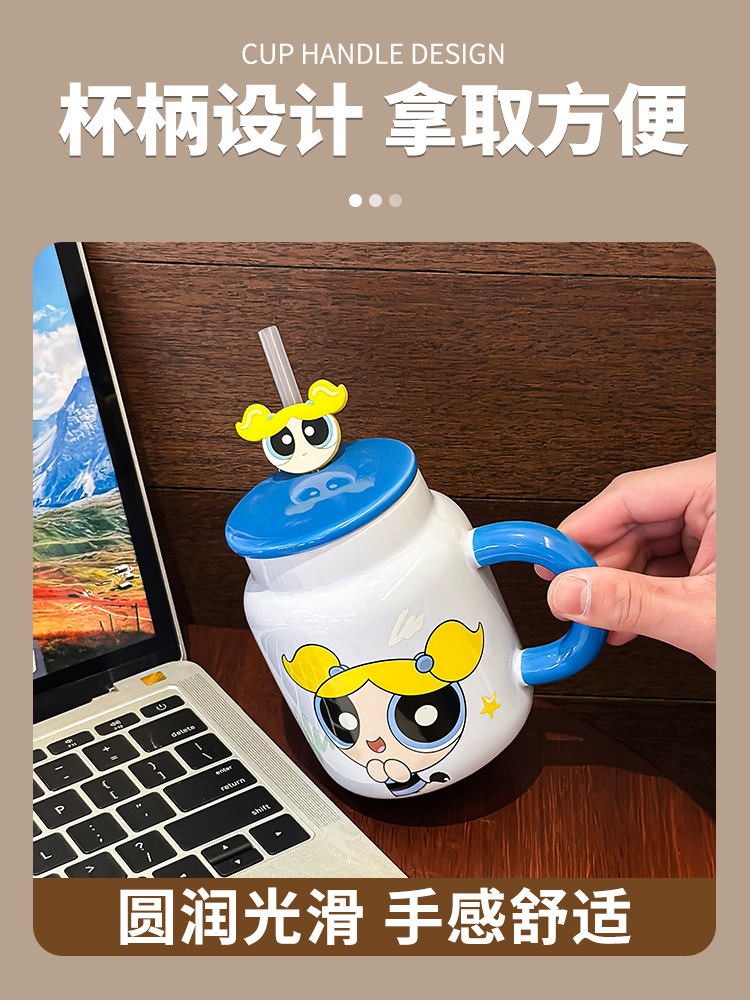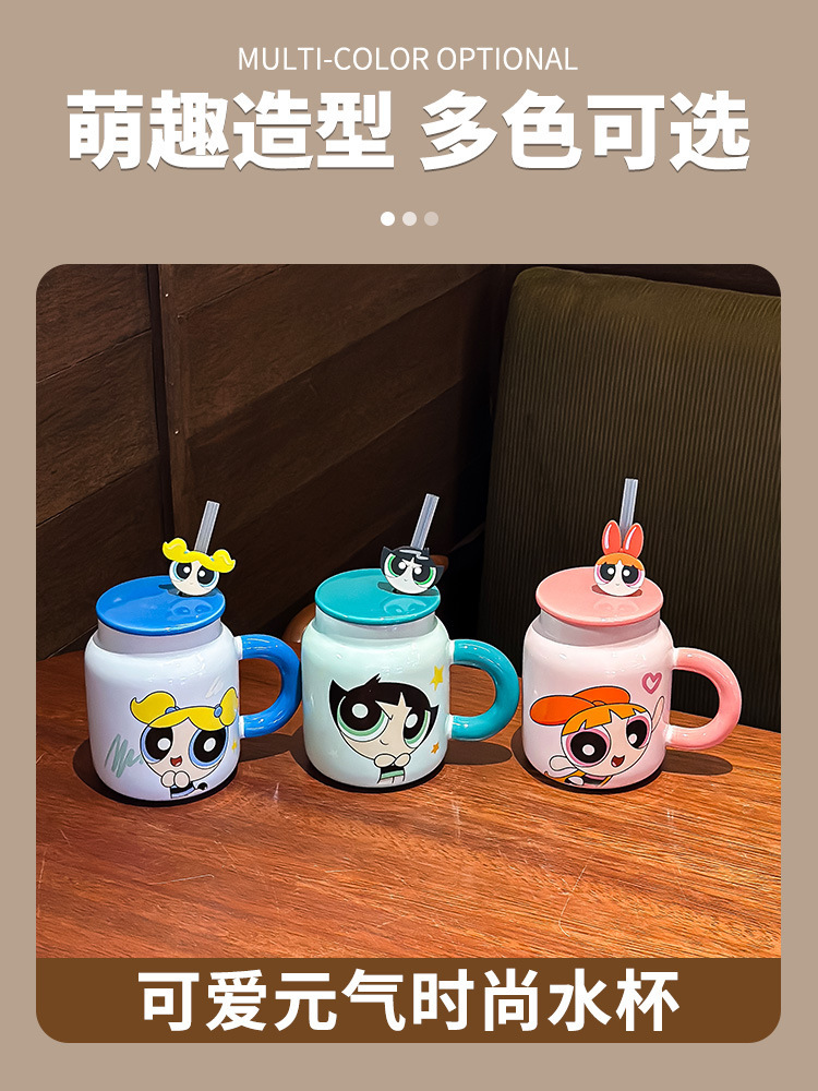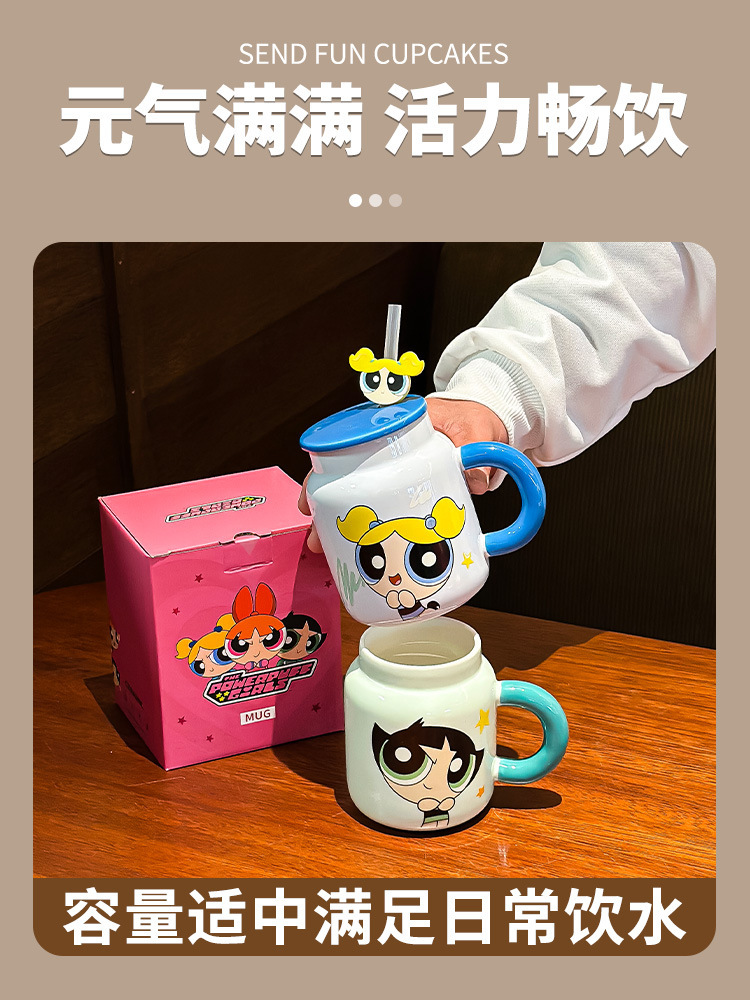 飞天小女警新款可爱带盖陶瓷马克杯家用咖啡杯情侣生日礼物牛奶杯