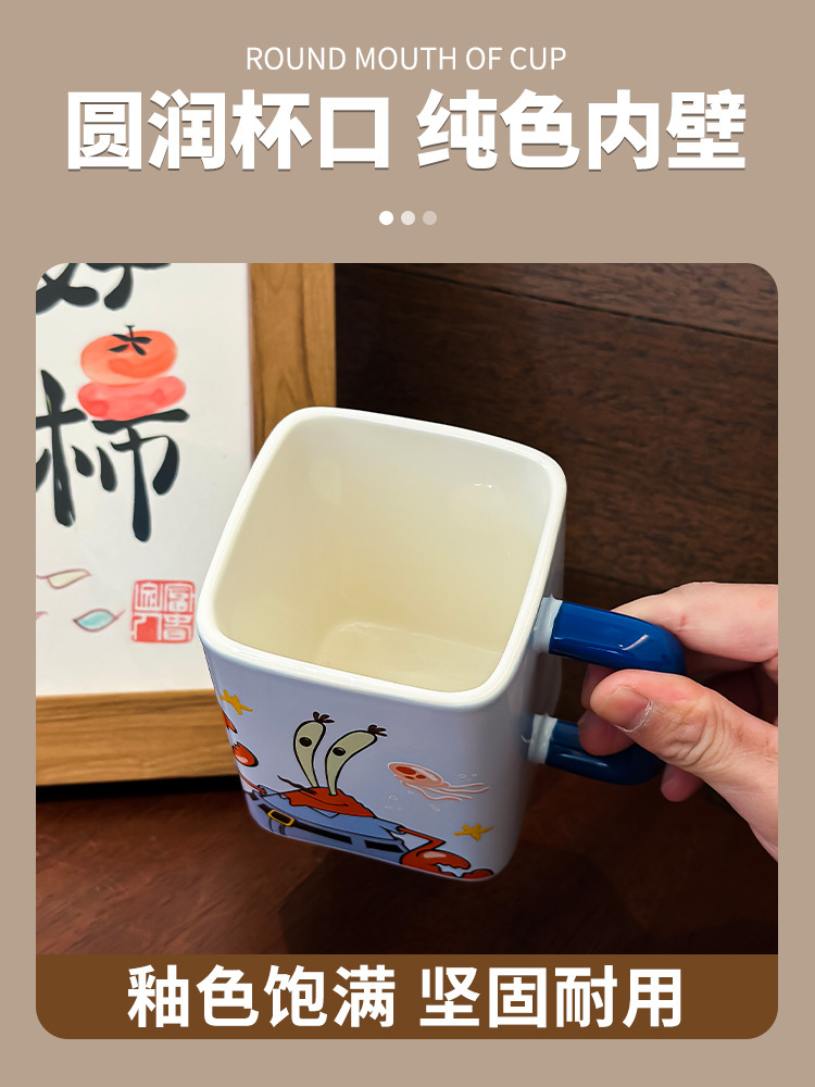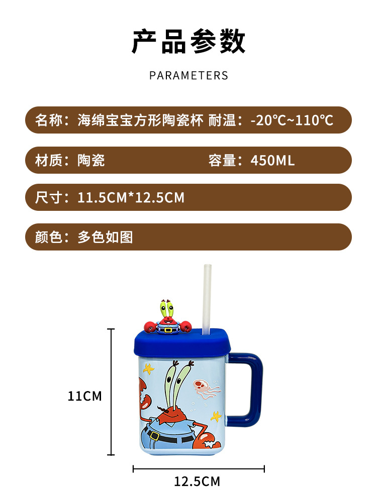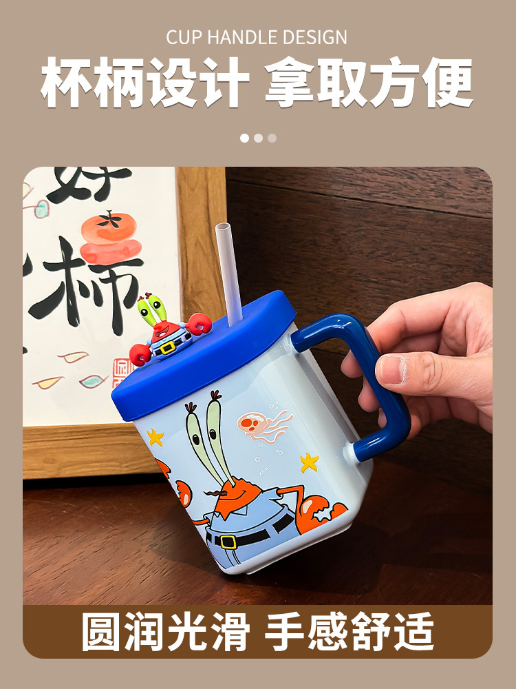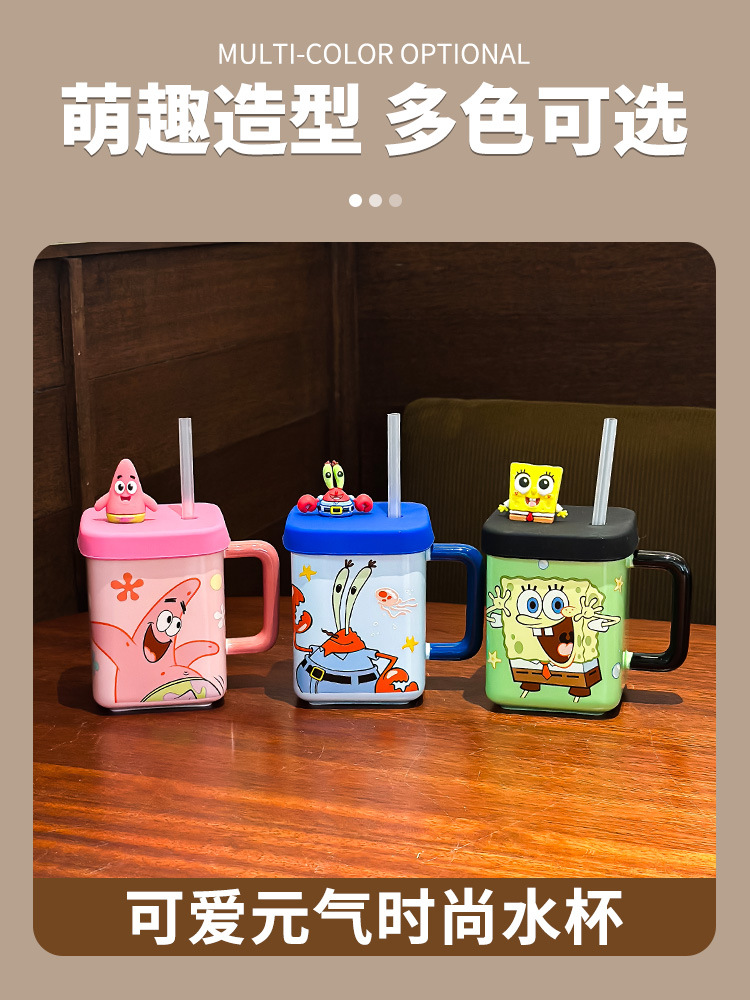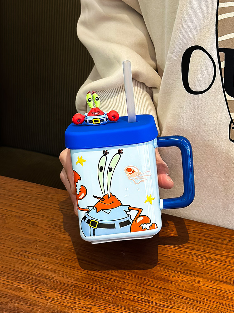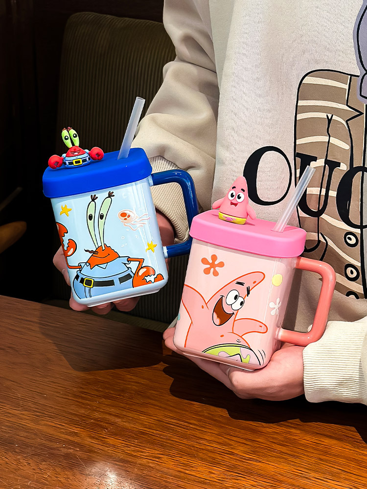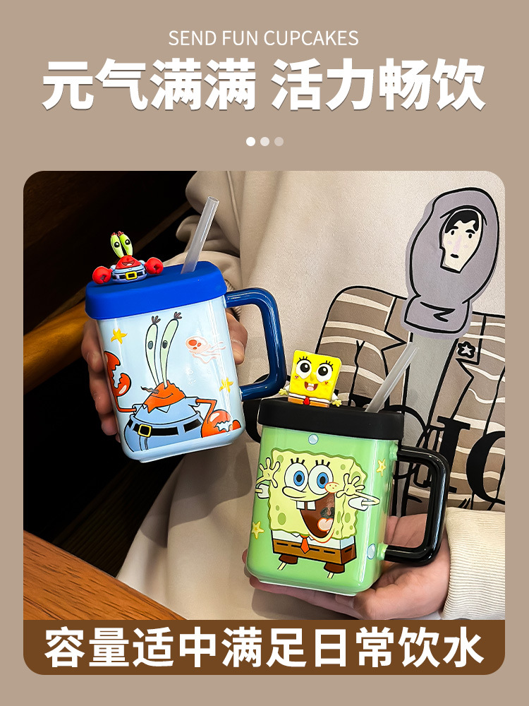 海绵宝宝可克杯带盖情侣水杯子生日礼物杯子女生带吸管陶瓷杯