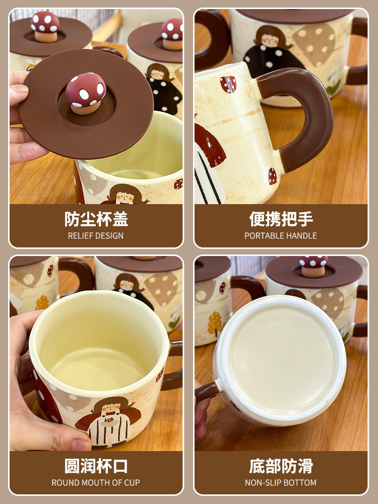 复古蘑菇女孩杯子马克杯带盖可爱水杯家用陶瓷杯女生早餐杯咖啡杯 投诉
