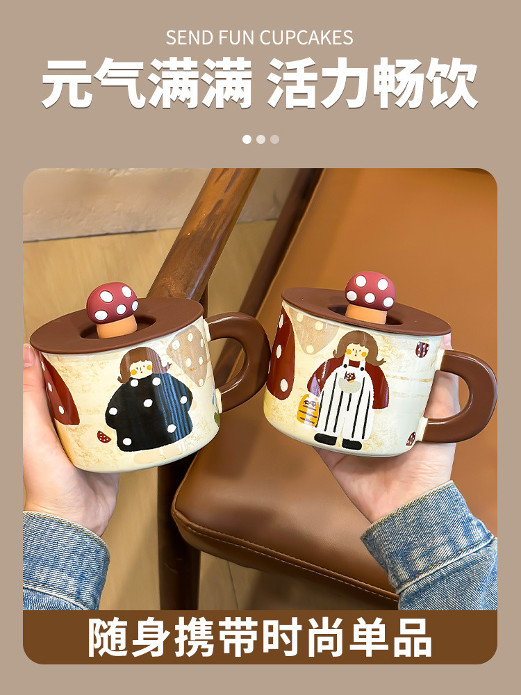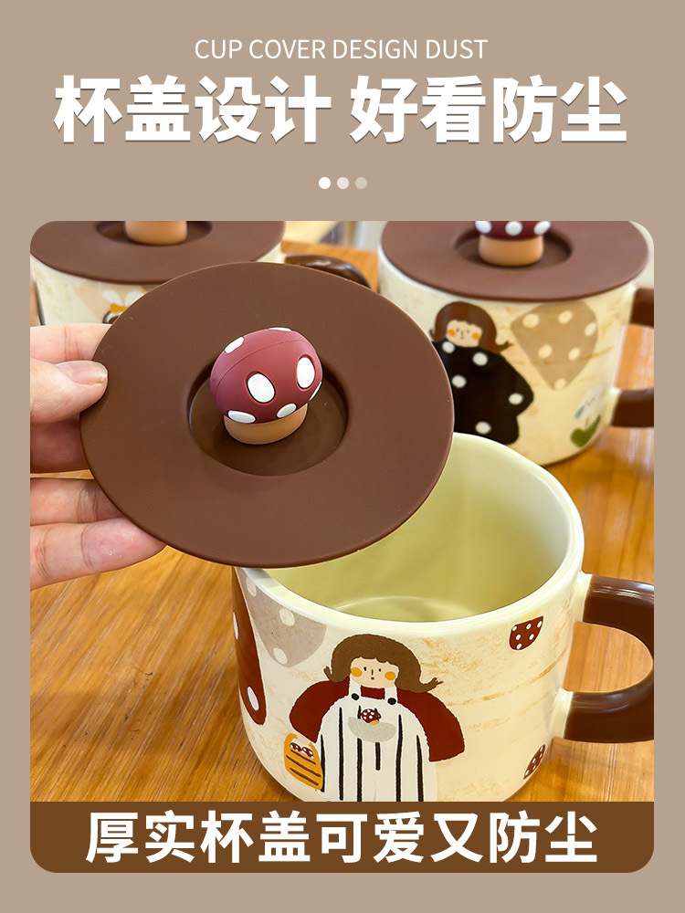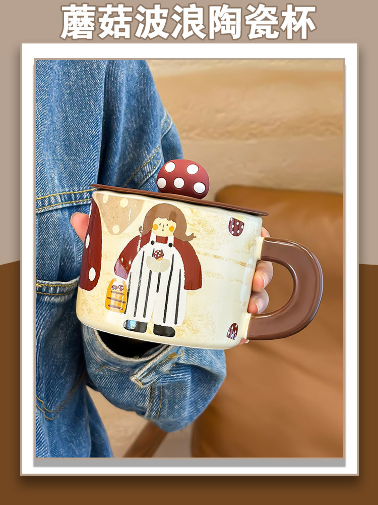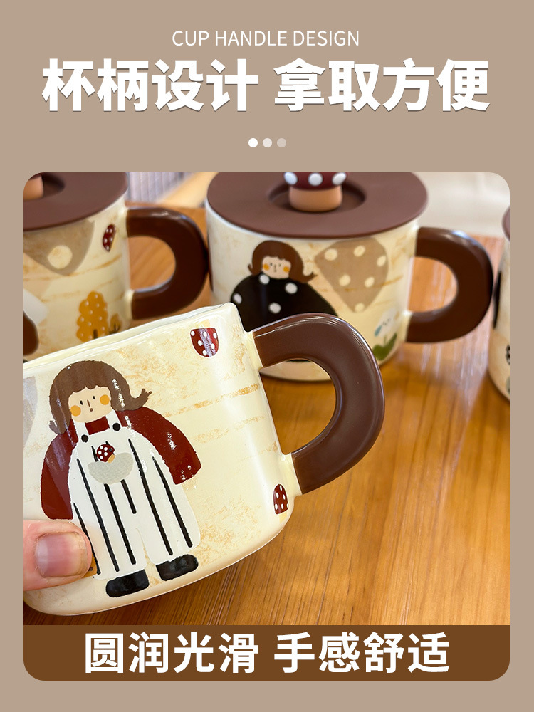 复古蘑菇女孩杯子马克杯带盖可爱水杯家用陶瓷杯女生早餐杯咖啡杯