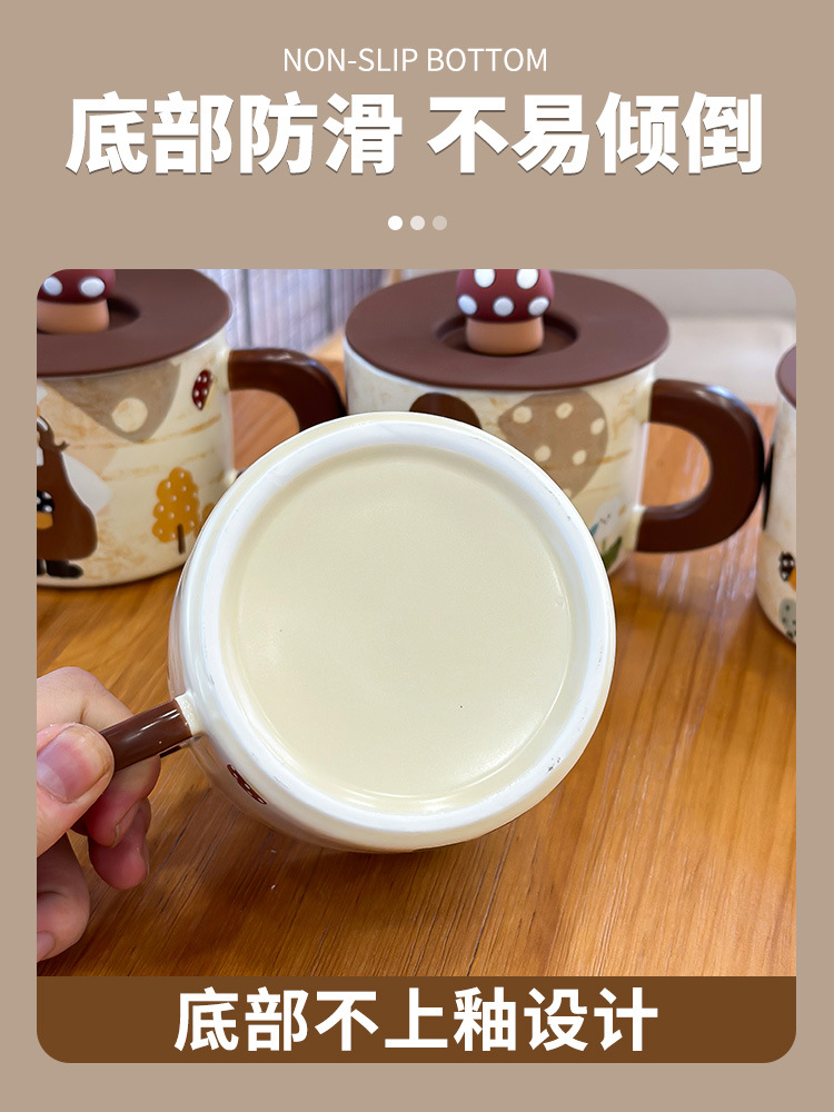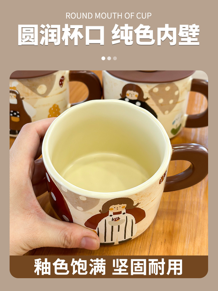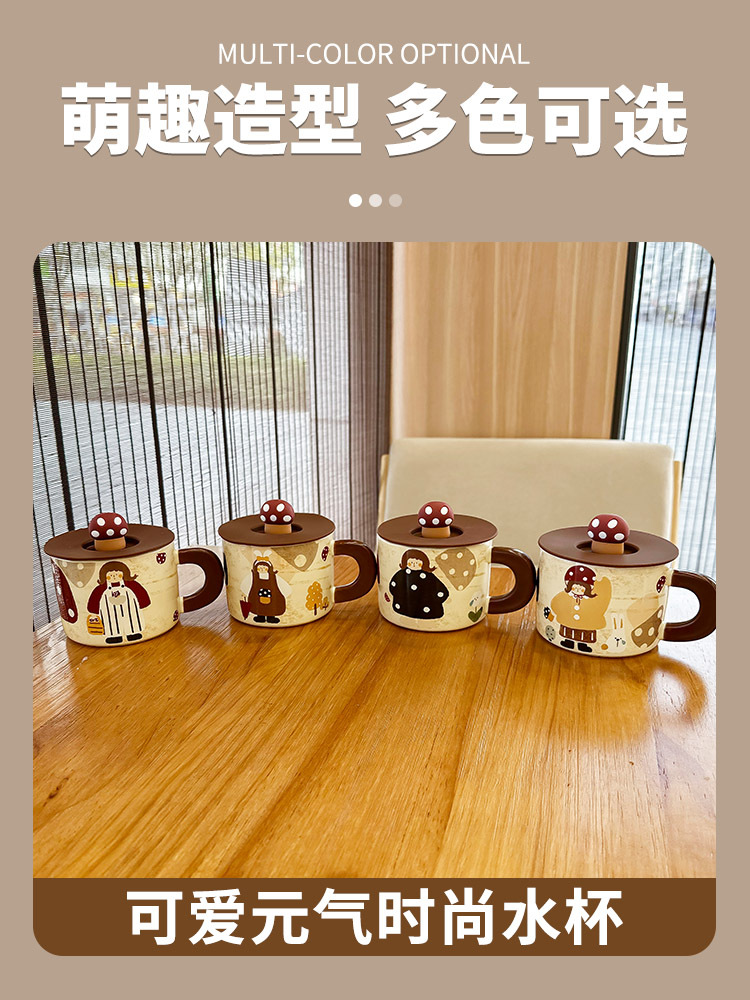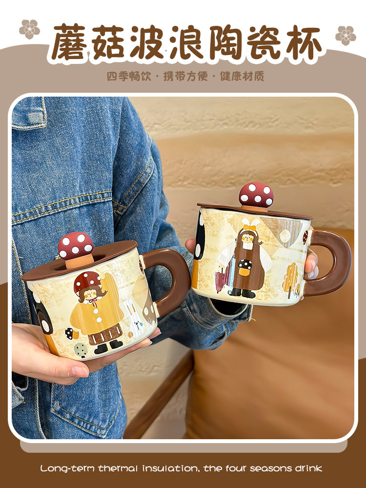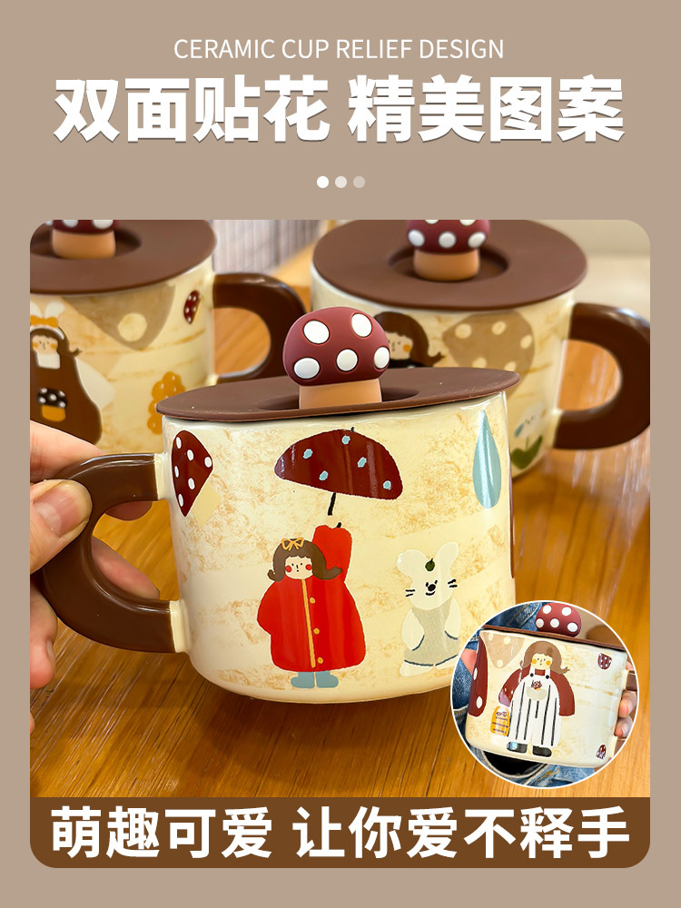复古蘑菇女孩杯子马克杯带盖可爱水杯家用陶瓷杯女生早餐杯咖啡杯