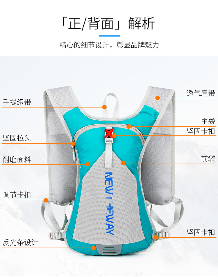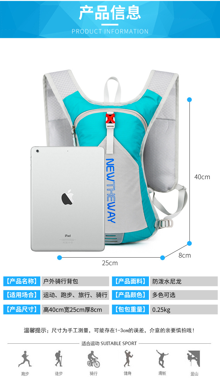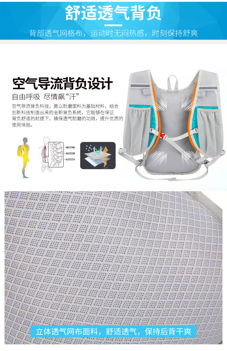 材质: 涤纶 货号: VV085 适用性别: 中性/男女均可 功能: 透气,防水 颜色: 黑色,绿色,桔色,深蓝色,浅蓝色 容量: 20L以下 上市年份季节: 2021年秋季 适用场景: 户外运动 图案: 字母 里料质地: 涤纶 重量: 1.0 kg/个