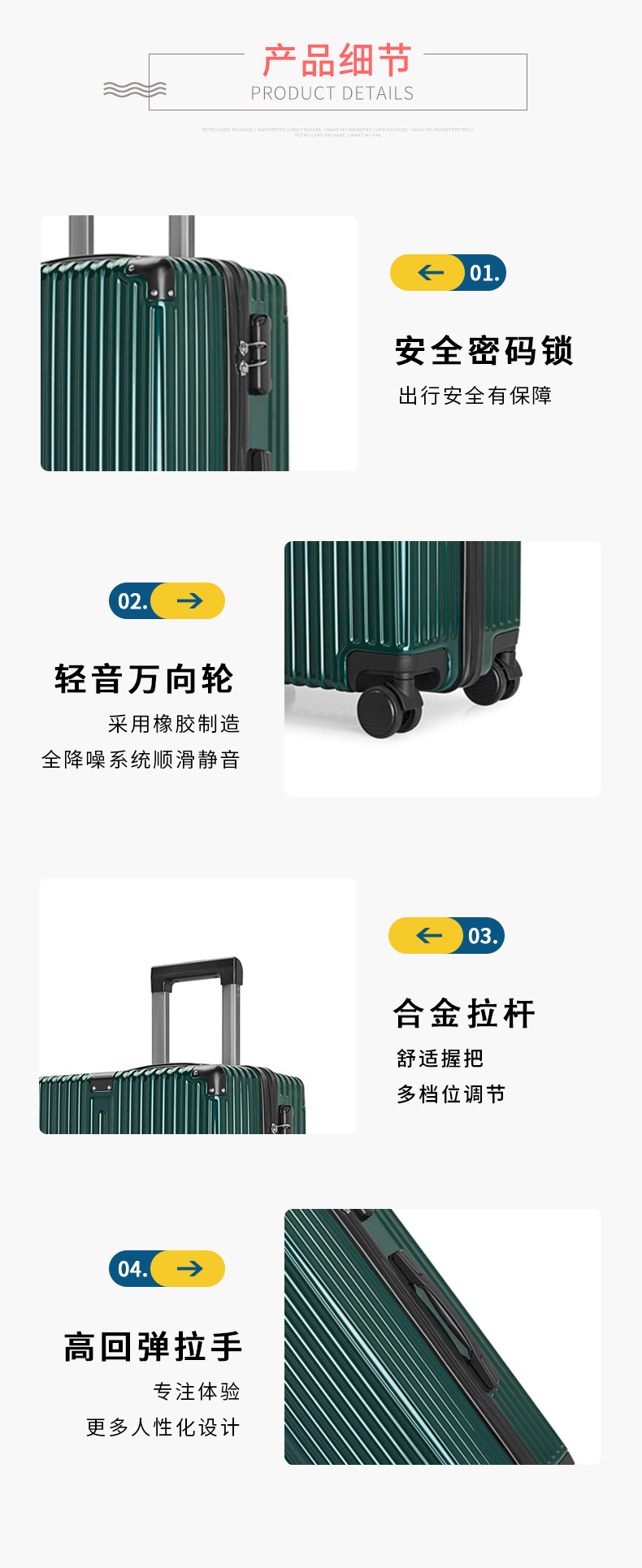 | 长*宽*高(不含轮子) | 35*23*54CM | 41*27*64CM | 44*29*69CM | 48*31*74CM |