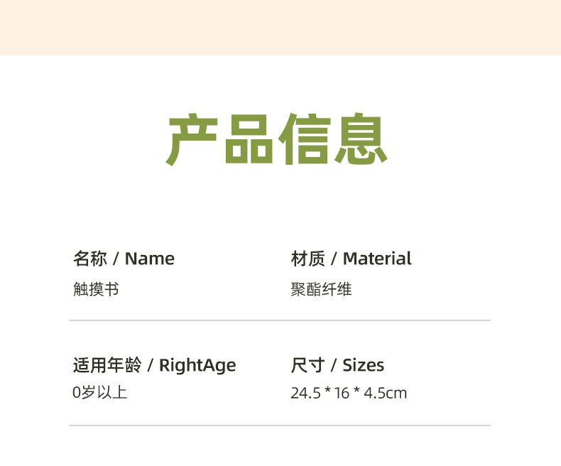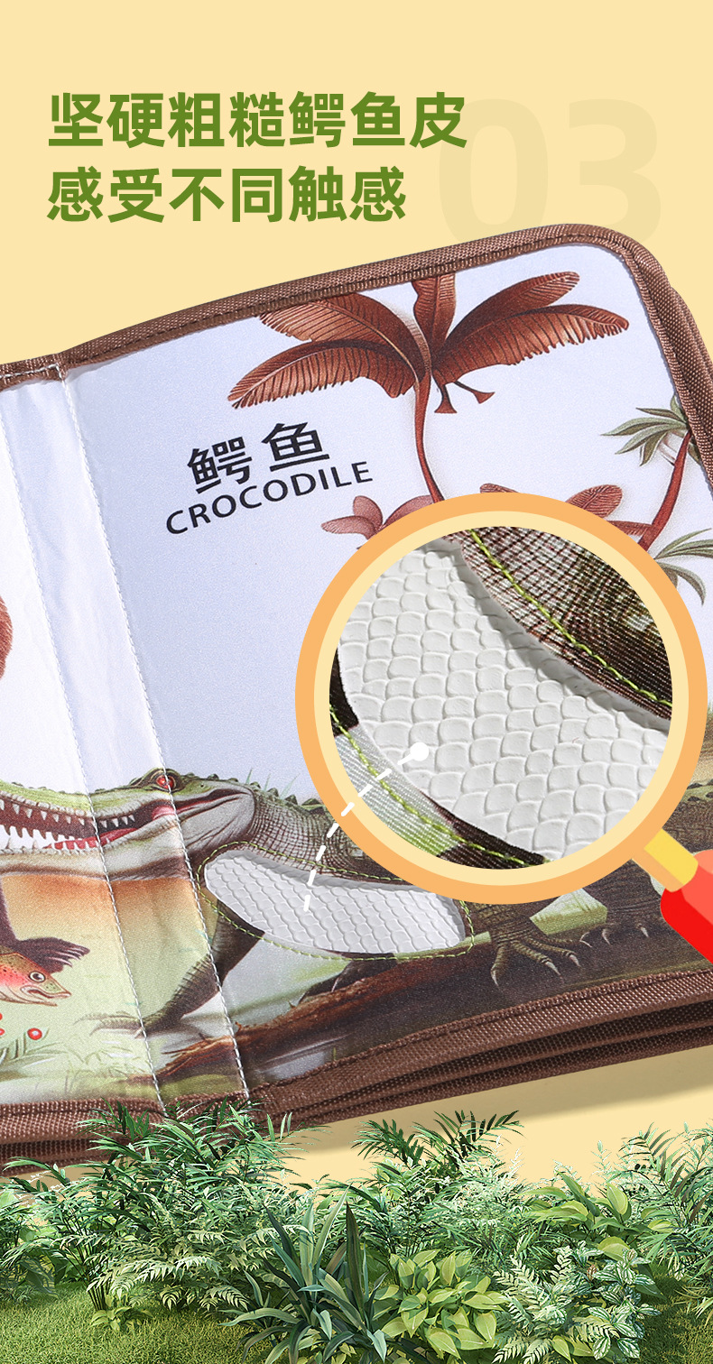 材质: 布制 功能: 其他 产地: 广东省 品牌: 皇儿 货号: A5-DAC43 产品类别: 动物触摸书 规格: 见详情 是否电动: 否 是否多功能: 是 是否能够DIY: 否 重量: 0.5 kg/个